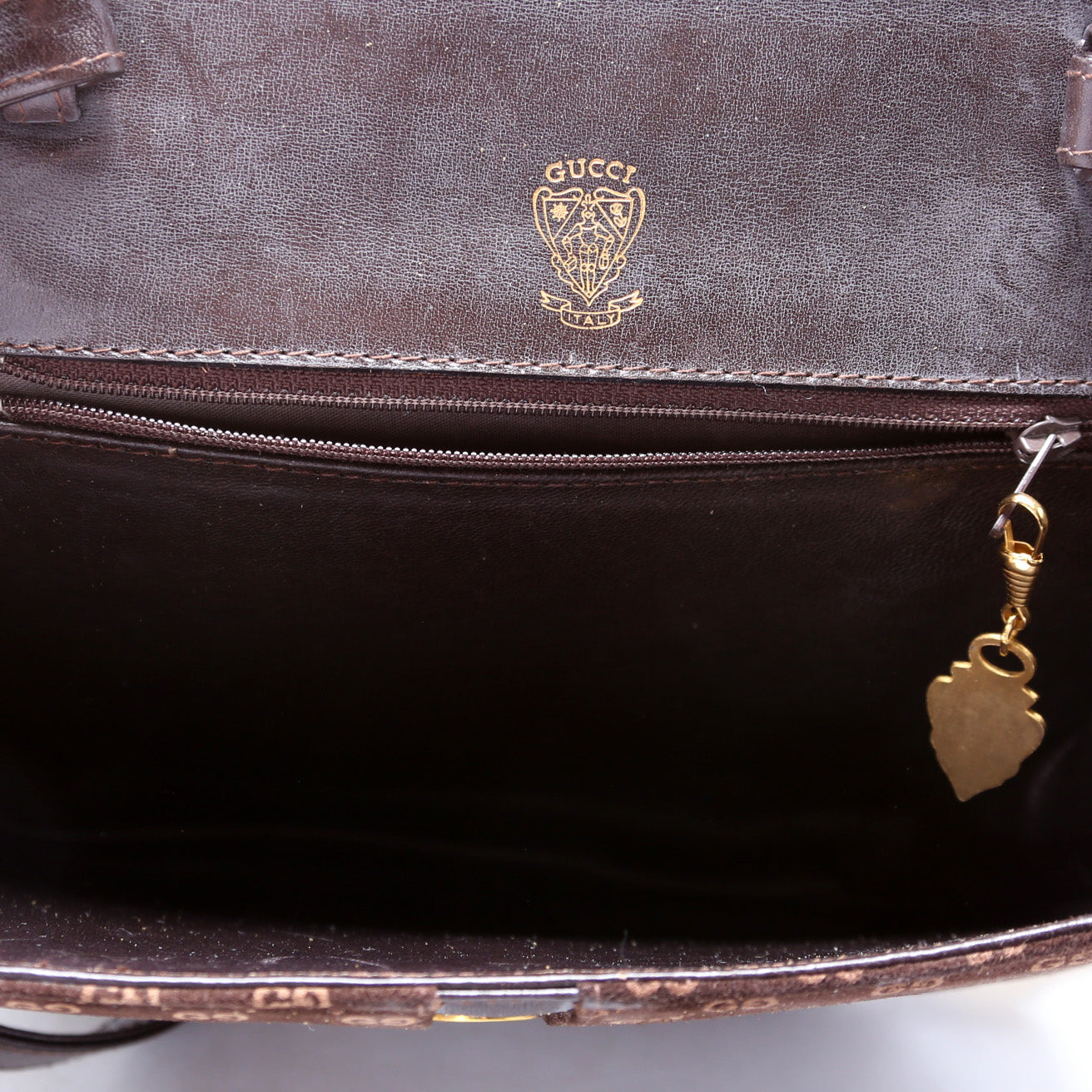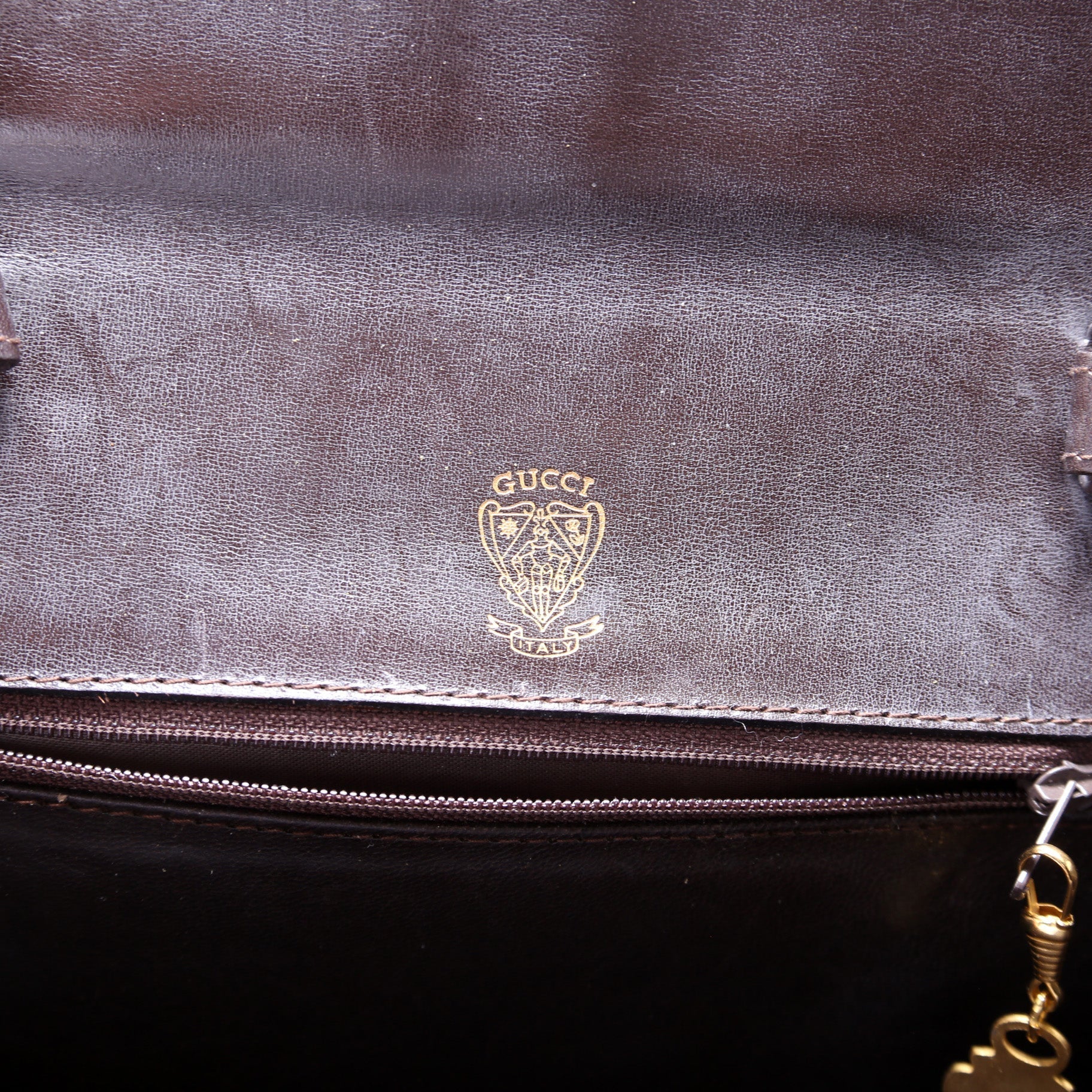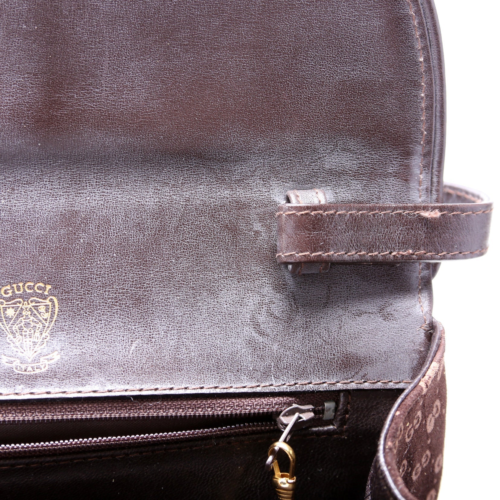 Interior: The interior is free of rips or tears. There is discoloration and scuffing throughout. The interior features one zip pocket.