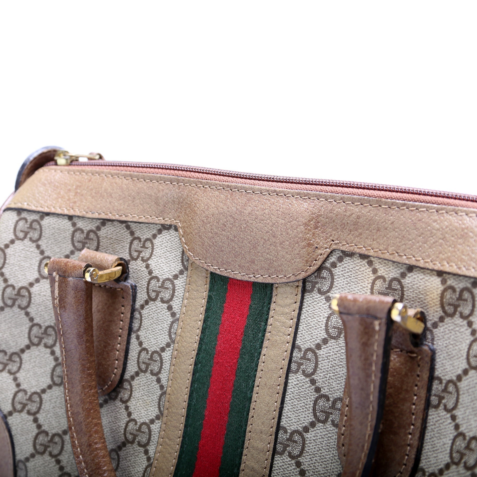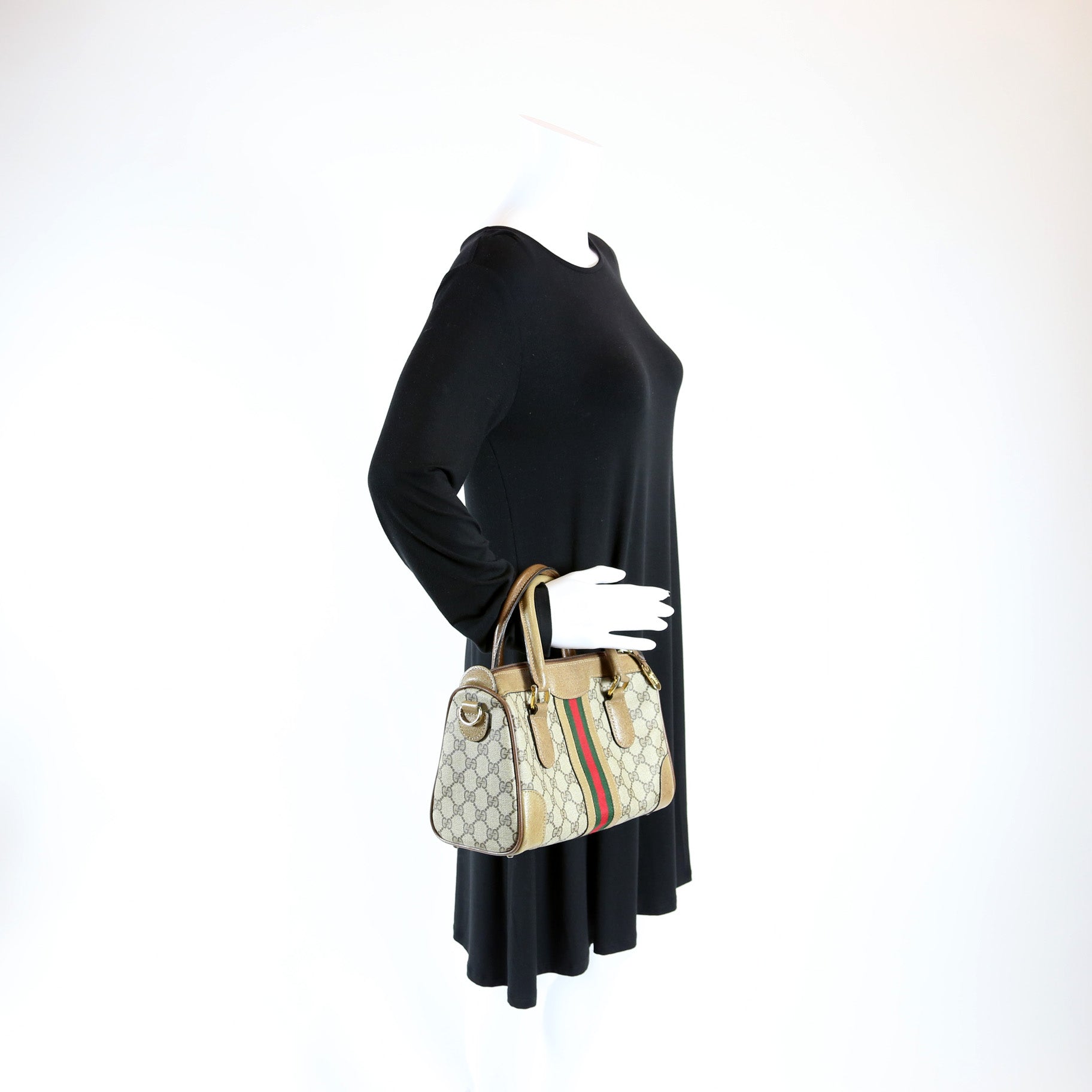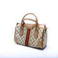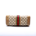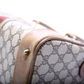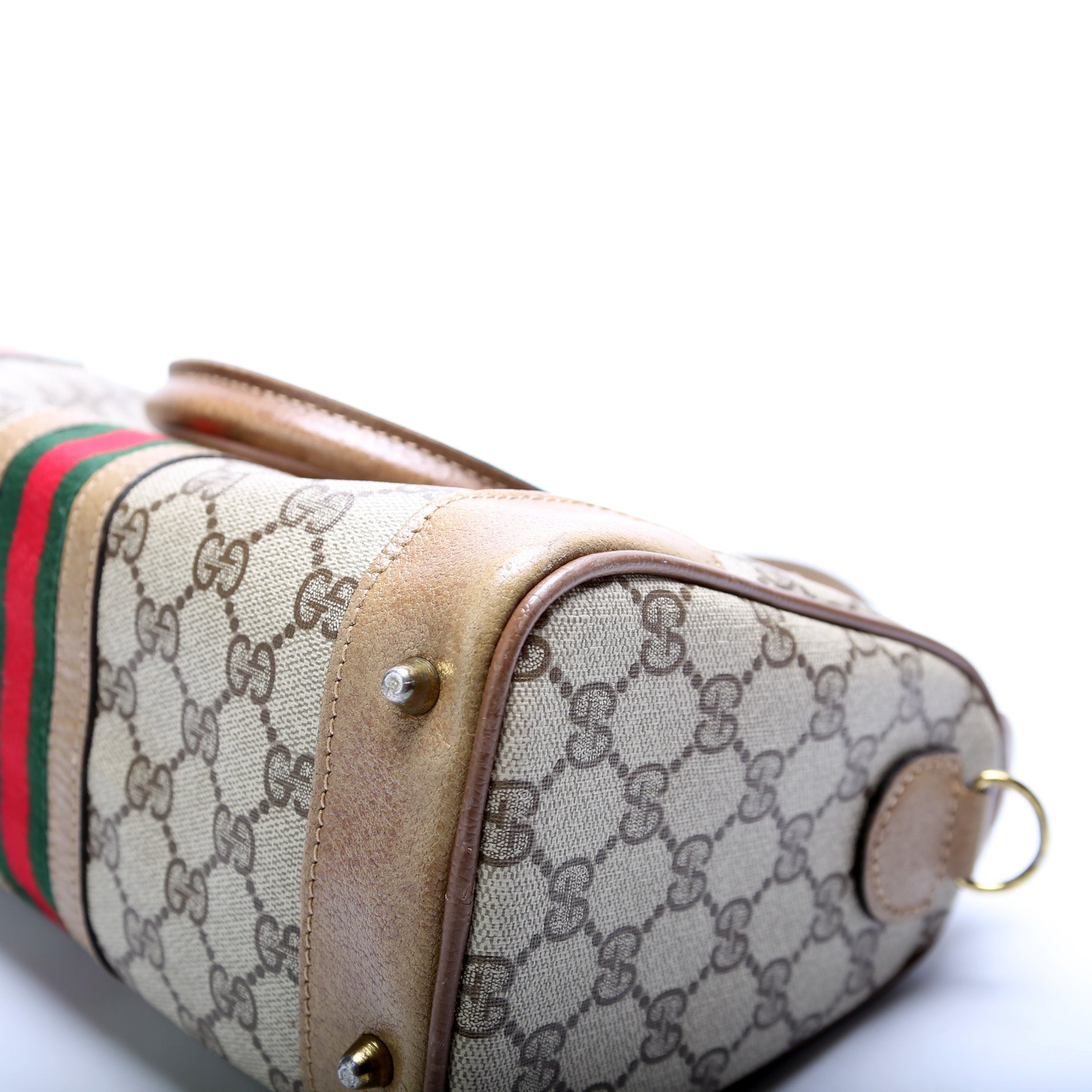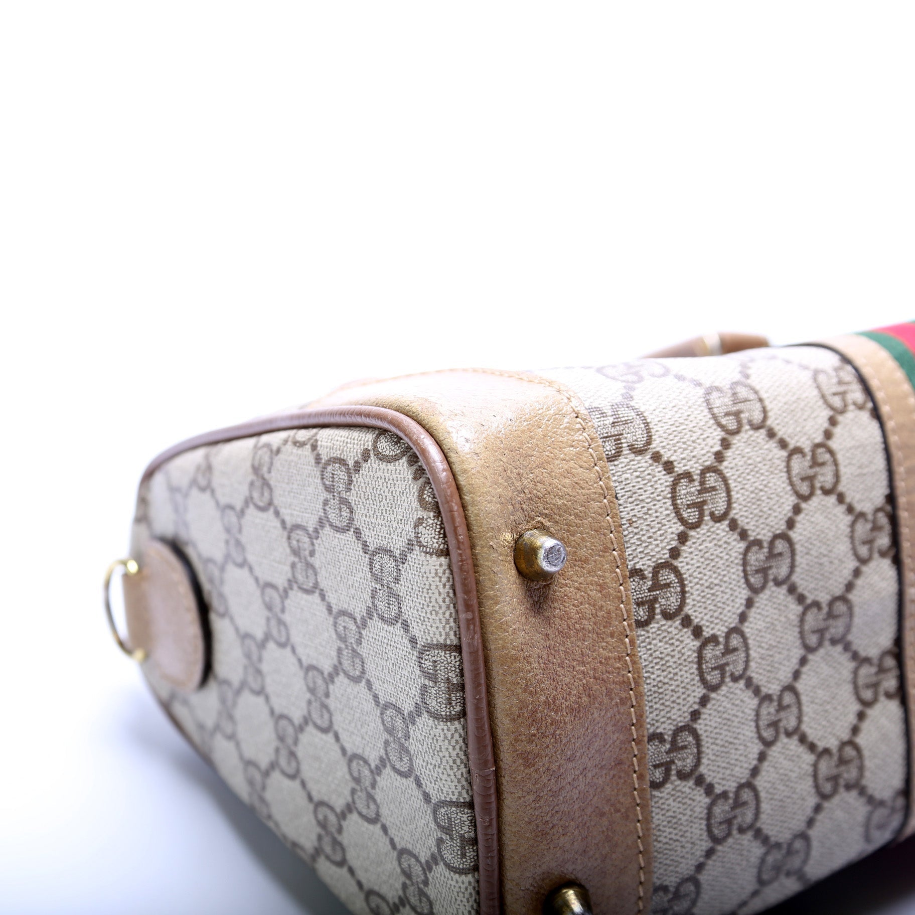 This Gucci GG Supreme Web Boston Bagis eye catching bag. The exterior is in the classic Gucci GG Supreme coated canvas.