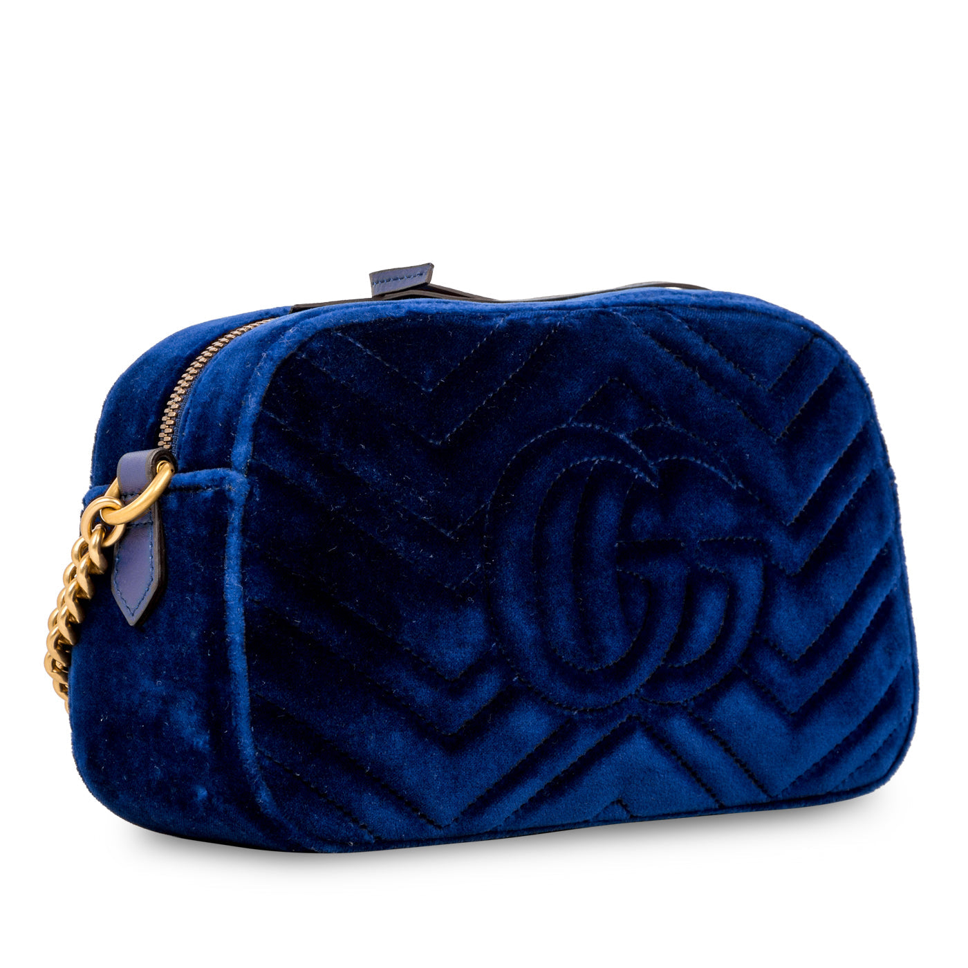 Gucci presents its highly-acclaimed GG Marmont in royal blue velvet. Crafted from the fashion house’s quintessential chevron design, this handbag also features a GG logo stitch on its rear. The GG Marmont is also accented with antique gold hardware, complimenting the romantic hue. The bag’s opens up to showcase a magnificent pink satin lining, presented in a single storage compartment. Ideal for day-to-night usage, the GG Marmont is perfect for styling with anything you may have in your wardrobe.