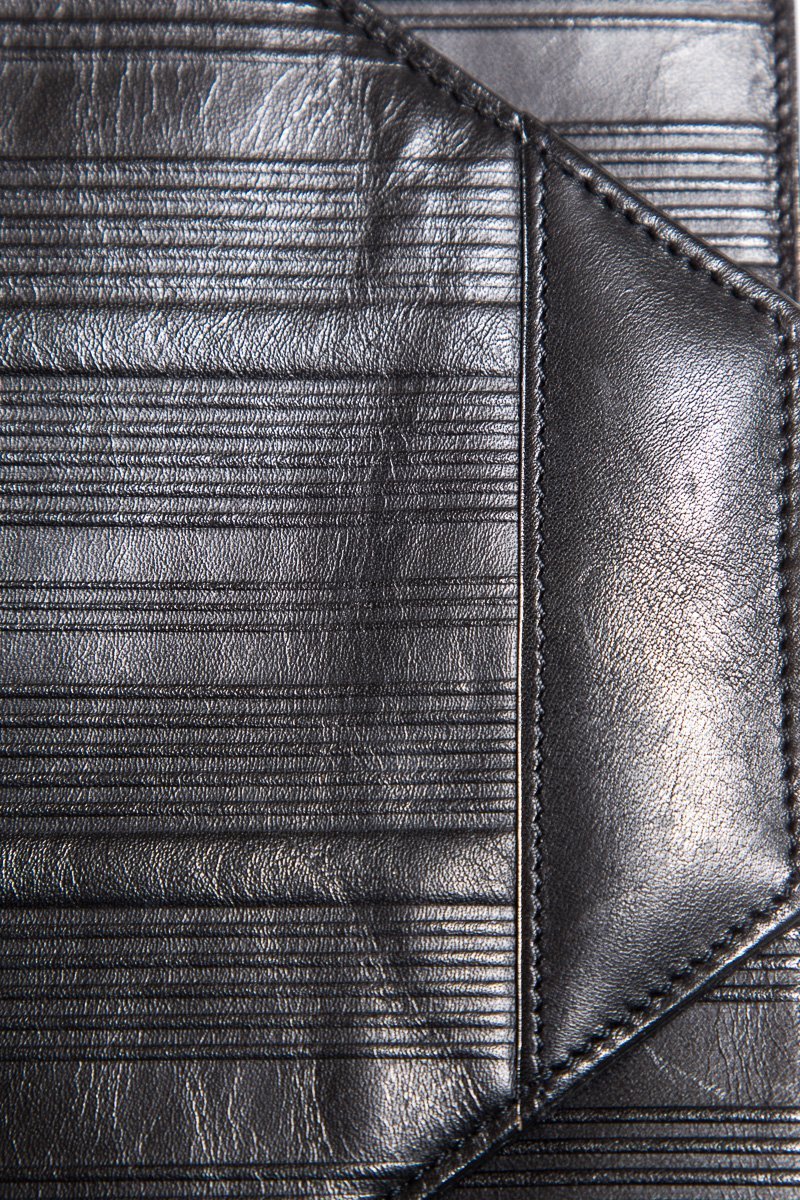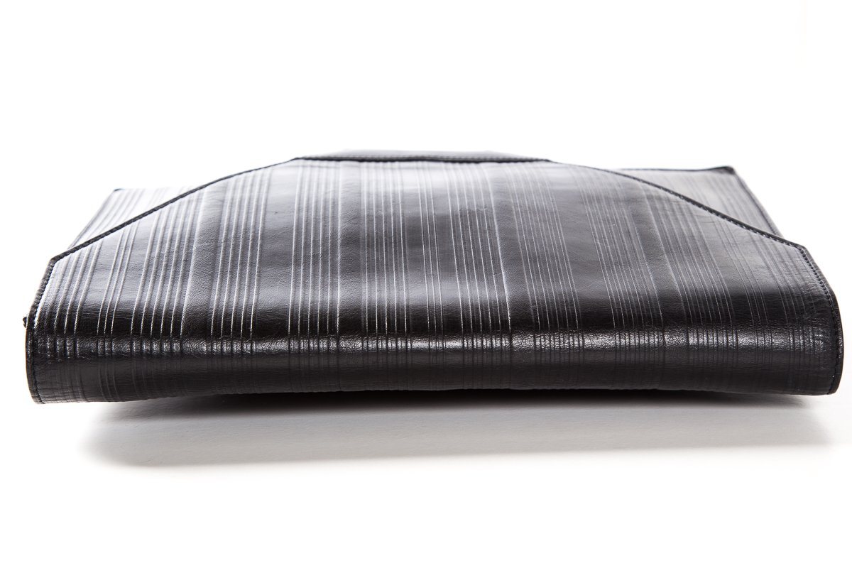 Gianni Versace vintage black leather clutch with tonal stitching, optional flat shoulder strap, woven logo interior lining and magnetic snap closure. This item is previously worn; Item condition is consistent with gentle use and contains some minor signs of wear. Some light leather bending, and scratching to metal hardware.
