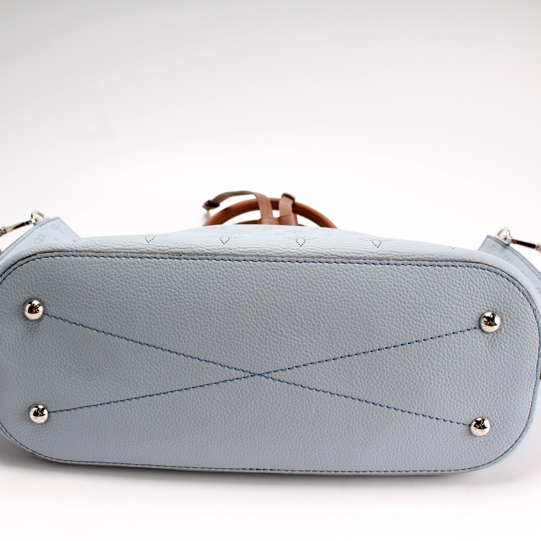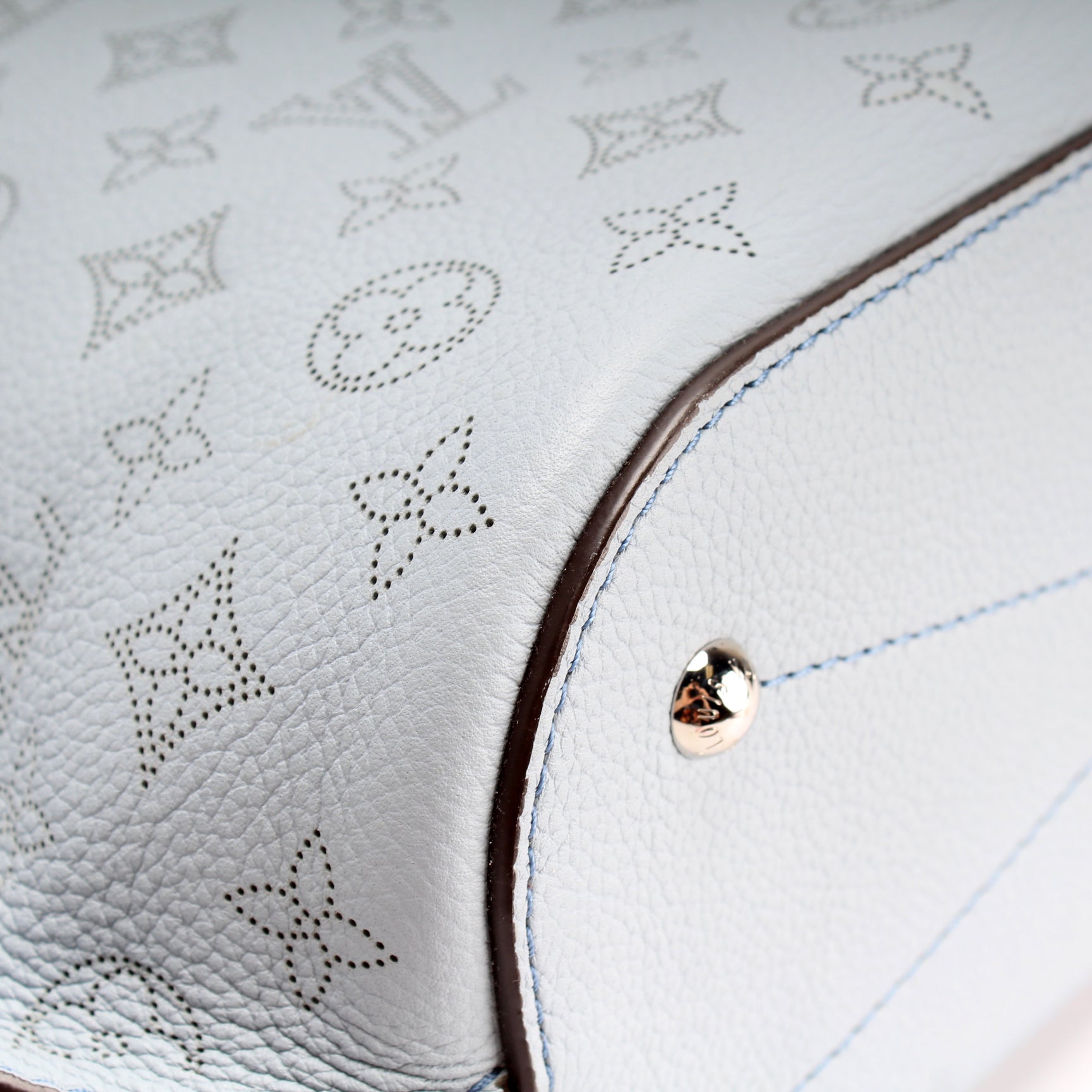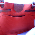 Handle: The leather handles show light wear along the pipping.