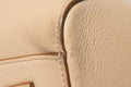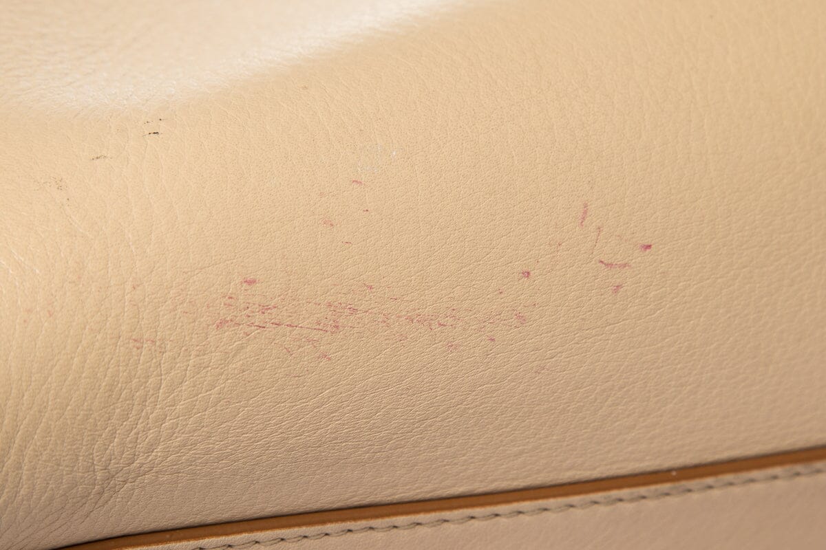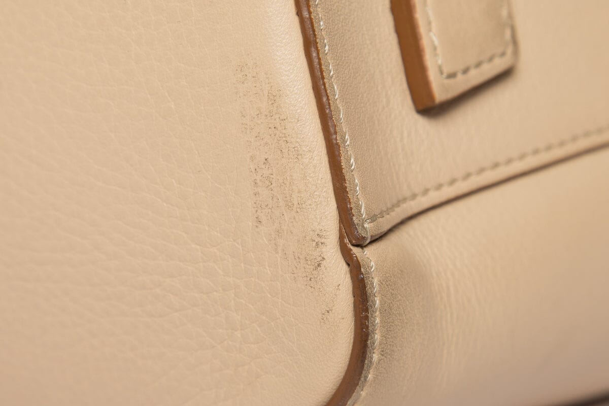 This item is previously worn and contains some signs of wear. Wear includes scuffing to leather on corners, some red staining to back of bag near the bottom, some scratching to hardware, some discoloring to handles, and some staining to lining.