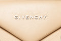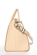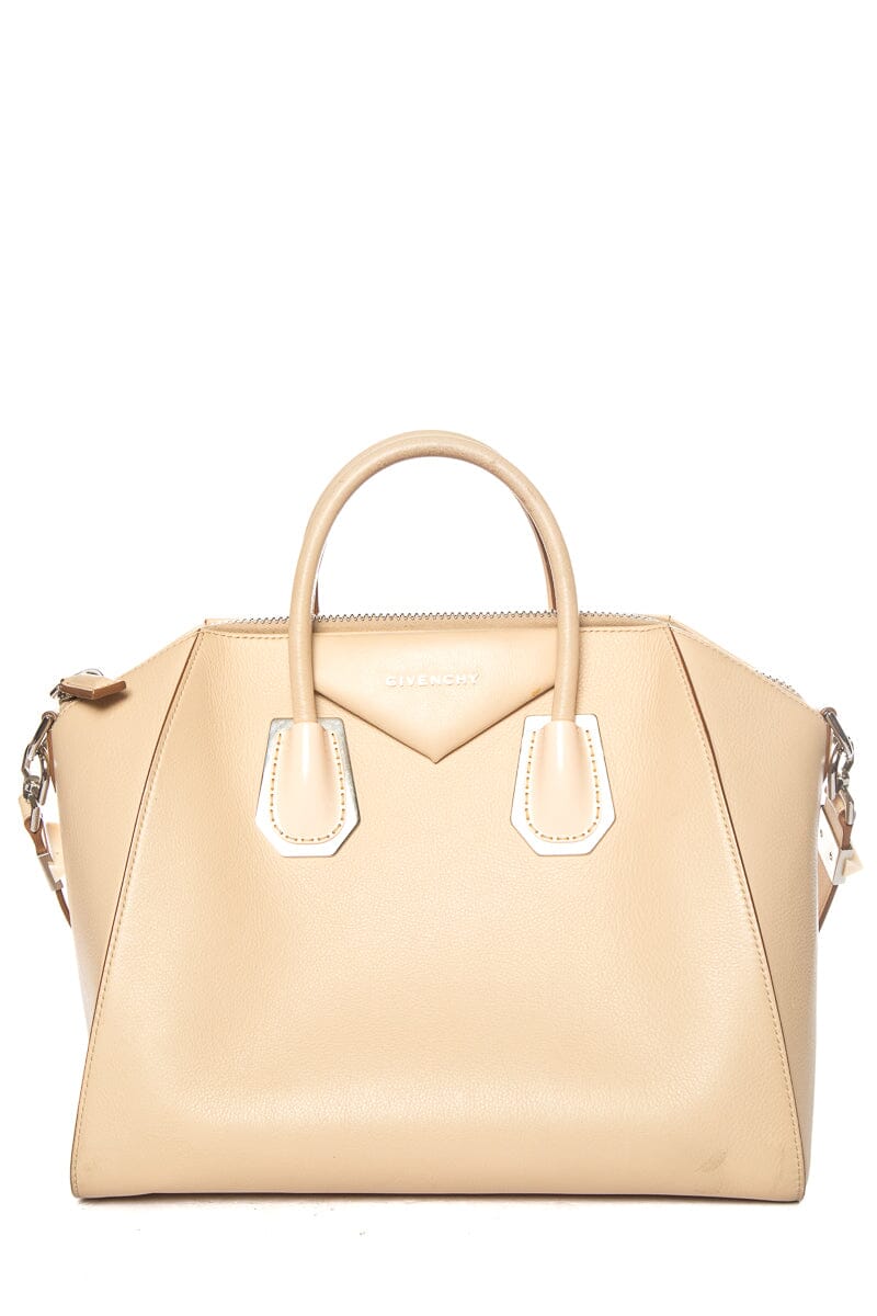 Large tan leather Givenchy Antigona satchel with silver-tone hardware, dual rolled top handles, single flat shoulder strap, tonal canvas lining, three pockets at interior walls, and with zip closure at top.