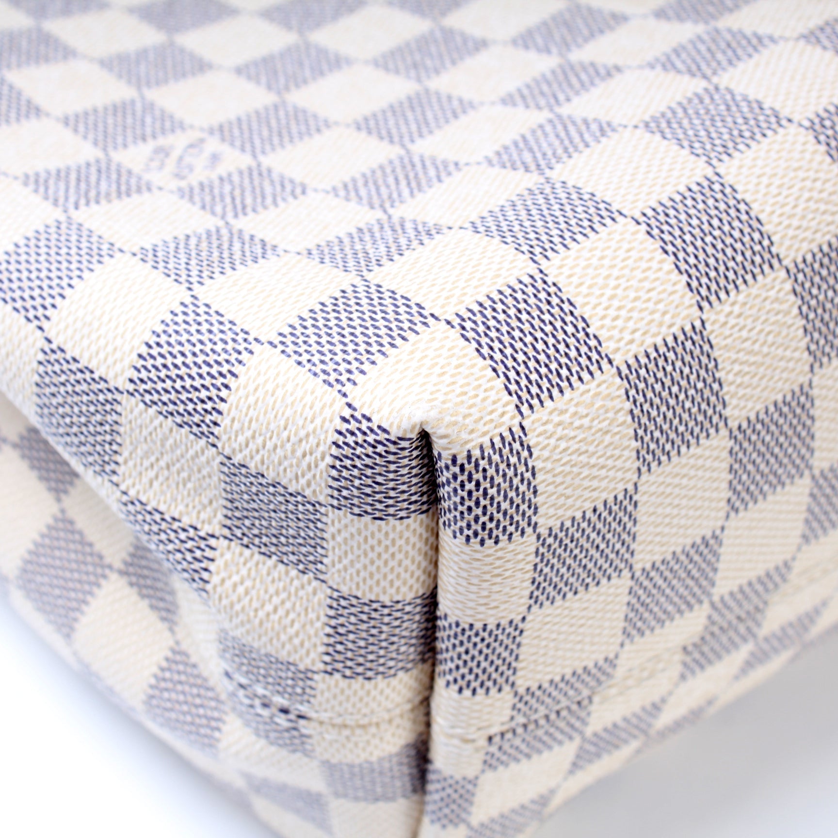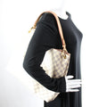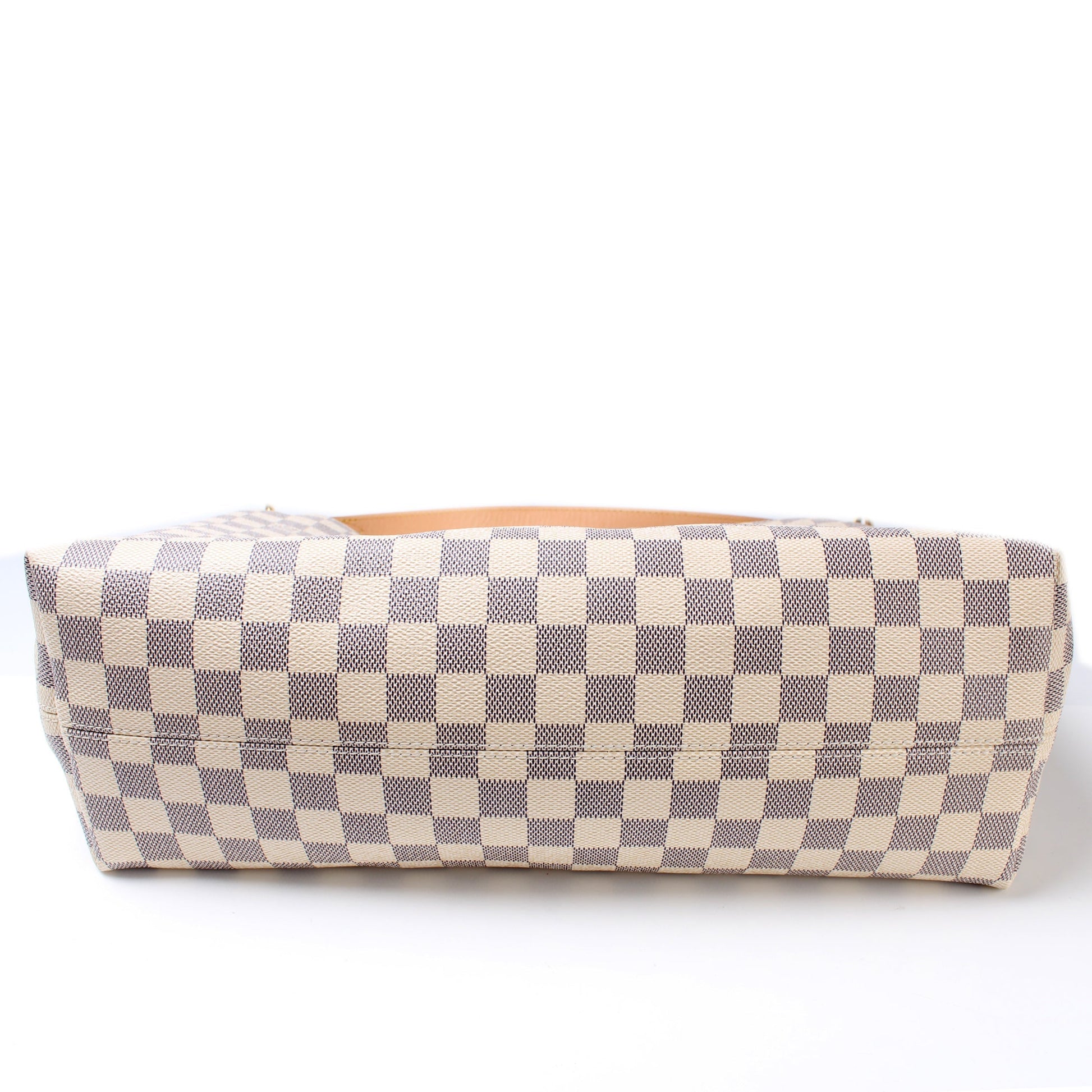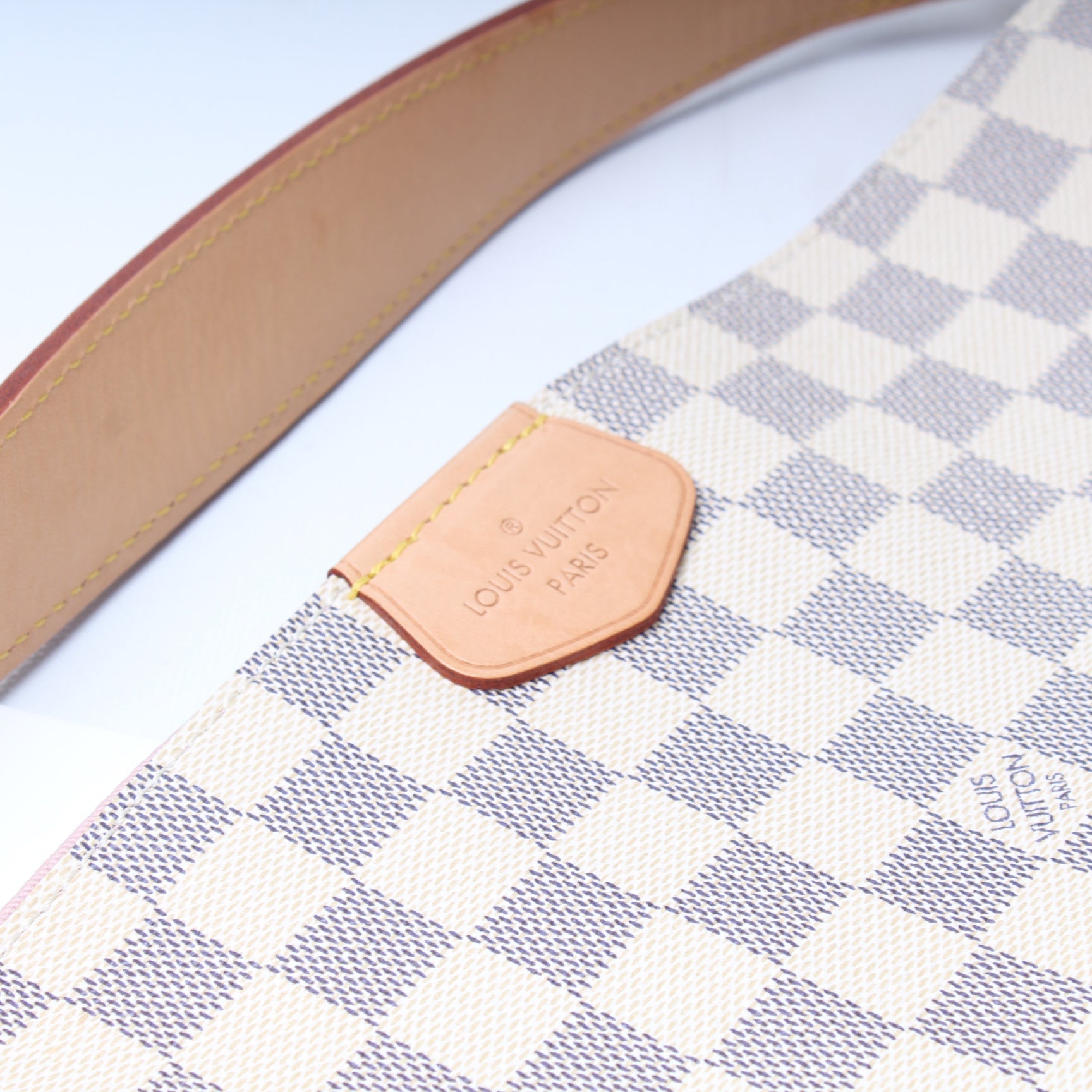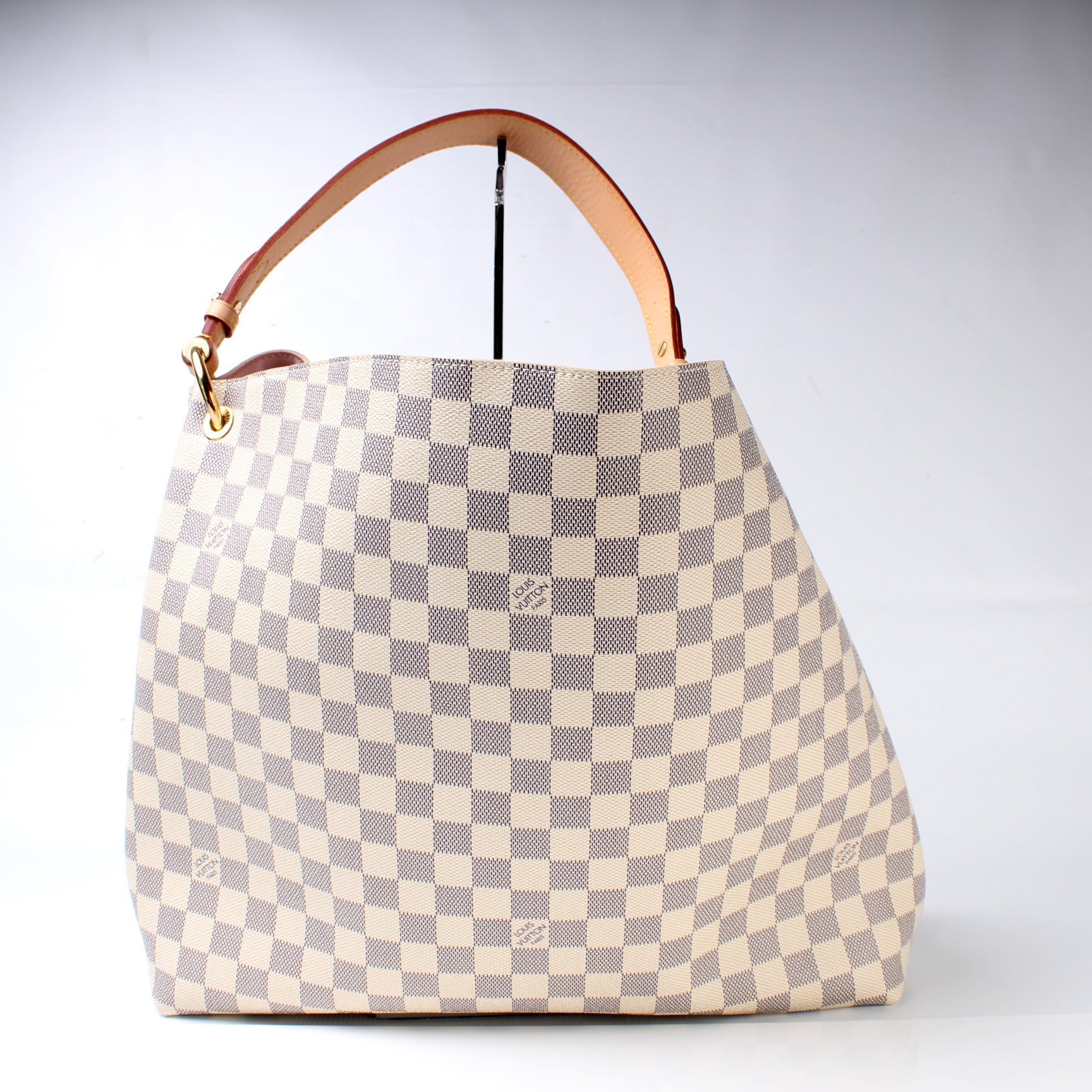 This Louis Vuitton Graceful MMis eye catching bag. The exterior is in the classic Louis Vuitton Damier Azur coated canvas.