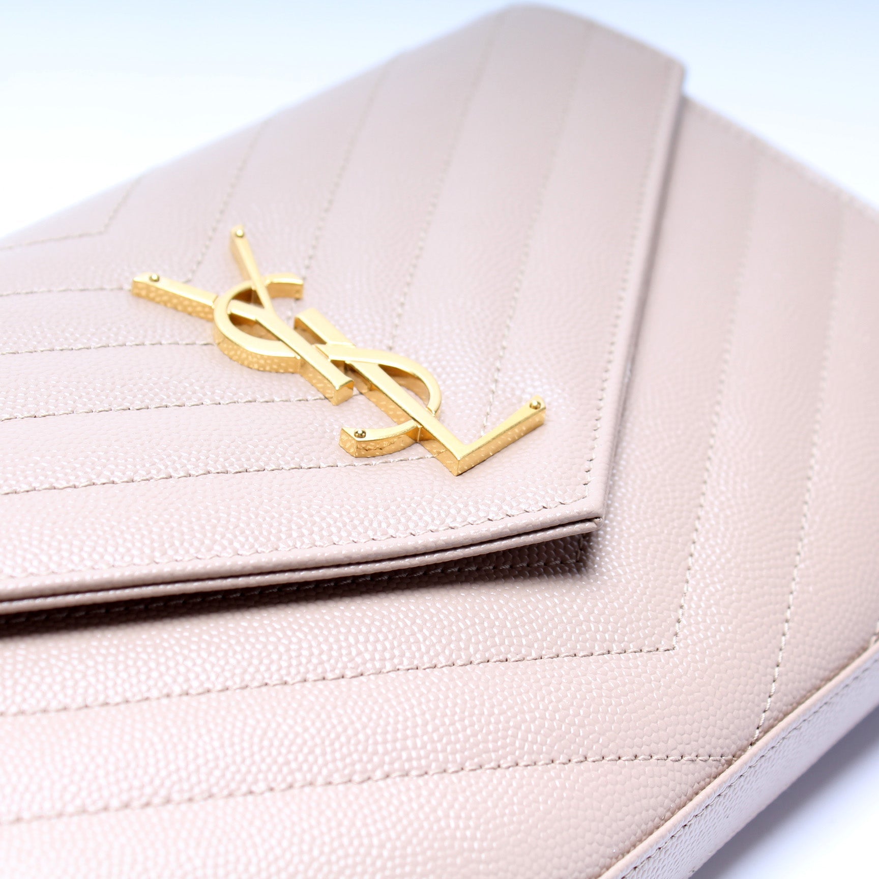 Hardware: The snap closure operates properly. The YSL logo shows minor scratches.