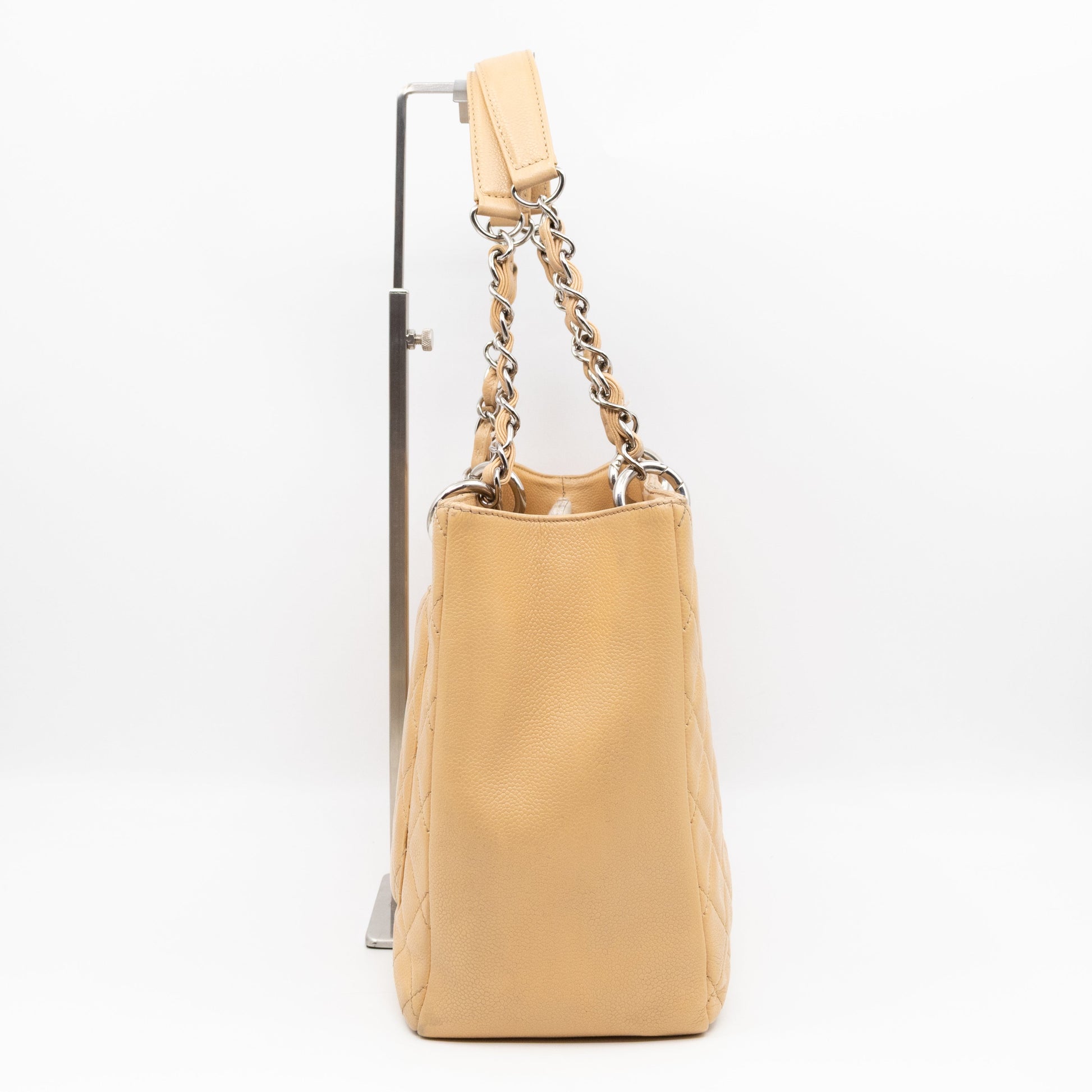 Chanel classic GST bag is very popular choice for work and business use. This grand shopping tote is made with beige caviarskin leather and silver-tone hardware. Two compartments and a middle zipper pocket. Outside has a slim pocket. Easy to use everyday, with documents, laptop, and all daily items.