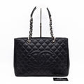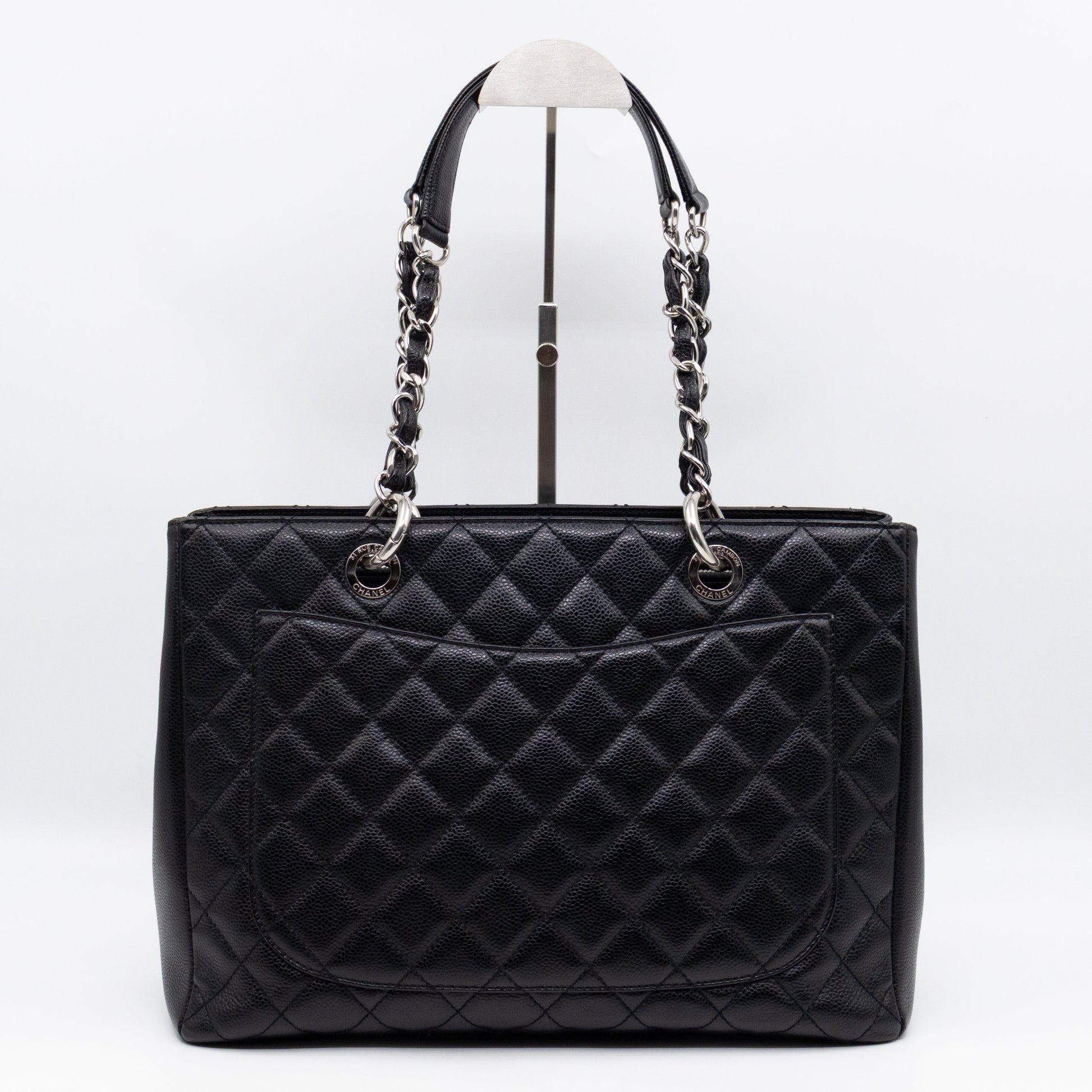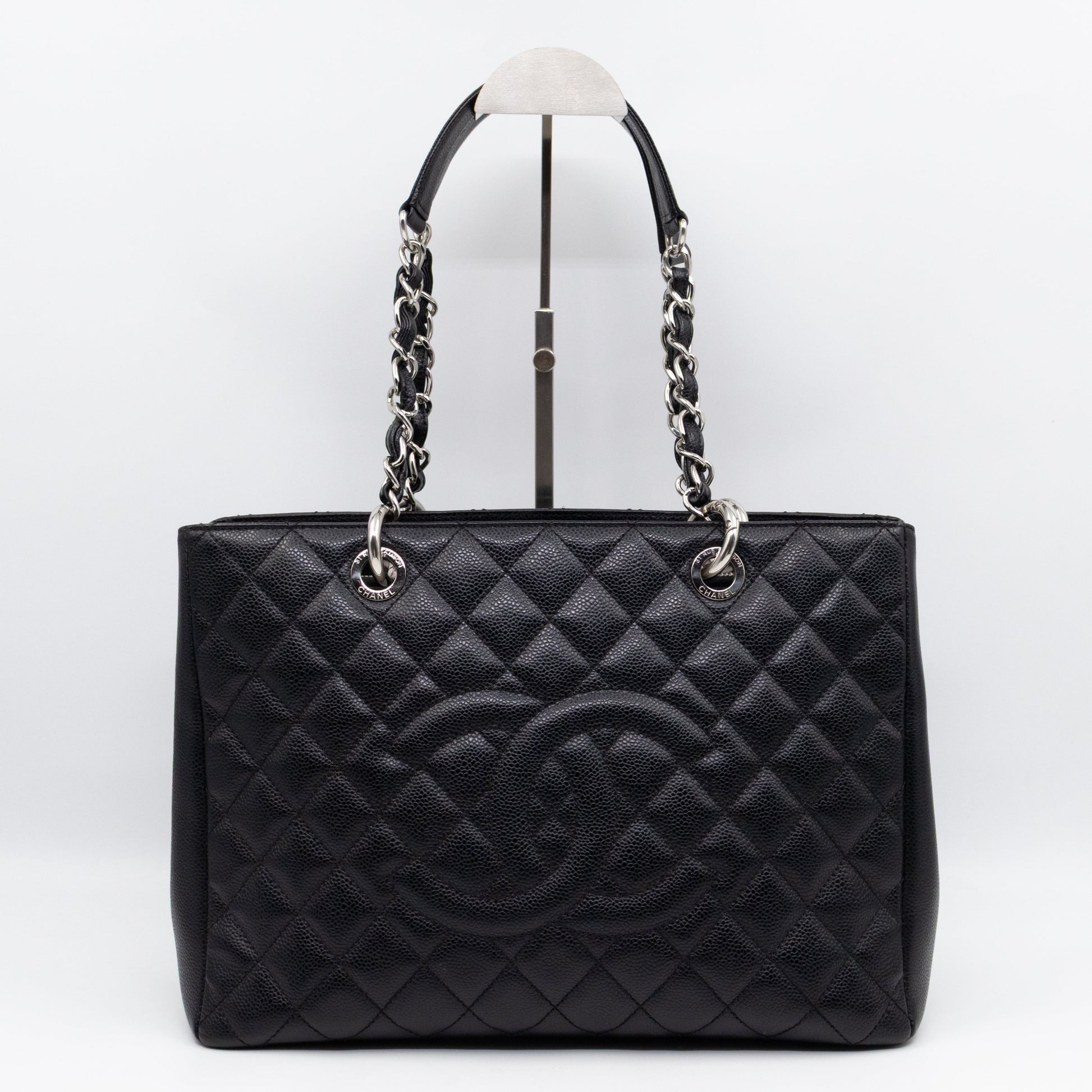Chanel classic GST bag is very popular choice for work and business use. This grand shopping tote is made with black caviarskin leather and silver-tone hardware. Two compartments and a middle zipper pocket. Outside has a slim pocket. Easy to use everyday, with documents, laptop, and all daily items.