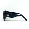- Shiny black oversized cat eye sunglasses featuring a 60's inspired silhouette, dark grey lenses, temples are etched with textured detailing and topped with the interlocking gold tone GG logo