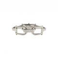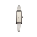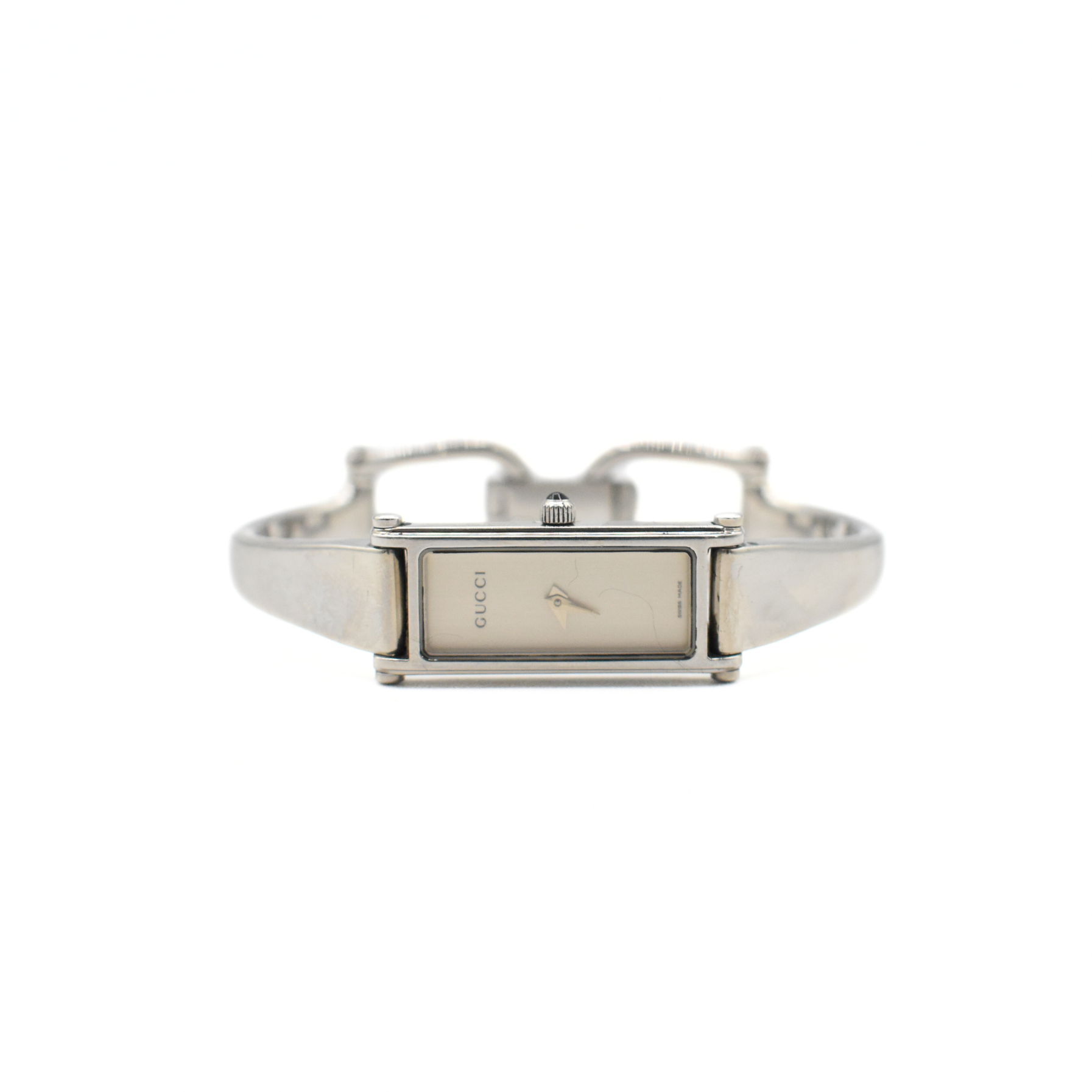 Gucci '1500L' watch in silver stainless steel with a thin bangle band, a rectangular white watch face, and a horsebit butterfly clasp closure.