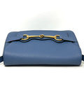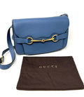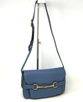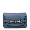 - Blue grained leather shoulder bag featuring an antique gold-tone horsebit detail on the front, flap slip closure and an adjustable strap