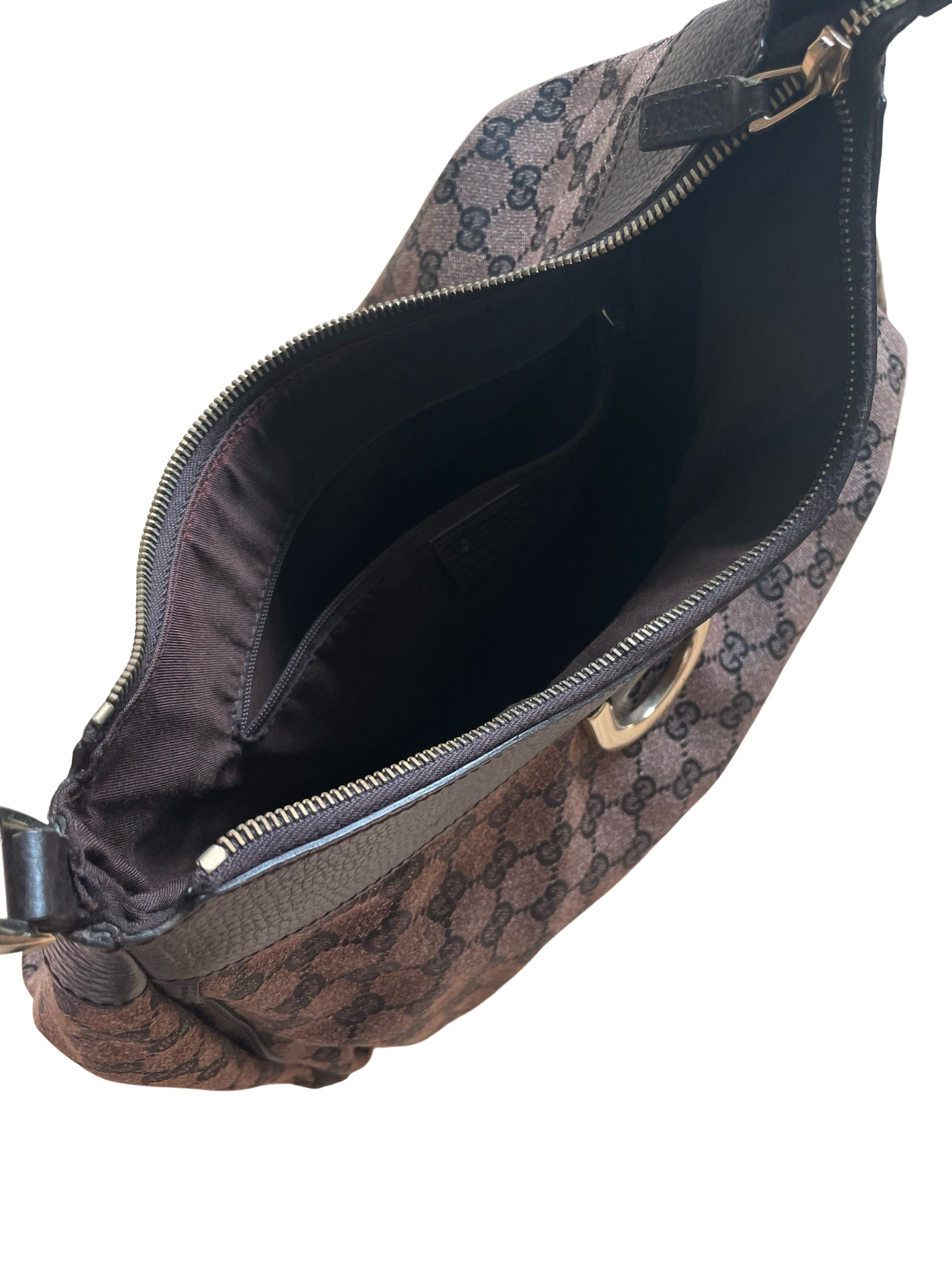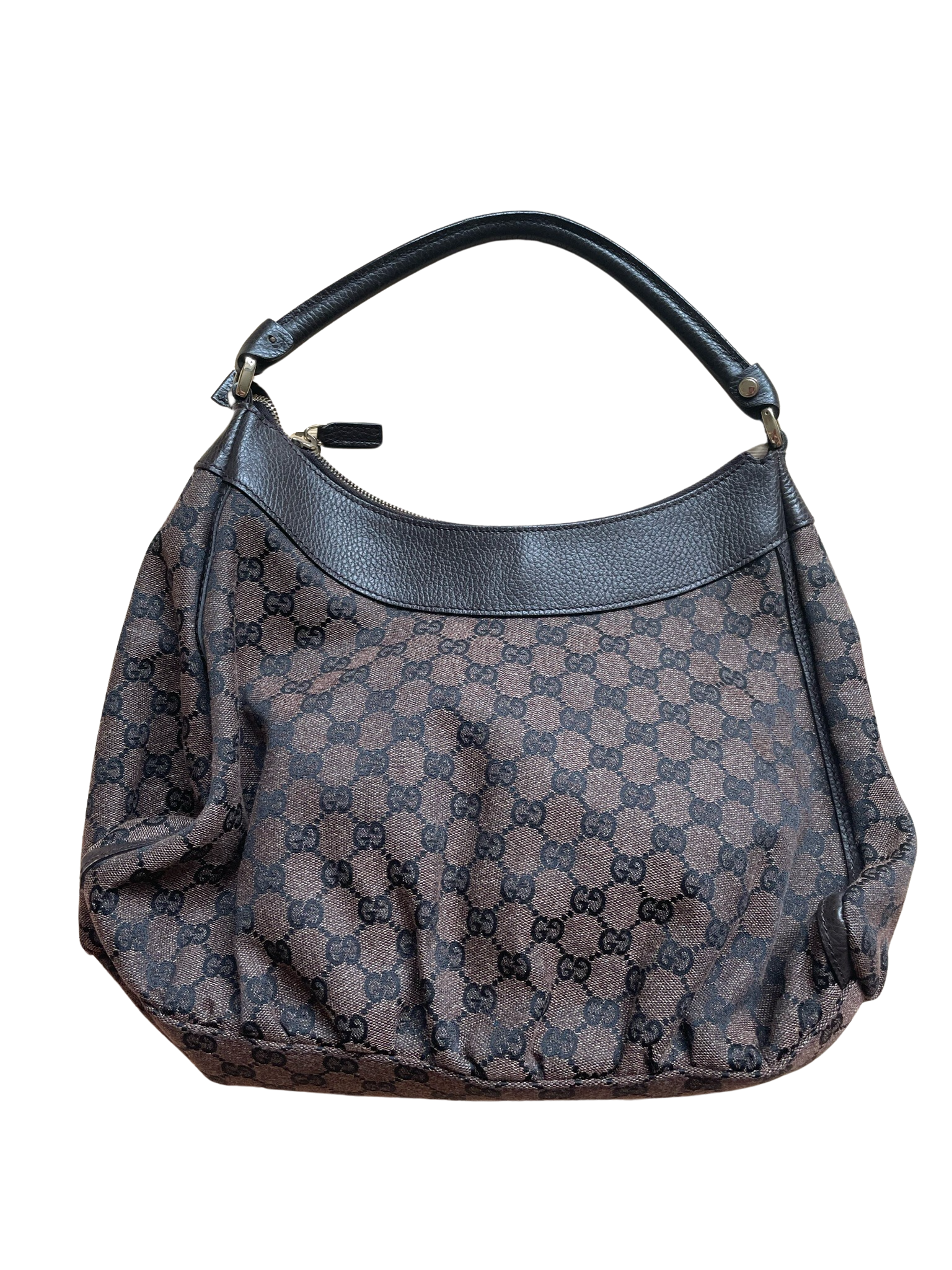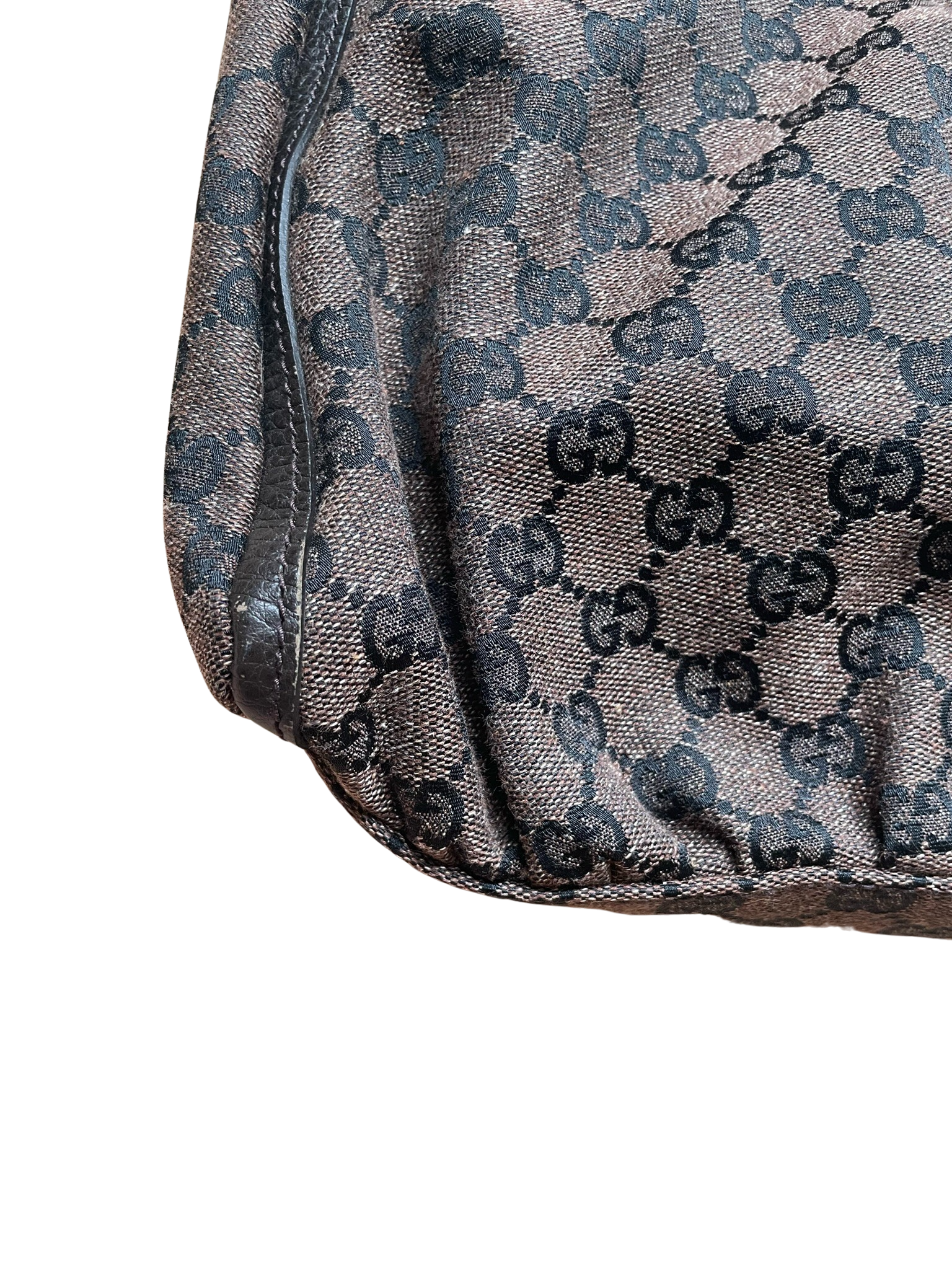 Gucci Abbey Brown Jacquard & Leather in fine condition with some signs of previous use and patina. Specifically the bag shows signs of previous wear in the form of some discolouration and scratches on particularly the corners, hardware, and handles of the bag. The inside pockets are in fine condition as well.