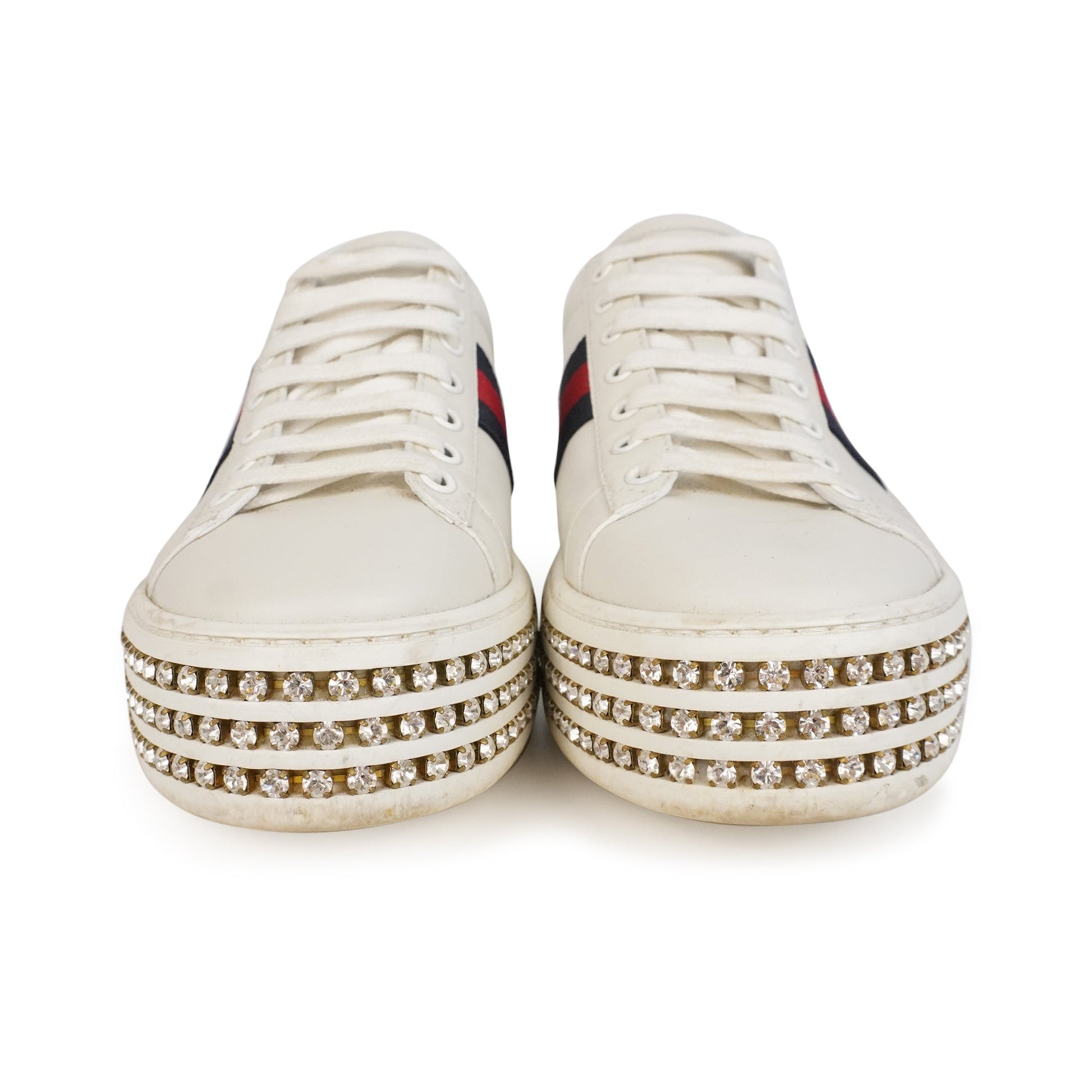 Gucci 'Ace' low-top sneakers in white leather with a rubber rhinestone white platform sole. Features navy blue and red racing stripes on the sides with a gold embroidered bee, white flat laces, and red and blue metallic leather heel caps.
