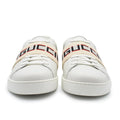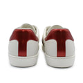 Gucci 'Ace' low top sneakers in white with red heel details. Features logo in black and red on a cream elastic band across the top of shoe.