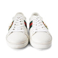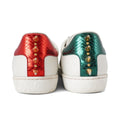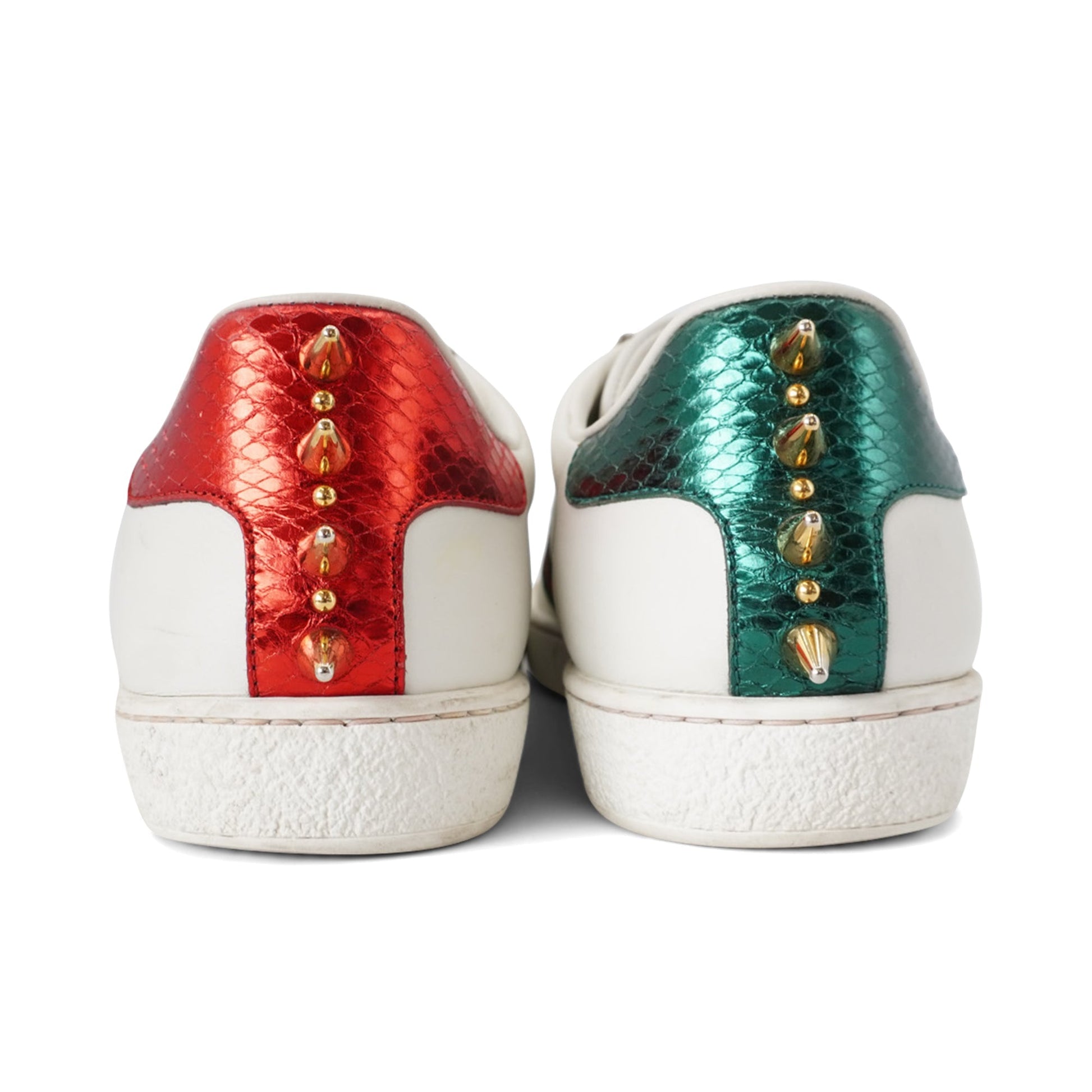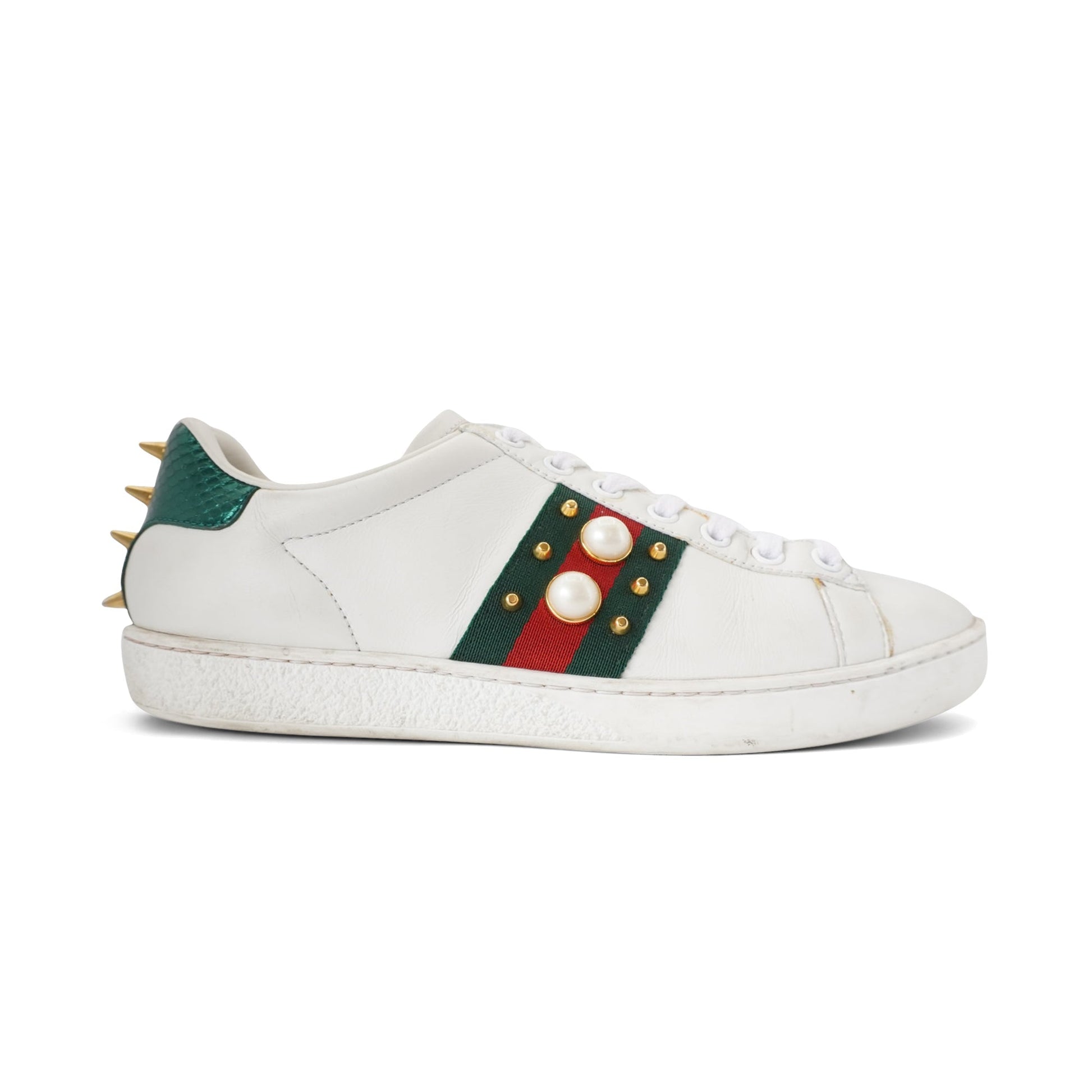 Gucci 'Ace' low top sneakers in white leather with racing stripe webbing, snakeskin heels, and pearl and spike stud embellishments.