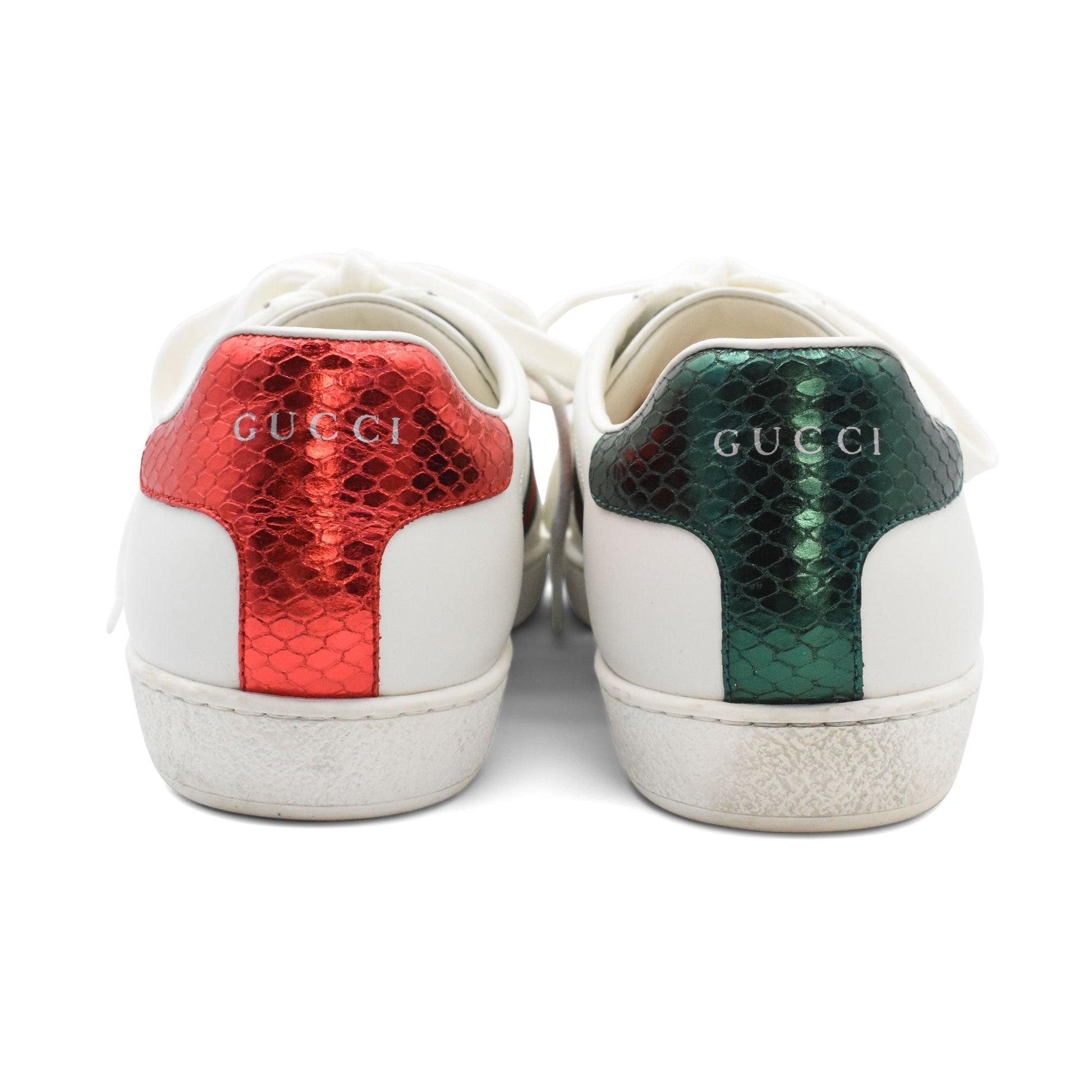 Gucci 'Ace' low top sneakers in white leather with green and red racing strip webbing embroidered with a gold bee. Feature metallic red and green faux snakeskin panels on the heels.