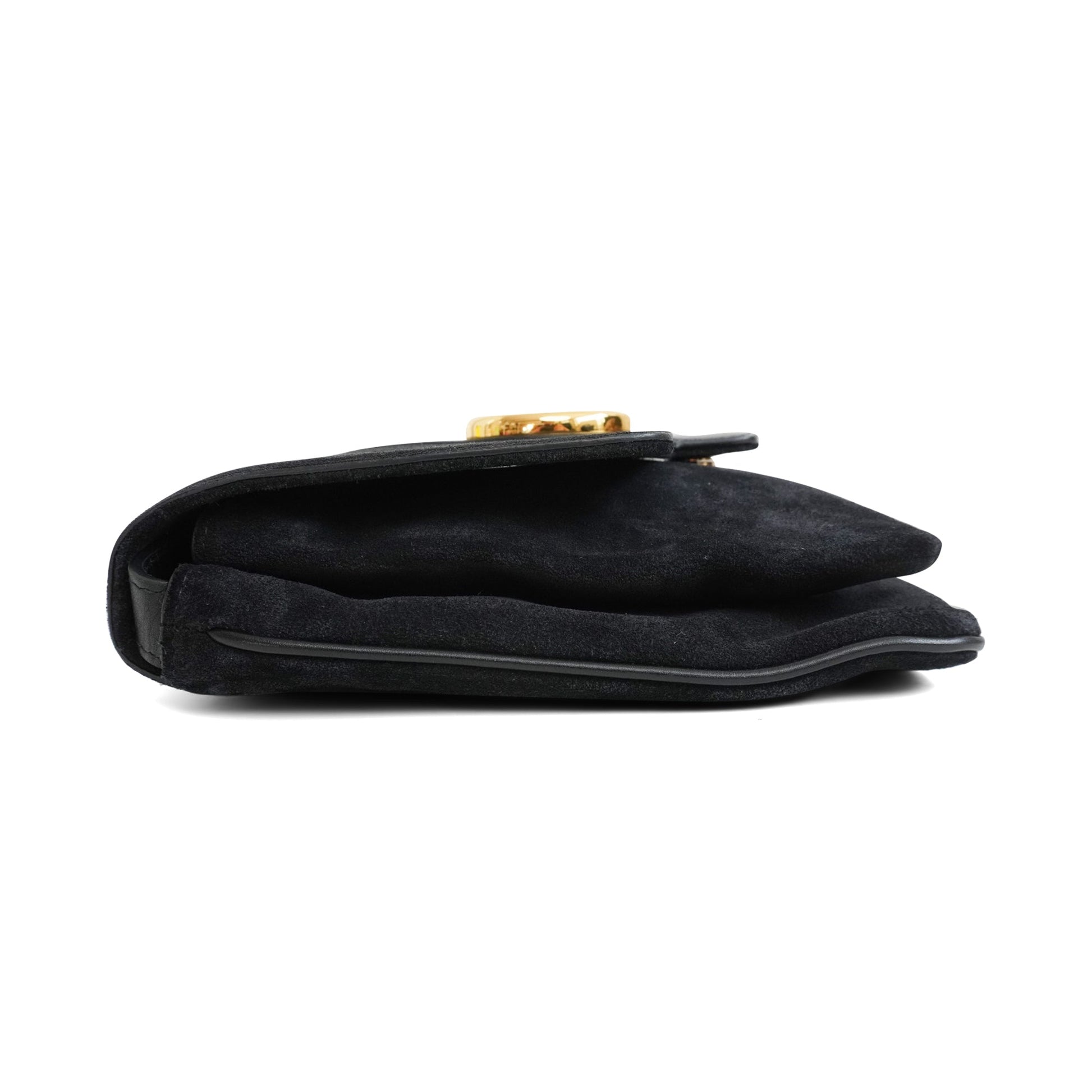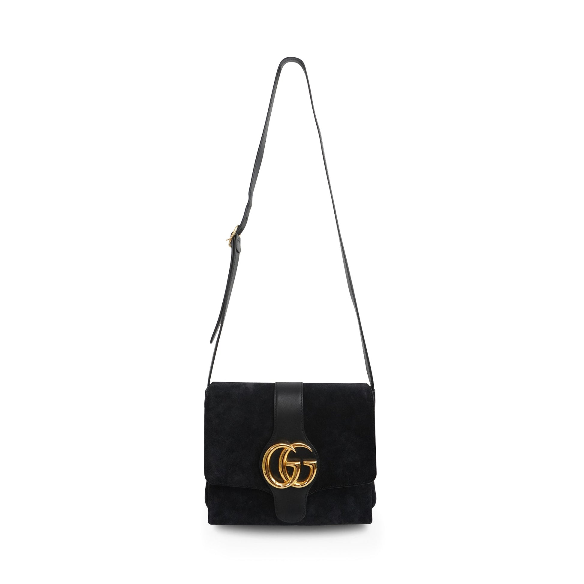 Gucci 'Arli' crossbody bag in black suede with leather accents and large gold GG Marmont hardware. Features a magnetic closure and two interior pockets with pink fabric lining.