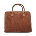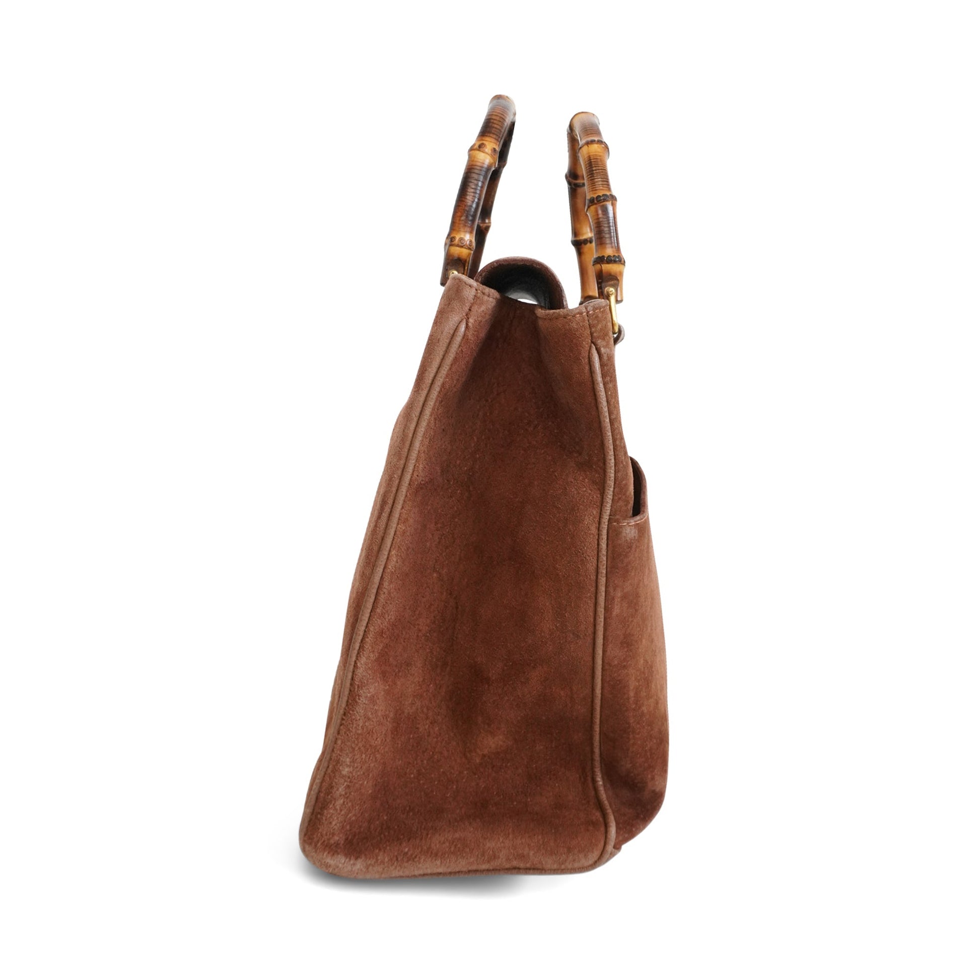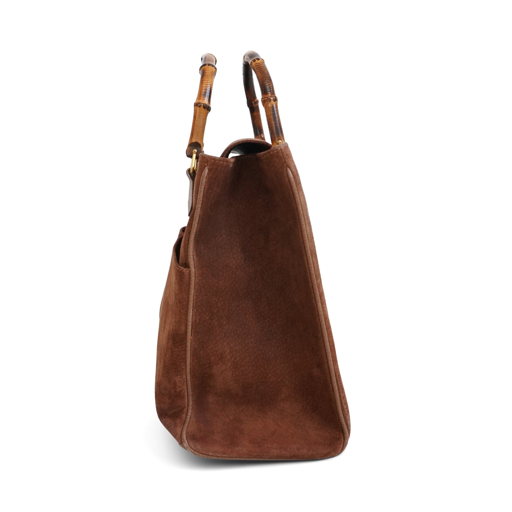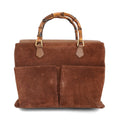 Gucci vintage tote bag in brown suede with leather trim and dual bamboo top handles with gold hardware. The bag has two large front slip pockets, a magnetic top snap closure, and a printed canvas lined interior with two main compartments and zip pockets.