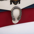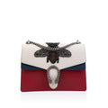 A true statement piece that every woman with an eccentric sense of style needs in her wardrobe. Carefully crafted from red, blue and white leather, this bag features Gucci's signature bee embellished on the front flap. Complimented with silver tone hardware and Gucci's classic Dionysus tiger plaque, this bag is sure to make all heads turn wherever you go. Given its bright colour palette and unique detailing, this bag is best suited with a monochrome or neutral-toned outfit to further accentuate it. Wear this Dionysus with a pair of simple black trousers and a silk blouse for a dressier look or dress it down with a pair of white jeans and a basic top for a more casual look. Wherever you go and regardless of what you wear this piece with, you'll be sure to have all eyes on you.