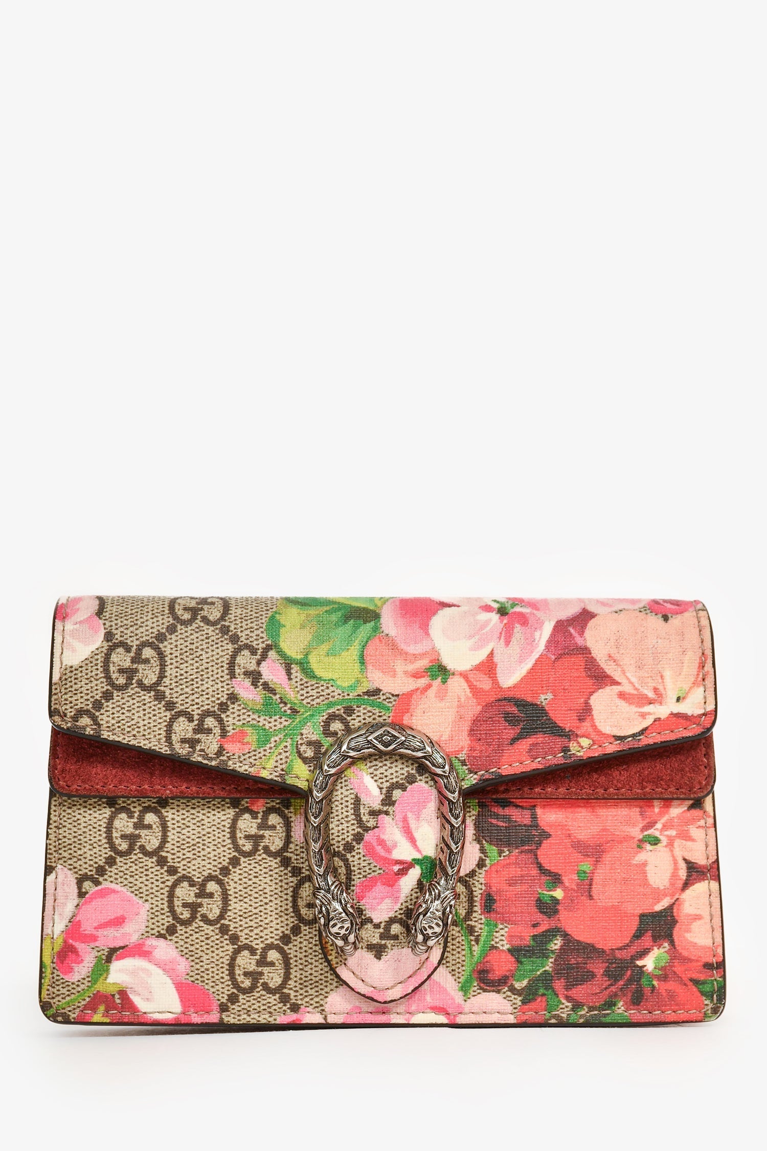 Gucci Beige GG Supreme Floral Mini Dionysus Shoulder Bag. Double fold-over flaps. Suede trimming. Antiqued silver-tone hardware. Chain-link shoulder strap. Suede lined interior.
