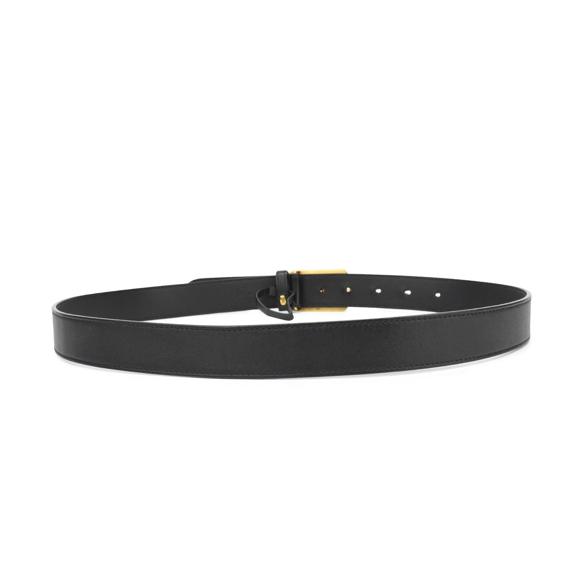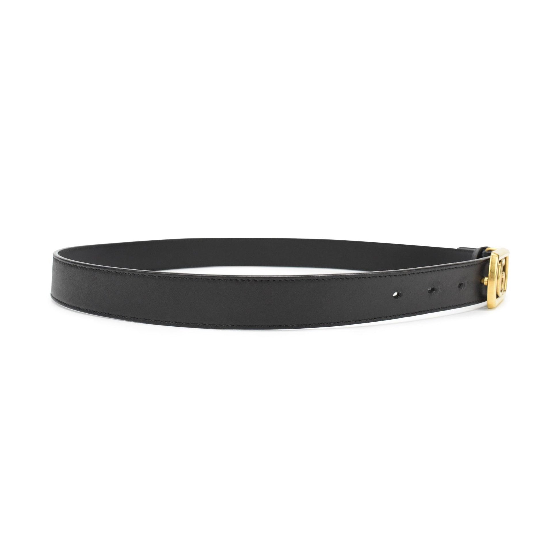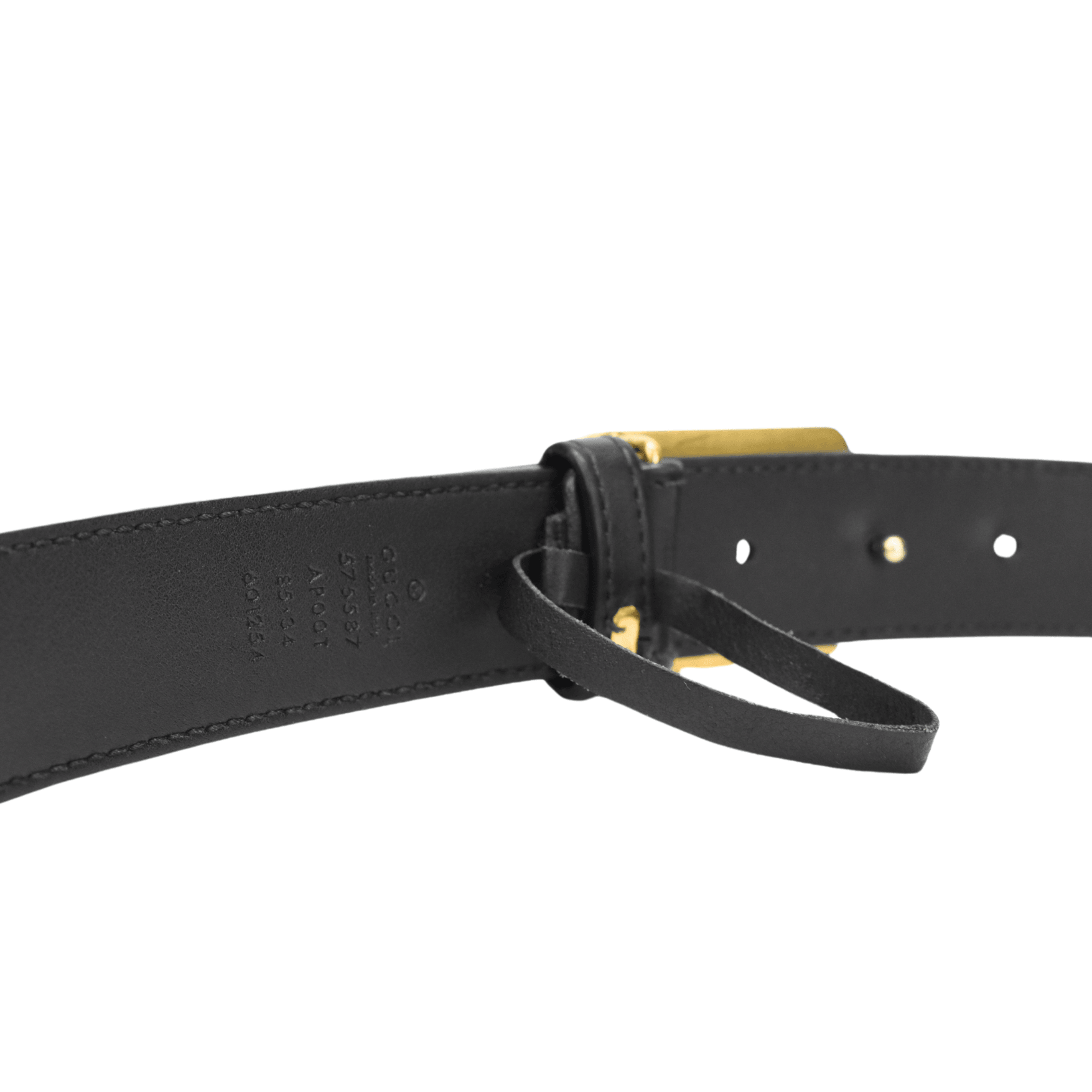 Gucci belt in black leather with a 'GG' marmot rectangular buckle in brushed gold hardware.