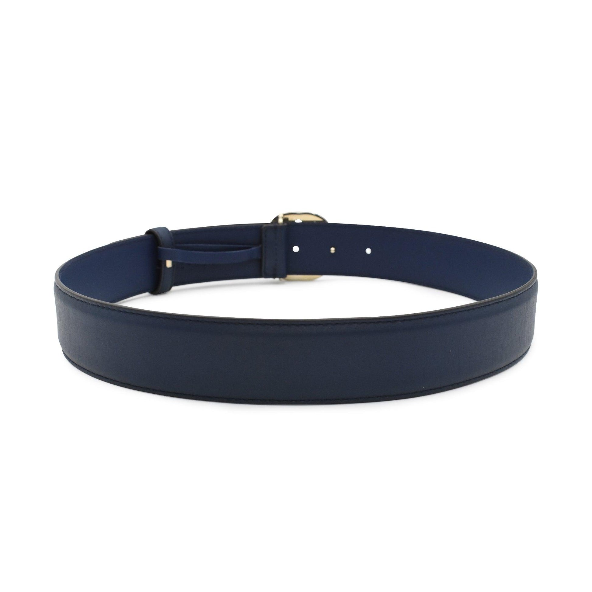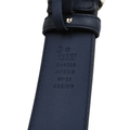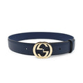 Gucci belt in navy smooth leather with 'GG' logo buckle in soft gold hardware.