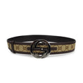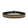 Gucci belt in beige monogram canvas with brown leather trim and a 'GG' buckle in gunmetal hardware.