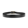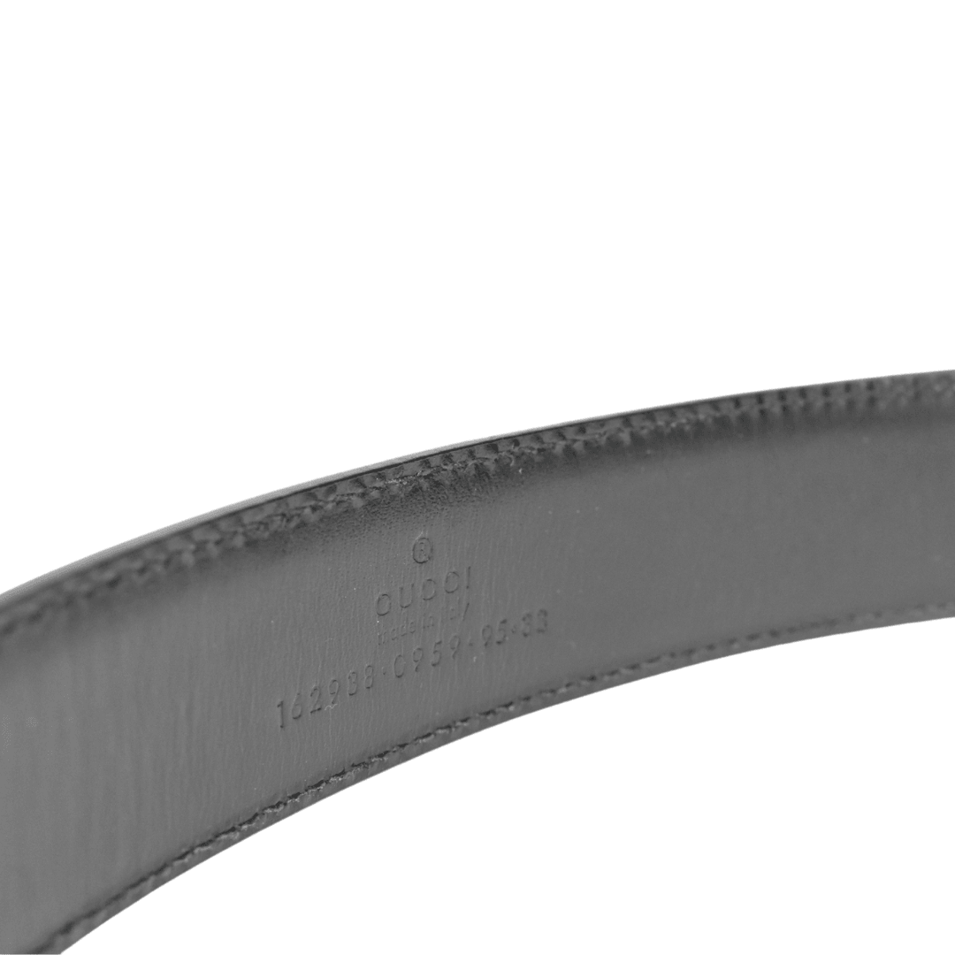 Gucci belt in black leather with a silver cutout buckle with red and green enamel racing stripes.