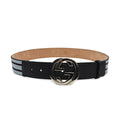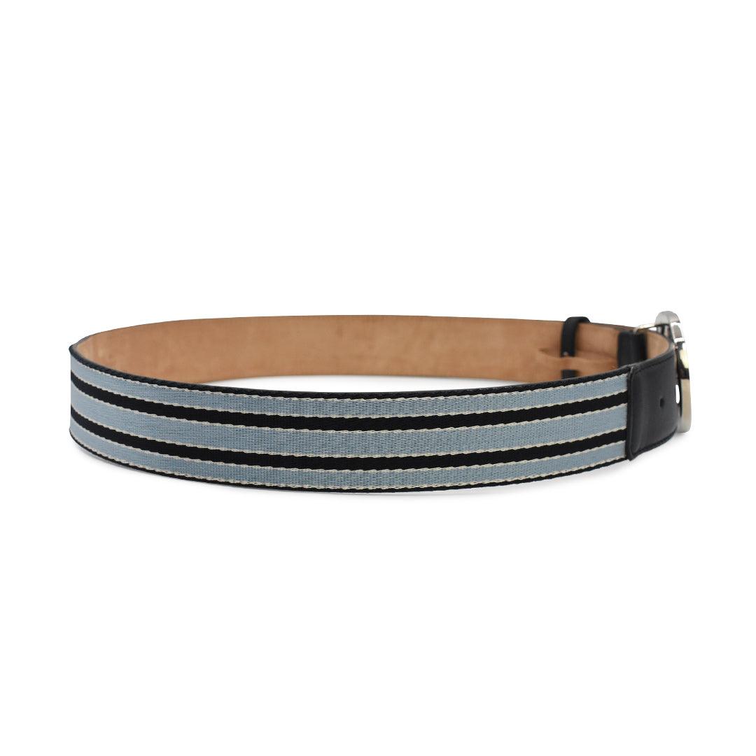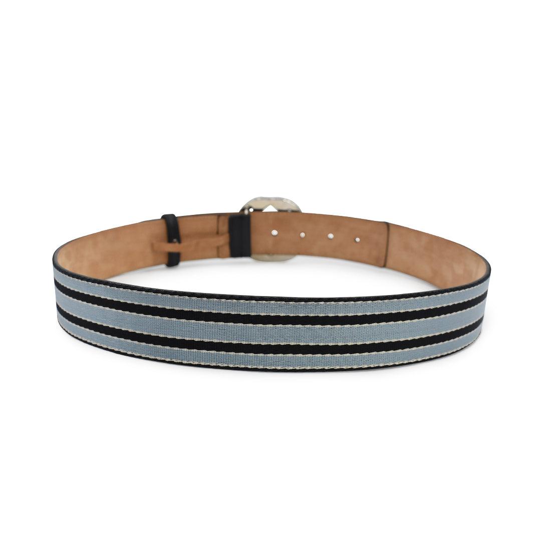 Gucci belt in navy leather with light blue striped canvas around the body and a 'GG' logo buckle in silver hardware.