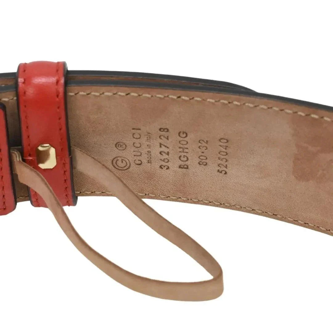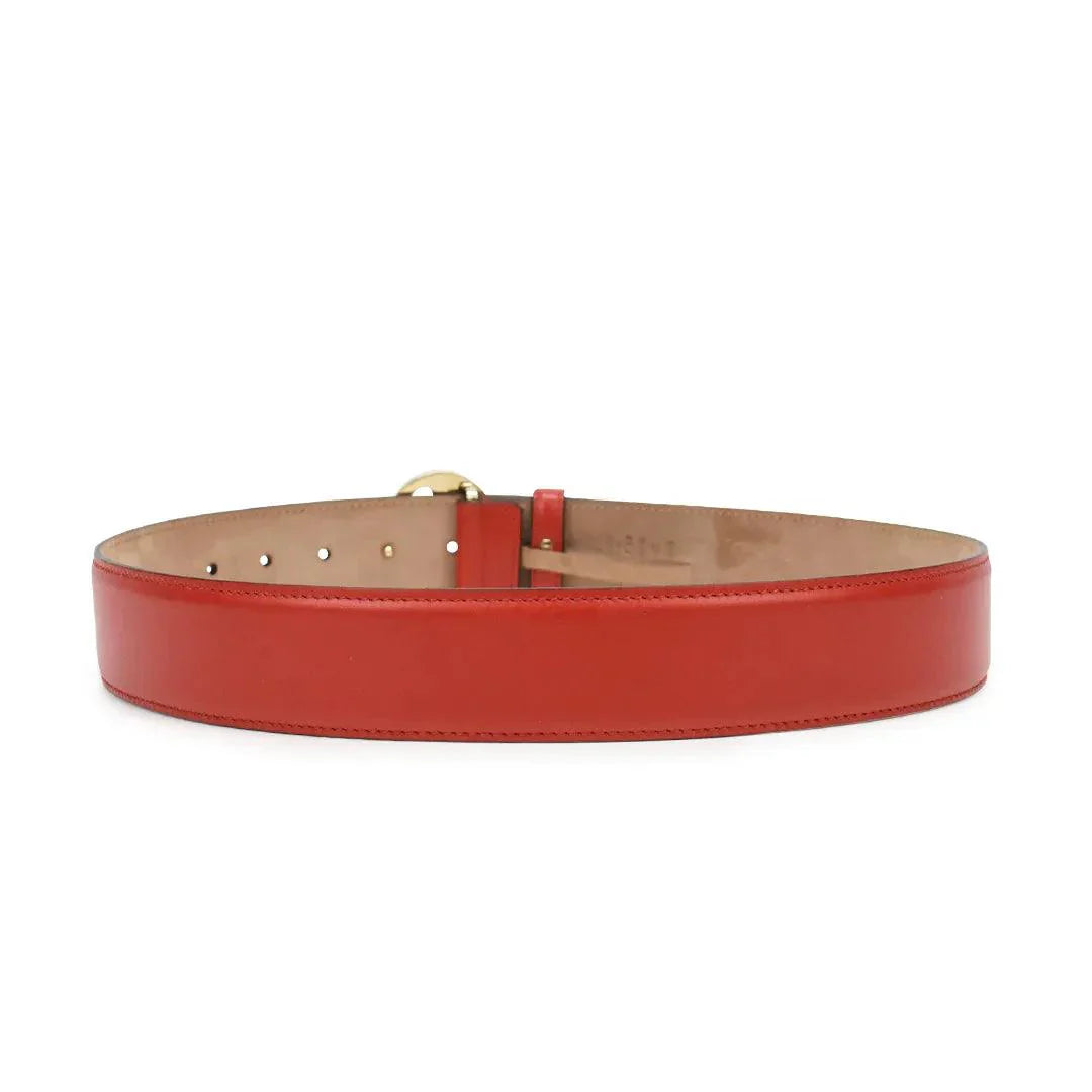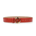 Gucci belt in red leather with a 1973 interlocking 'GG' logo buckle in gold hardware.