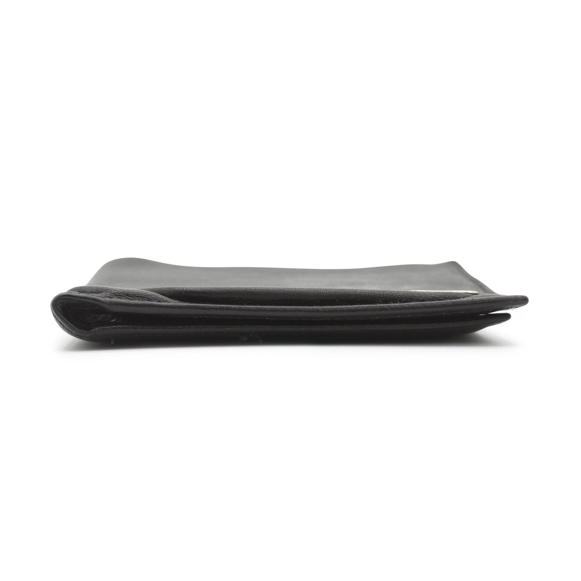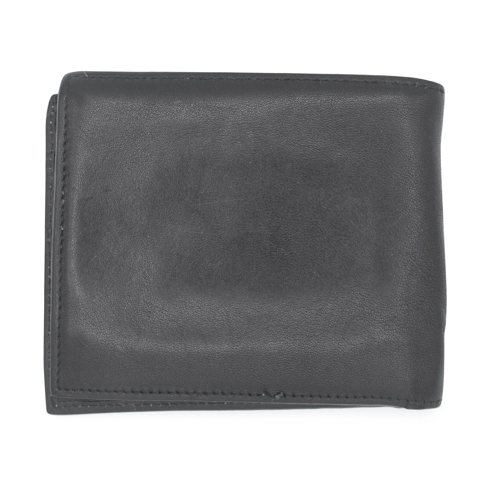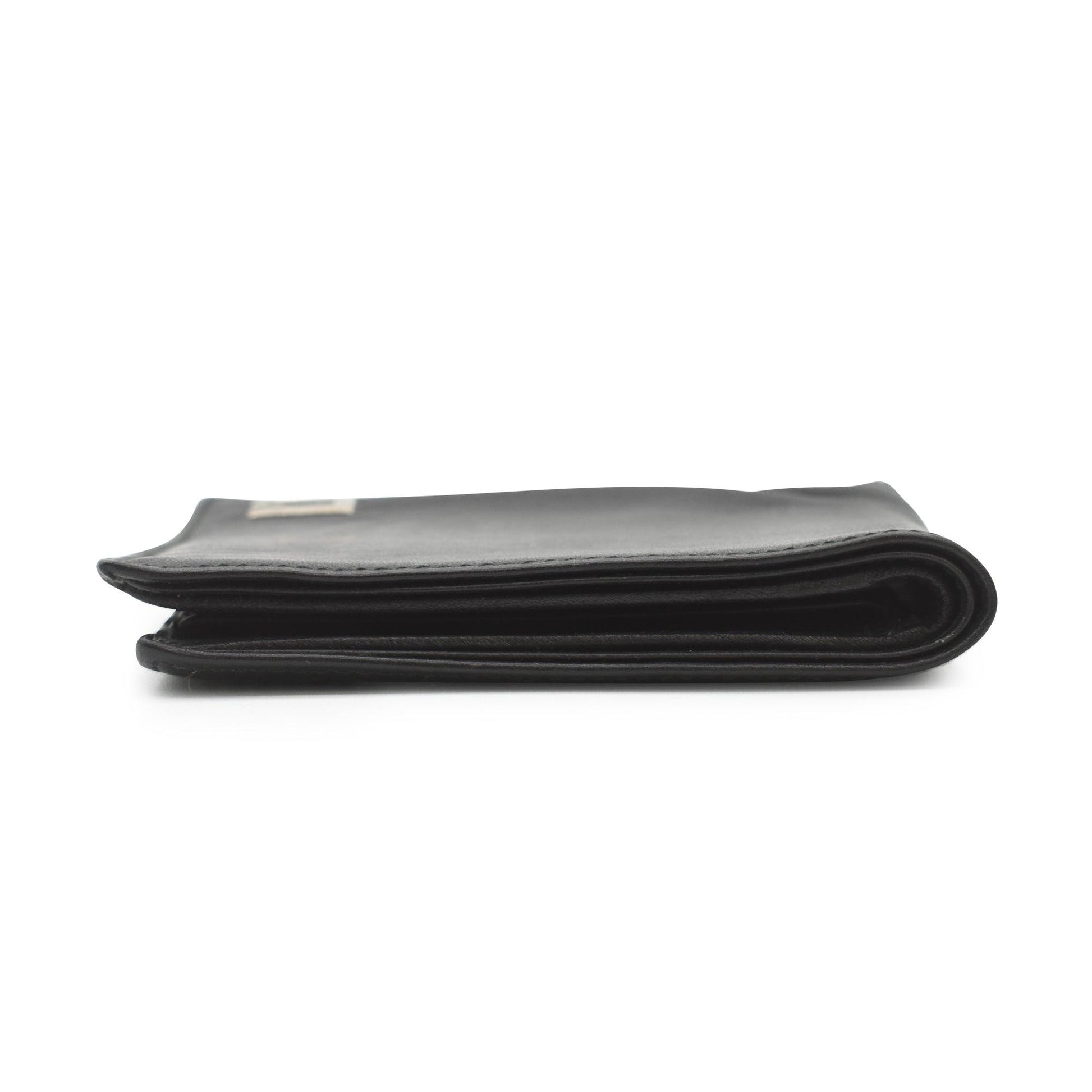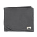 Gucci bi-fold wallet in black leather with a silver 'G' logo plaque on the front.