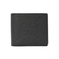 Gucci 'GG Jumbo' bi-fold wallet in black pebbled leather with large embossed logos. The interior features a cash slot and multiple card slots.