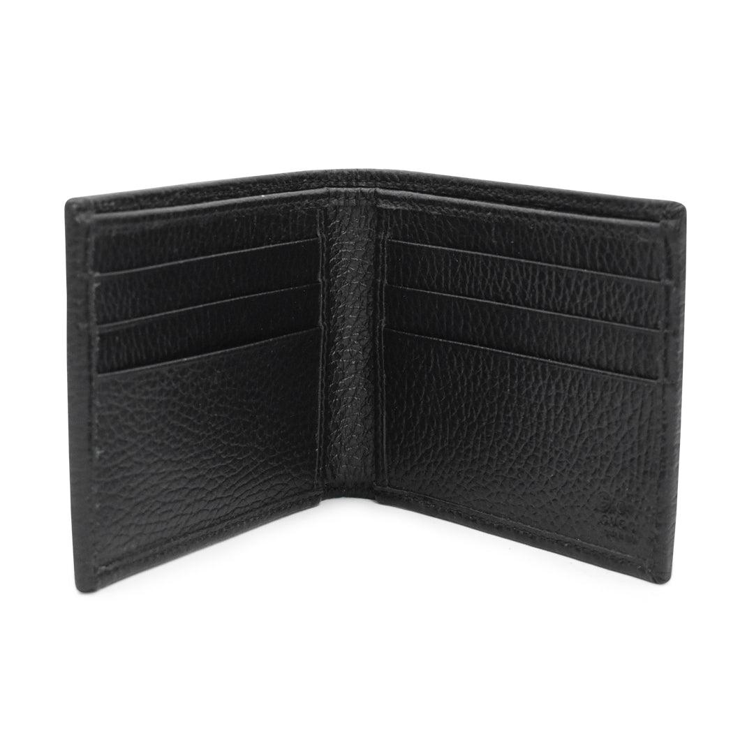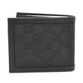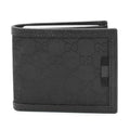 Gucci bi-fold wallet in black canvas. Features black logo monogram, black leather trim, and cash and card slots on interior.