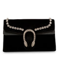 Inspired by the Greak God of wine and celebration, Dionysus. The Dionysus collection by Gucci are perfect bags to take out for special occasions. Decorated with crystal detailing and rich black velvet exteriorand the unique tiger head spur closure – exclusive to the Dionysus collection. This mini bag comes with a key chain to attach any accessory or any bag. The shoulder chain has a drop of 60 cm, perfect for cross body and over the shoulder use. Style this bag with a Gucci T shirt and jeans for a casual look, or a dark shaded dress and heels for evening wear and partying.