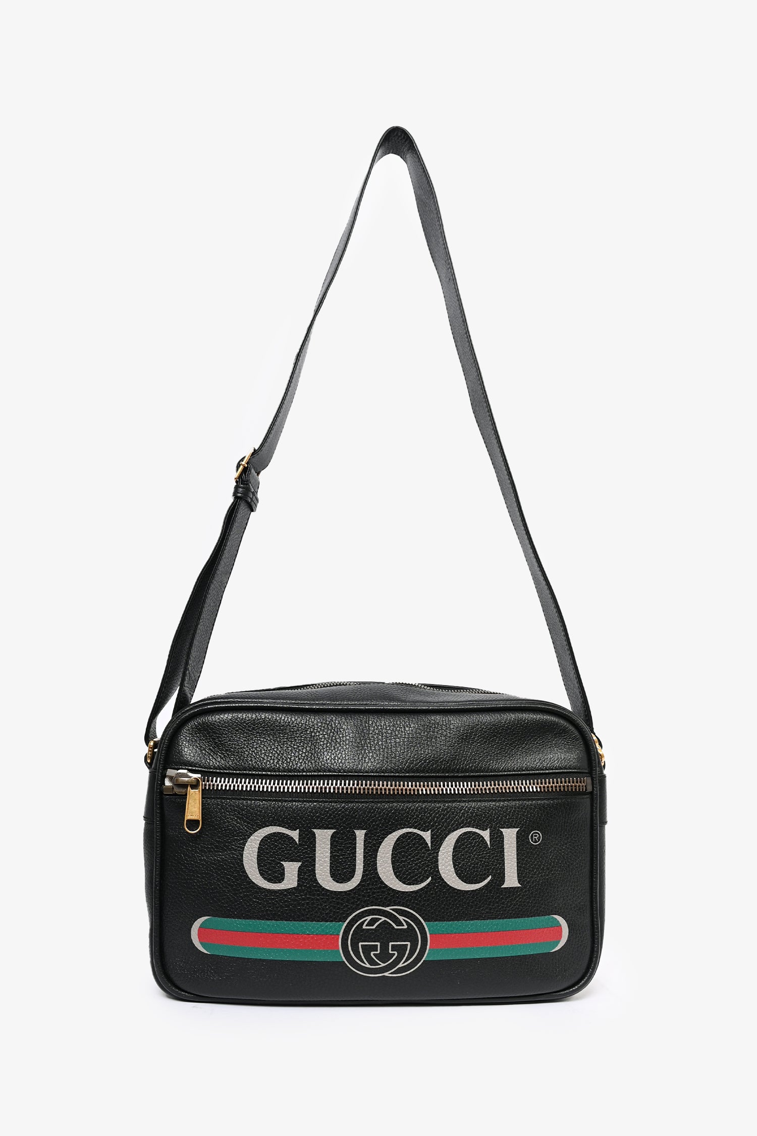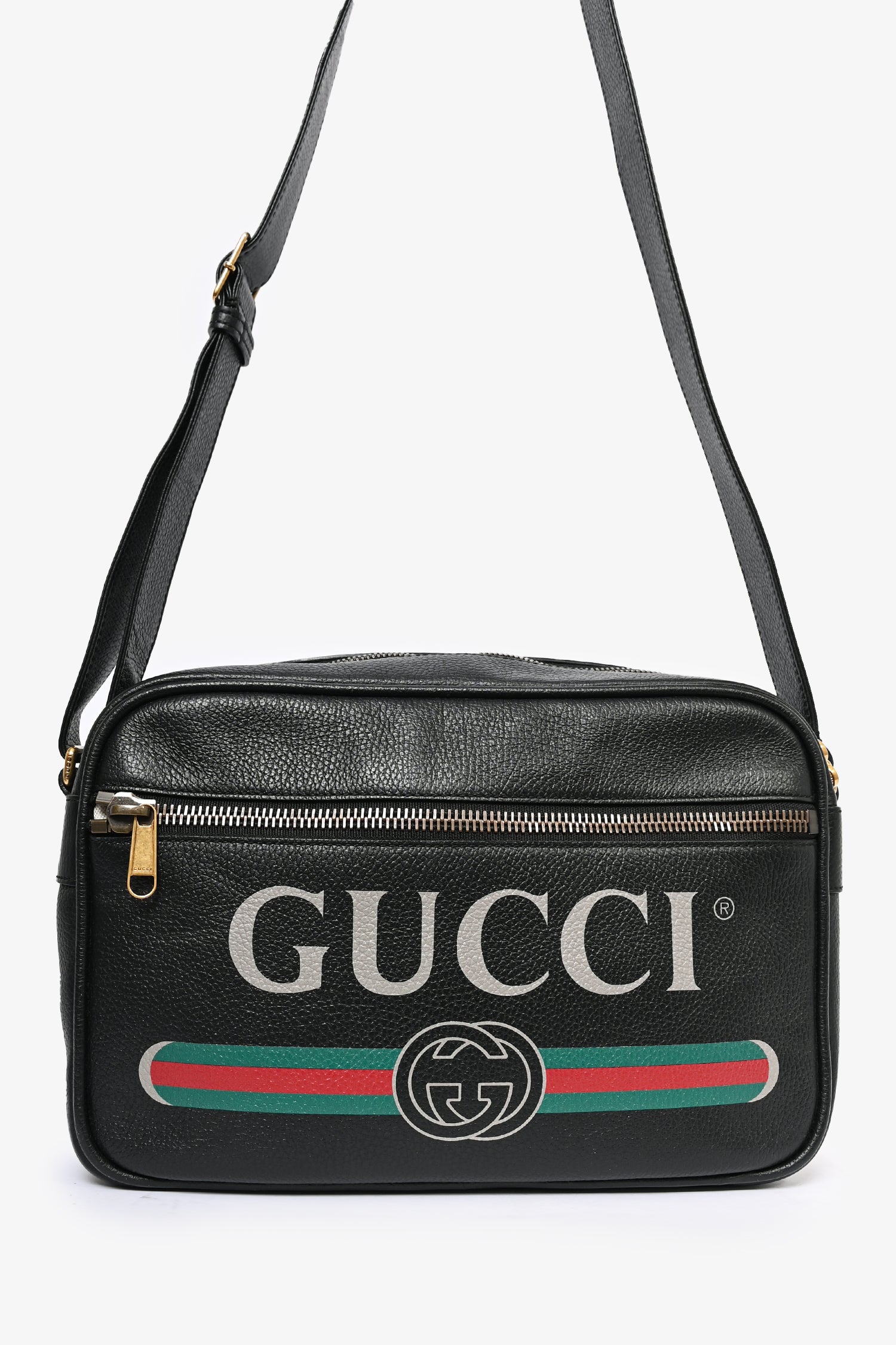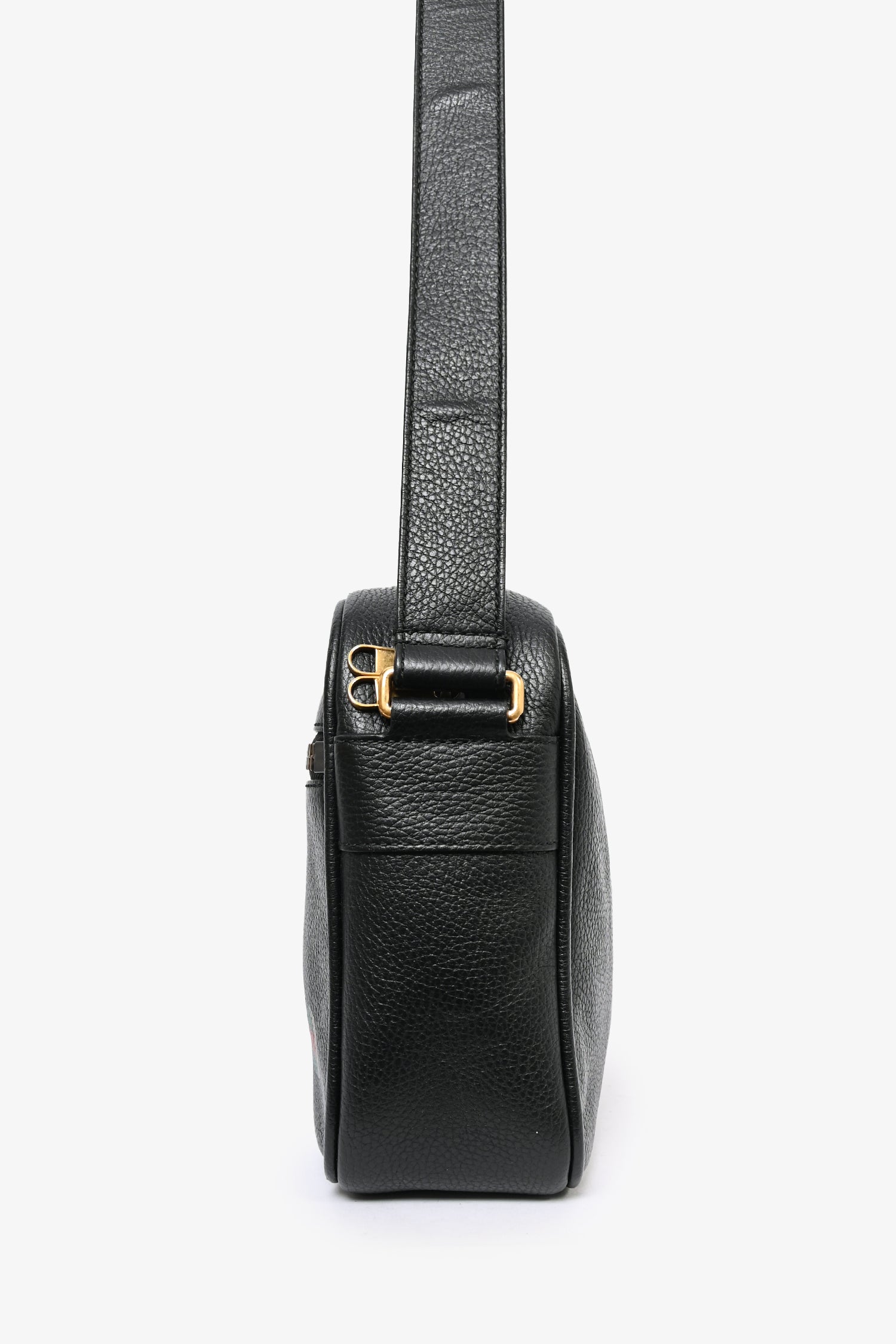 Gucci Black Leather Logo Messenger Bag. Front zip pocket. Cream textile interior lining. 3 interior wall pockets; 2 slip and 1 with zip closure. Adjustable strap. Gold-tone hardware.
