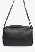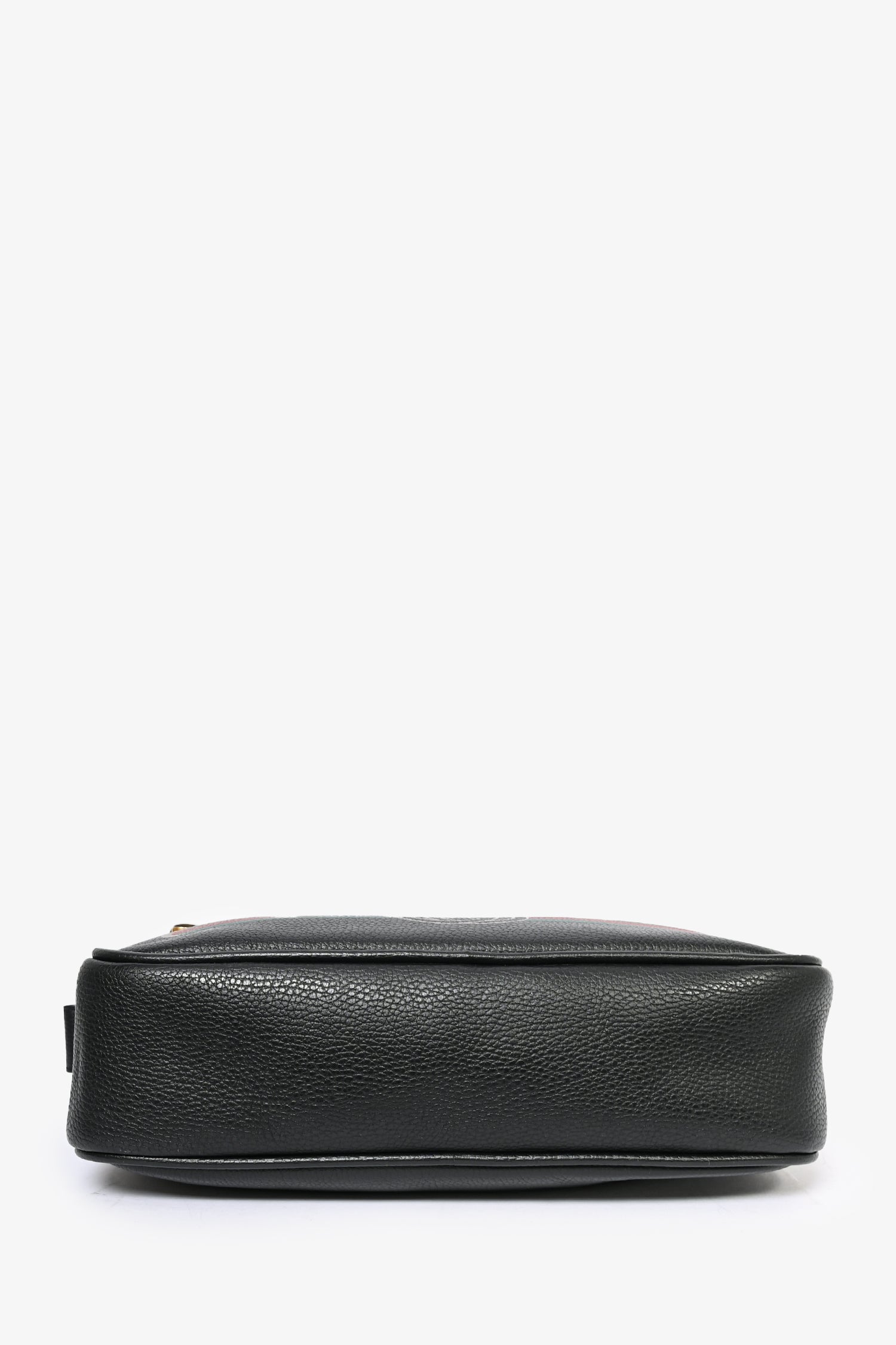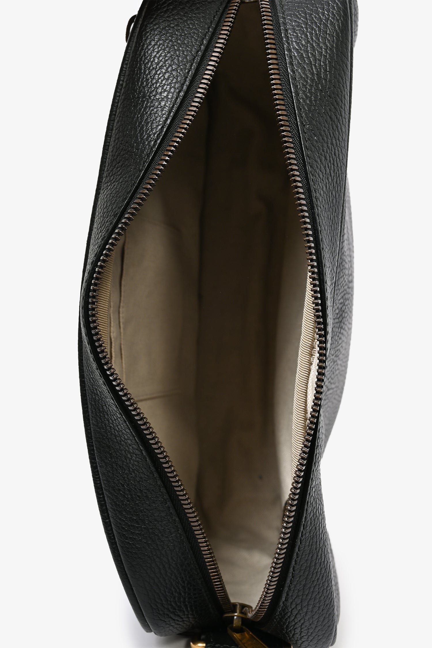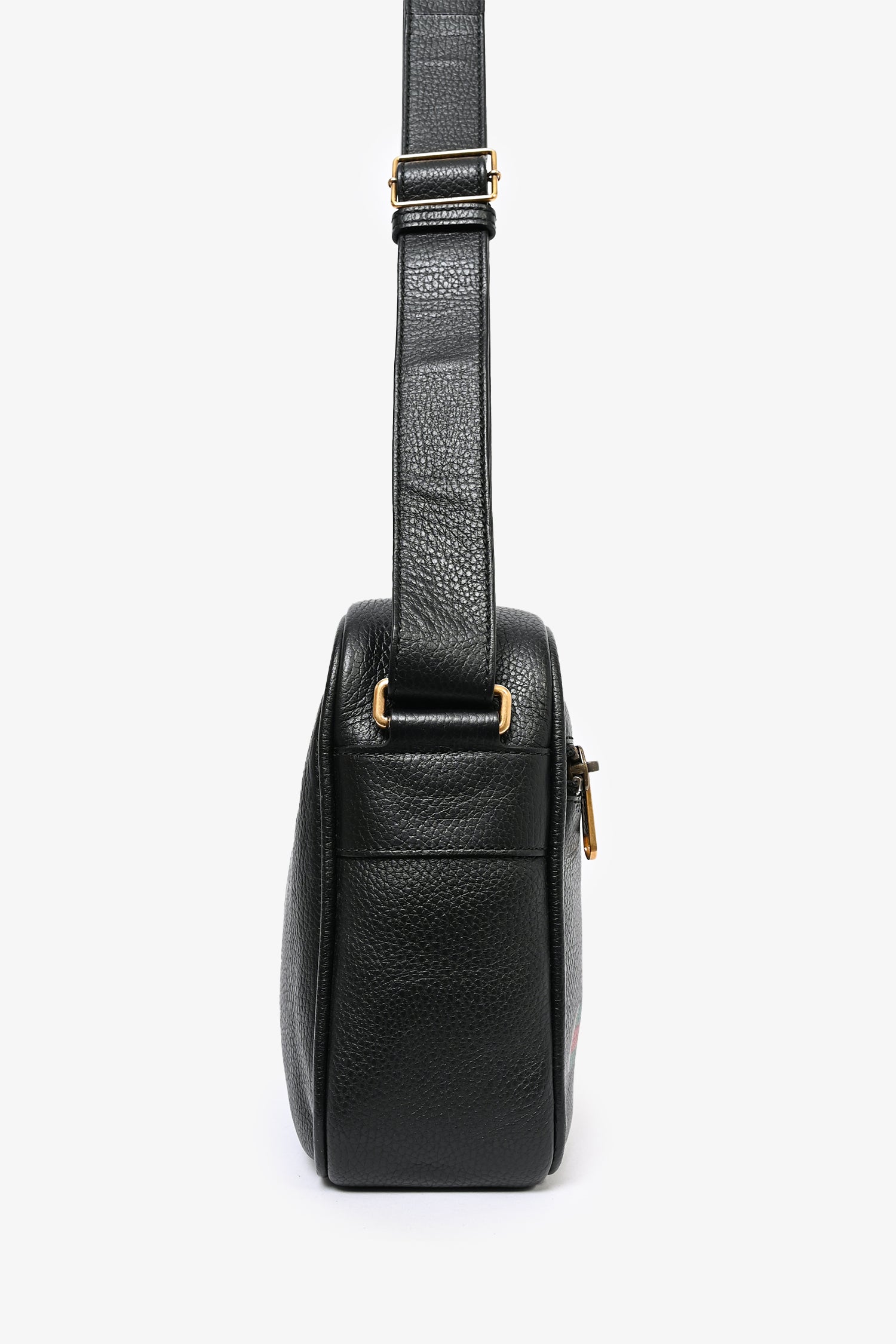 Gucci Black Leather Logo Messenger Bag. Front zip pocket. Cream textile interior lining. 3 interior wall pockets; 2 slip and 1 with zip closure. Adjustable strap. Gold-tone hardware.