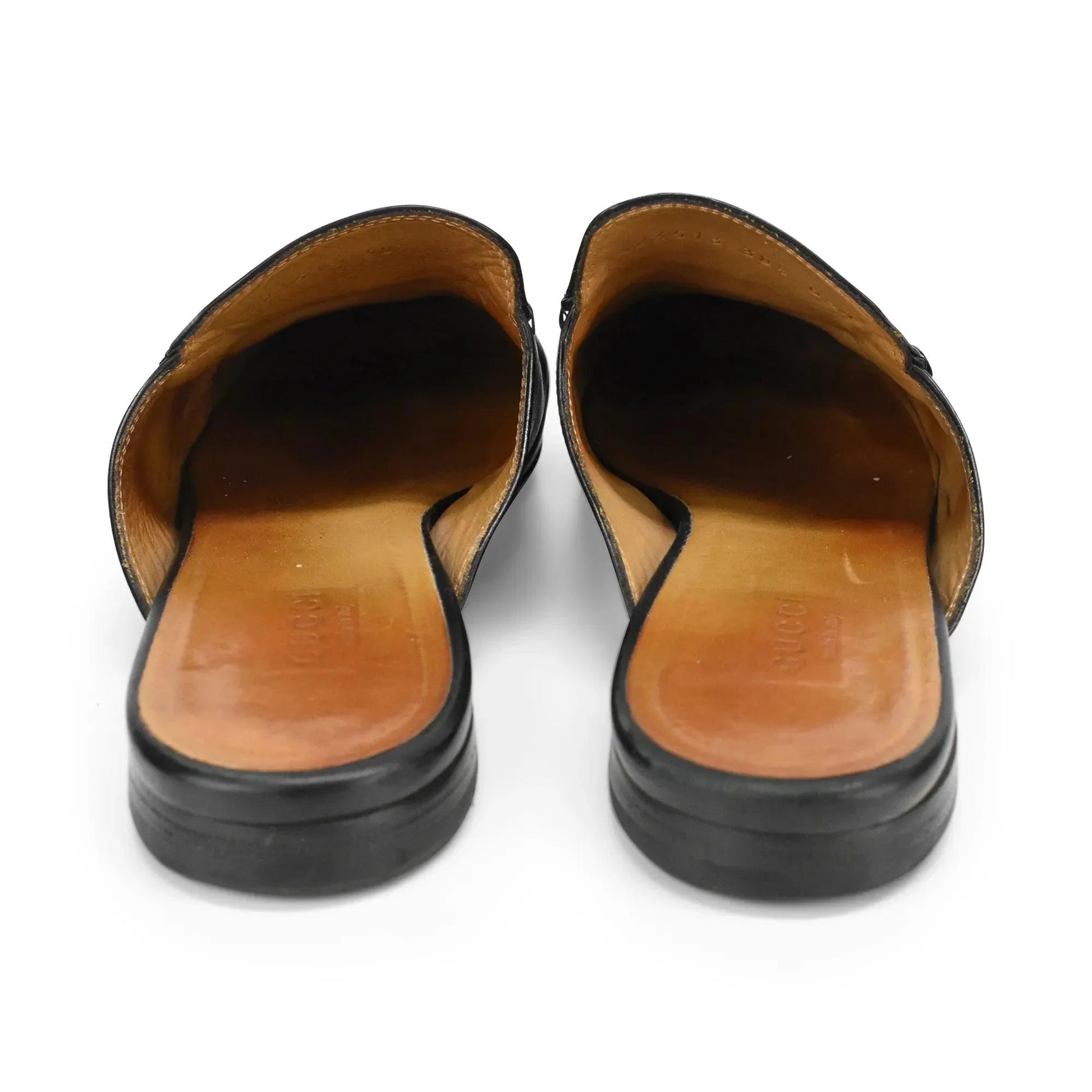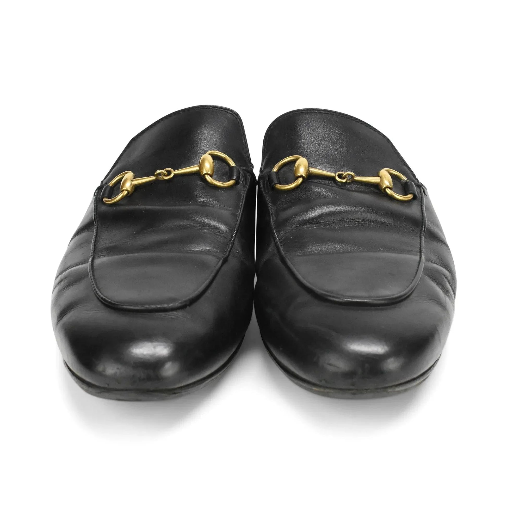 Gucci 'Princetown' Slip-one Mules in black leather with a rounded toe and a gold-toned horse-bit detail. Features a Vibram resole.