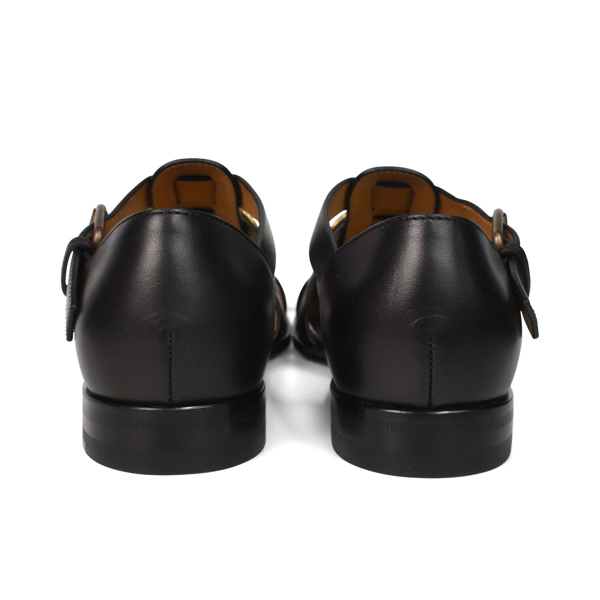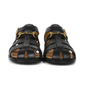 Gucci sandals in black leather with a rib cage strap design, a horse bit detail on the toe, and a buckle closure in gold hardware.