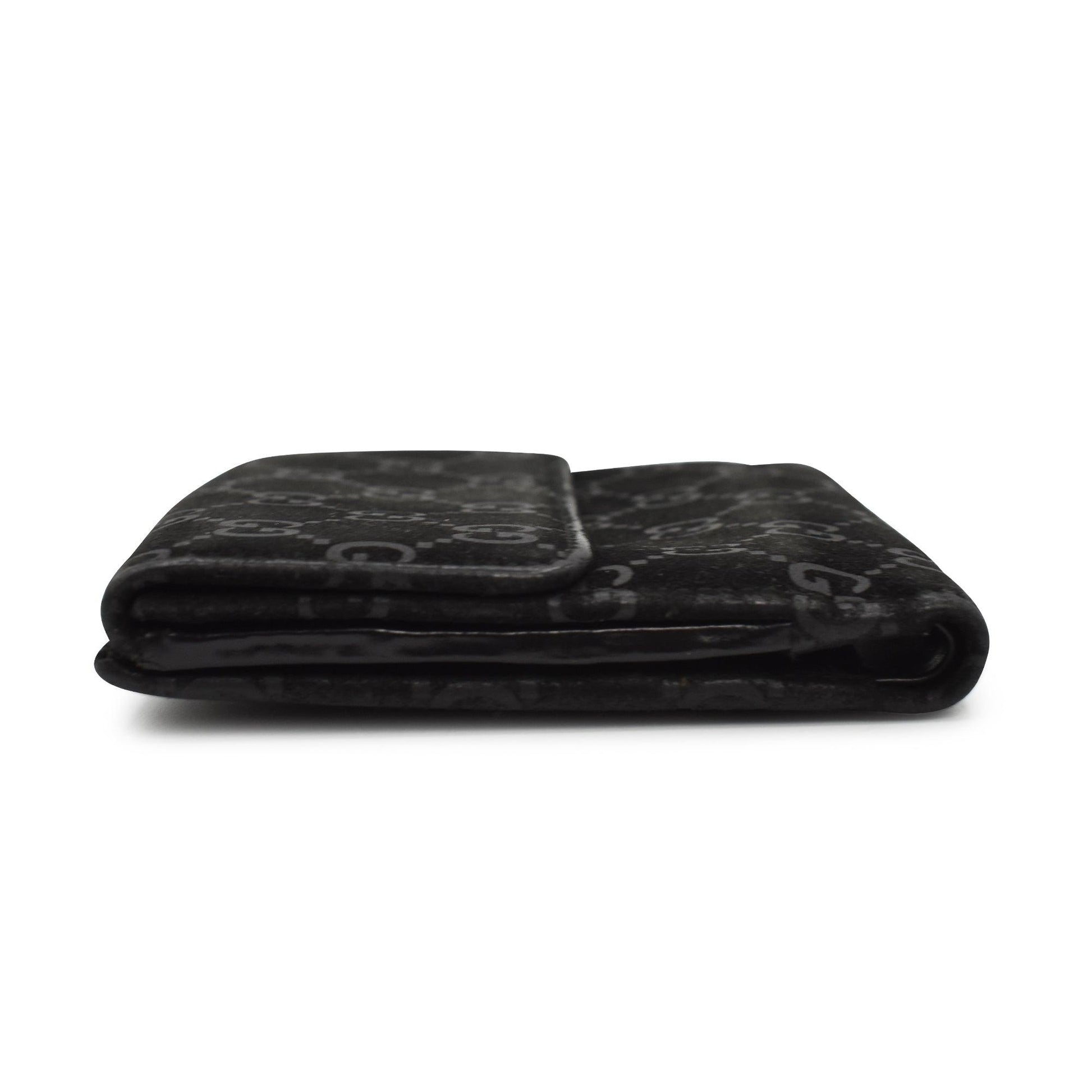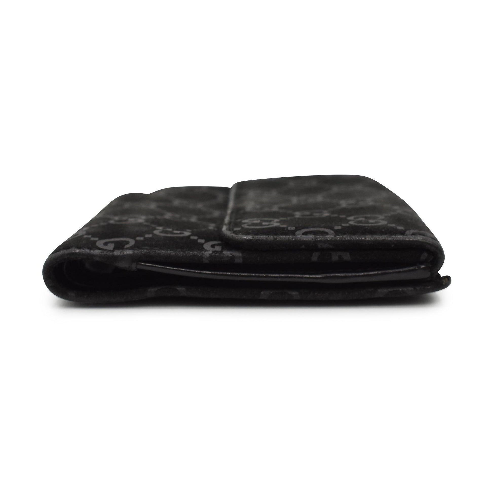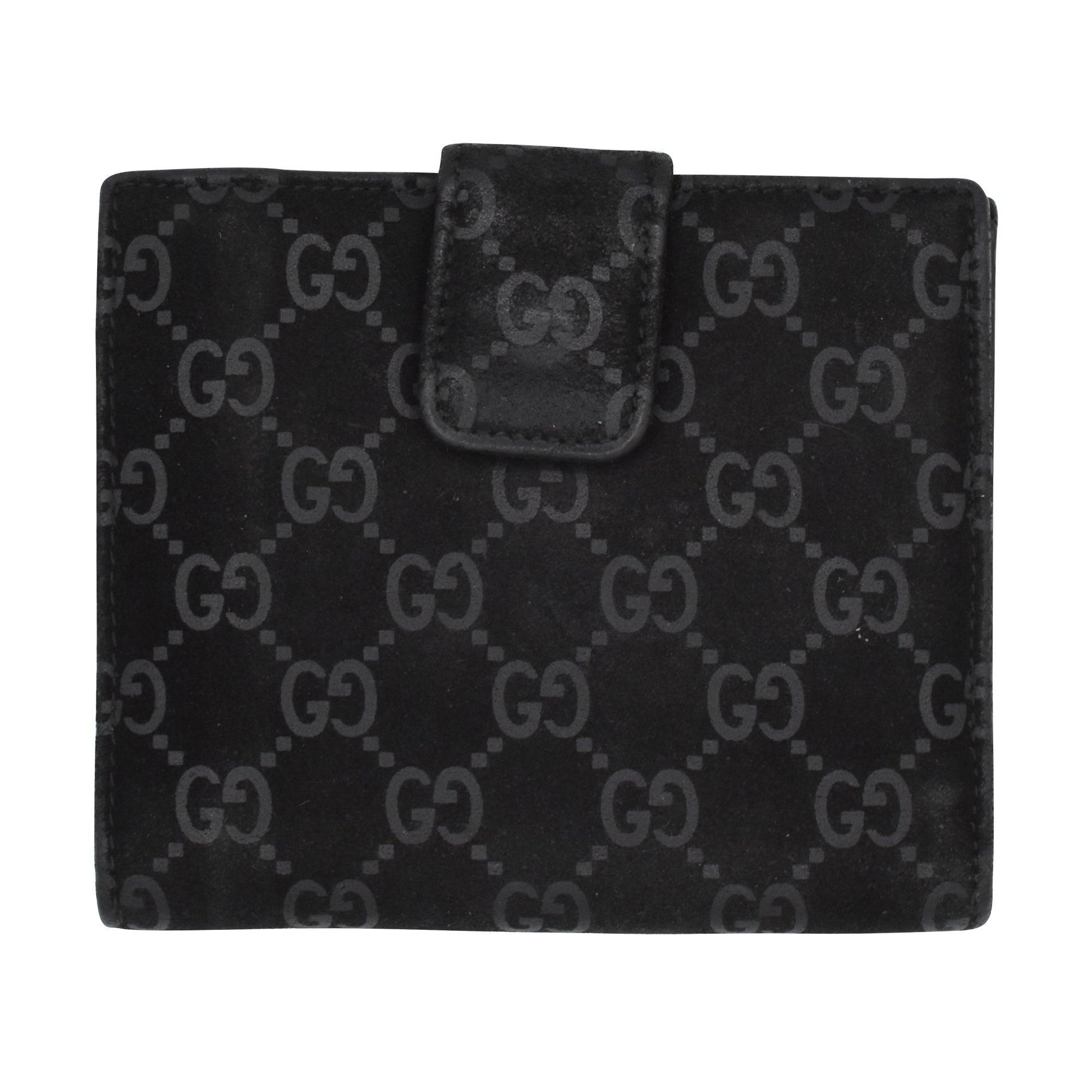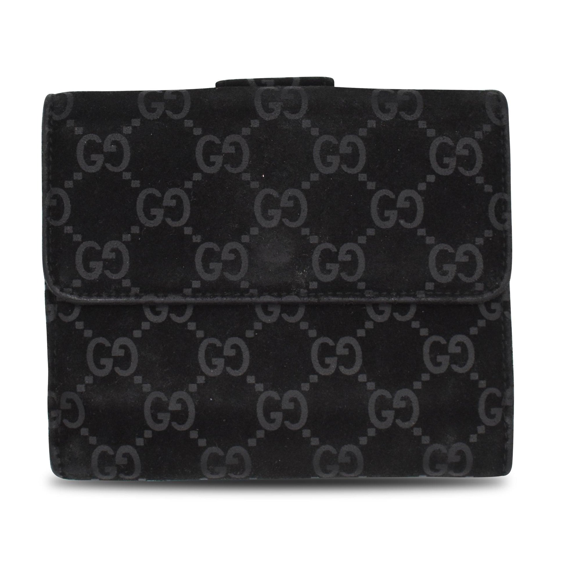 Gucci Snap Wallet in GG monogram black suede leather with a front flap pocket and back snap closure with multiple card slots.