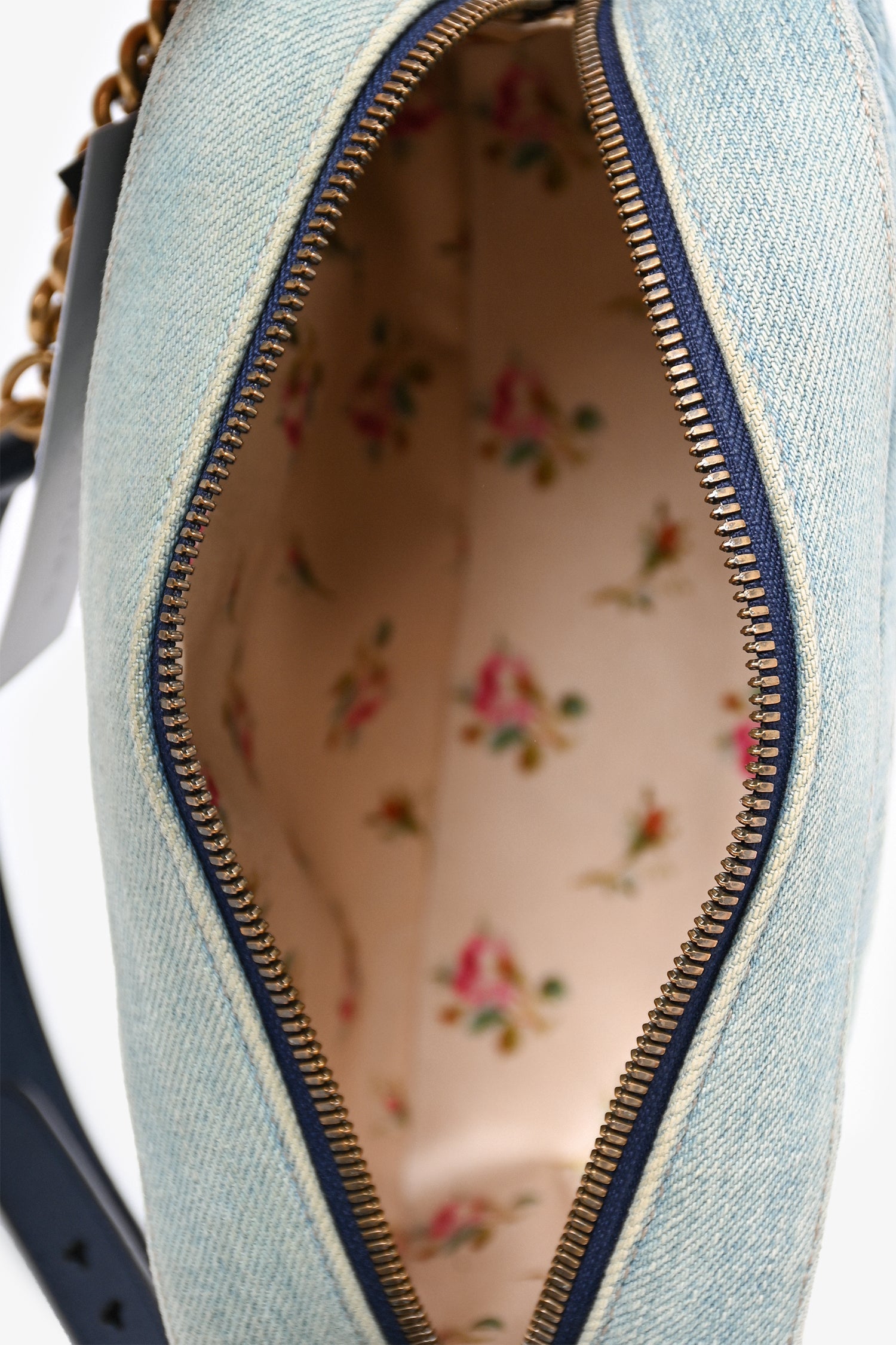 Gucci Blue Denim Pearly GG Small Marmont Camera Bag. Zip up closure. Single open compartment with a wall slip pocket. Lined with floral satin. Gold-tone hardware. Adjustable cross body trap. Tonal stitching.