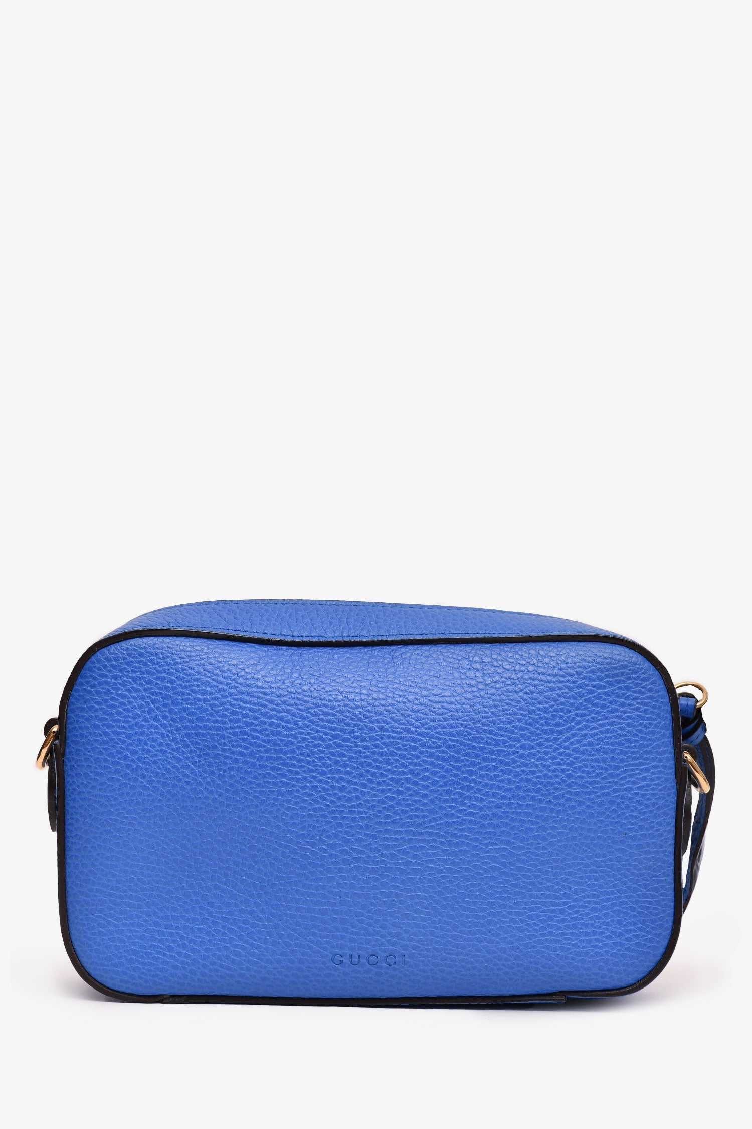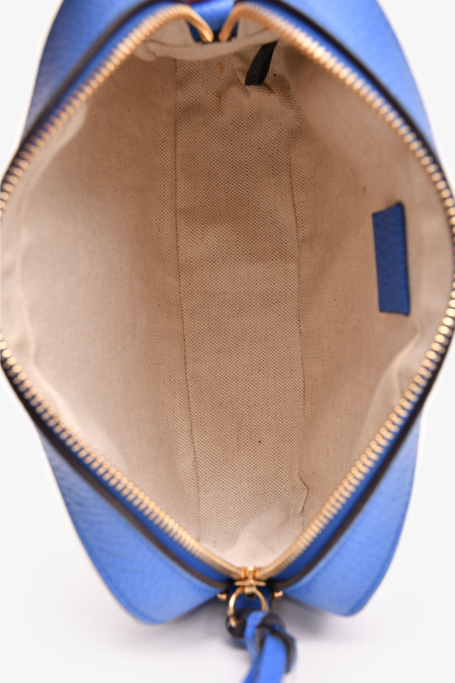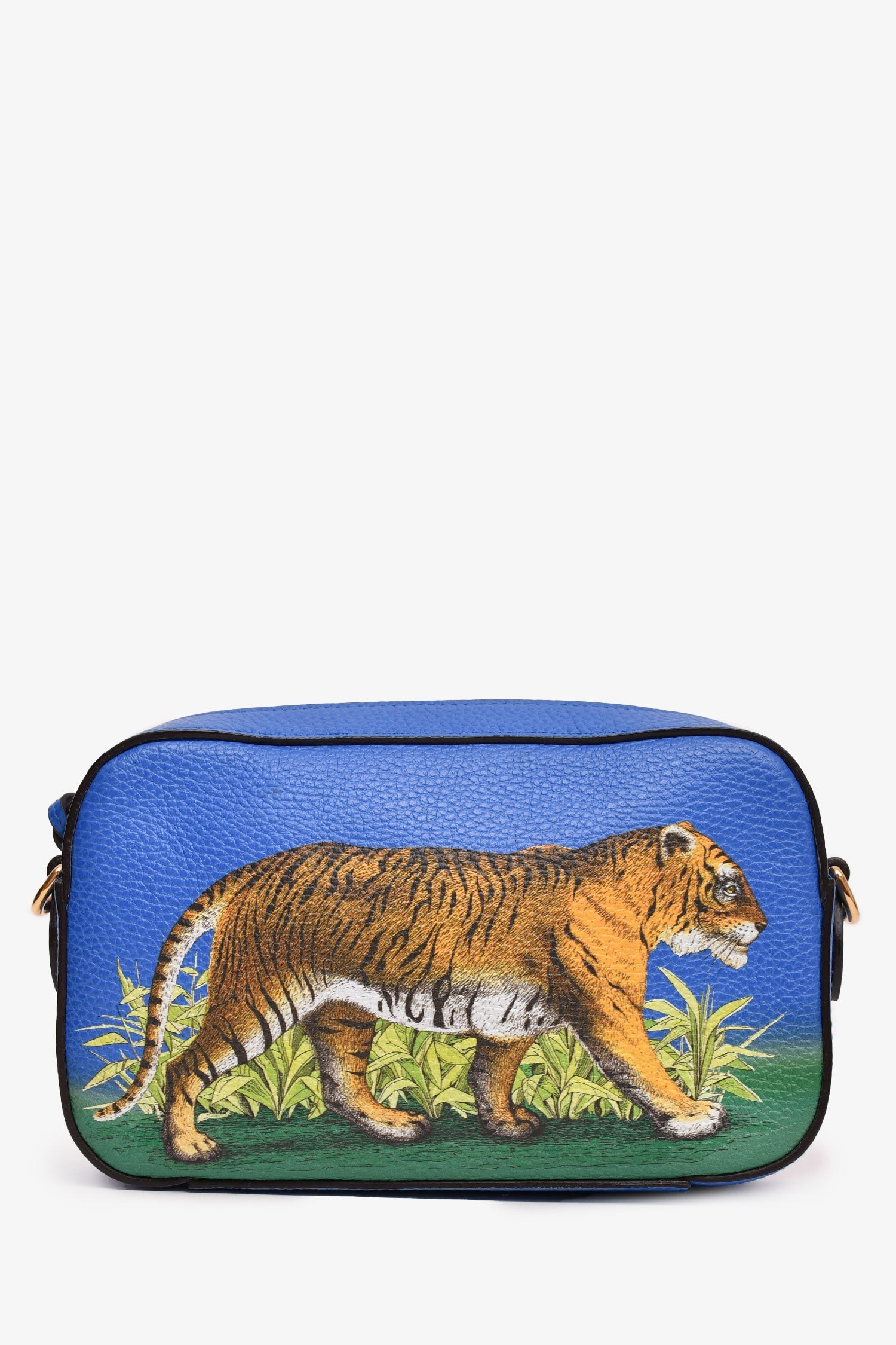 Gucci Blue Grained Leather Tiger Painted Web Strap Sylvie Crossbody. Top zip closure. Cream linen interior lining. Open interior. Gold-tone hardware. Removable strap (non-adjustable)
