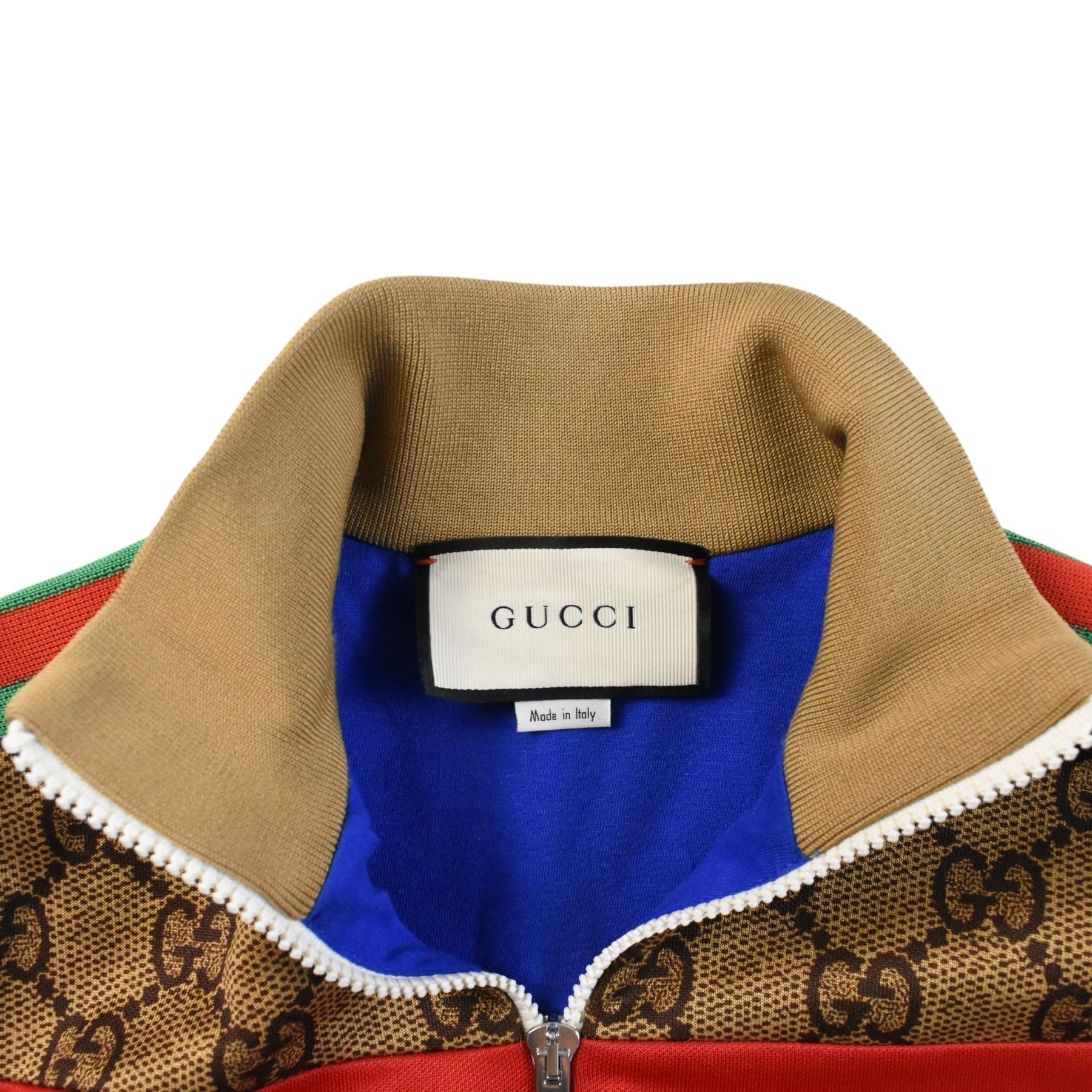 Gucci Track Jacket in brown monogram sleeve panels, web stripe trim on the sleeves with blue, white and red striped front panel. Features a rubber Gucci logo on the chest, ribbed elastic waistband, and a zip closure in white.