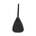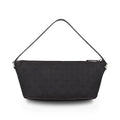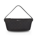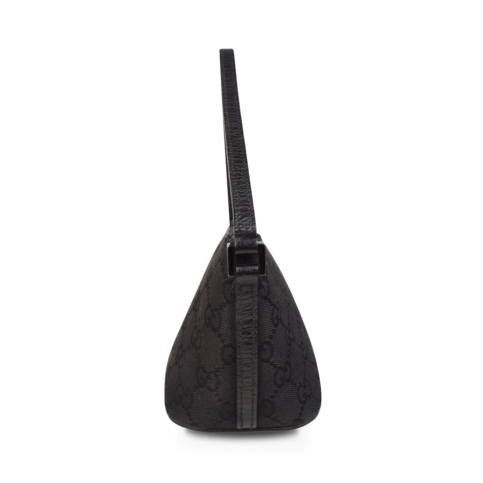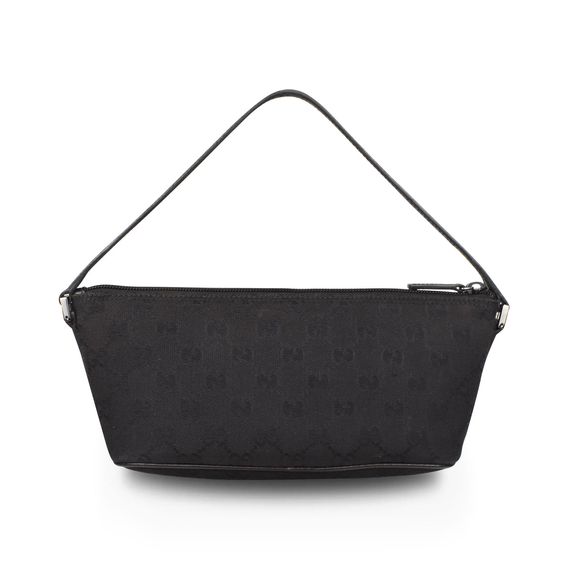 Gucci 'Boat Pochette' shoulder bag in black guccissima monogram printed coated canvas with black leather trim, a shoulder strap, a top zip opening in black hardware, and a canvas lined interior.