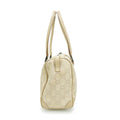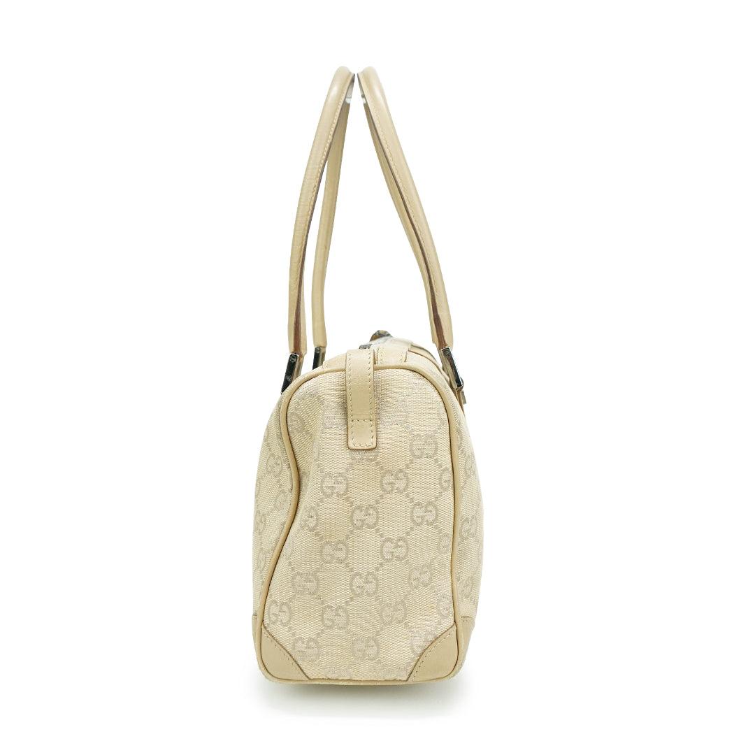 Gucci boston shoulder bag in beige monogram canvas with leather trim and handles. Features silver hardware, top zipper-closure, and a zipper-pull that clicks onto side of bag when closed. The interior is canvas lined with zip-pocket.