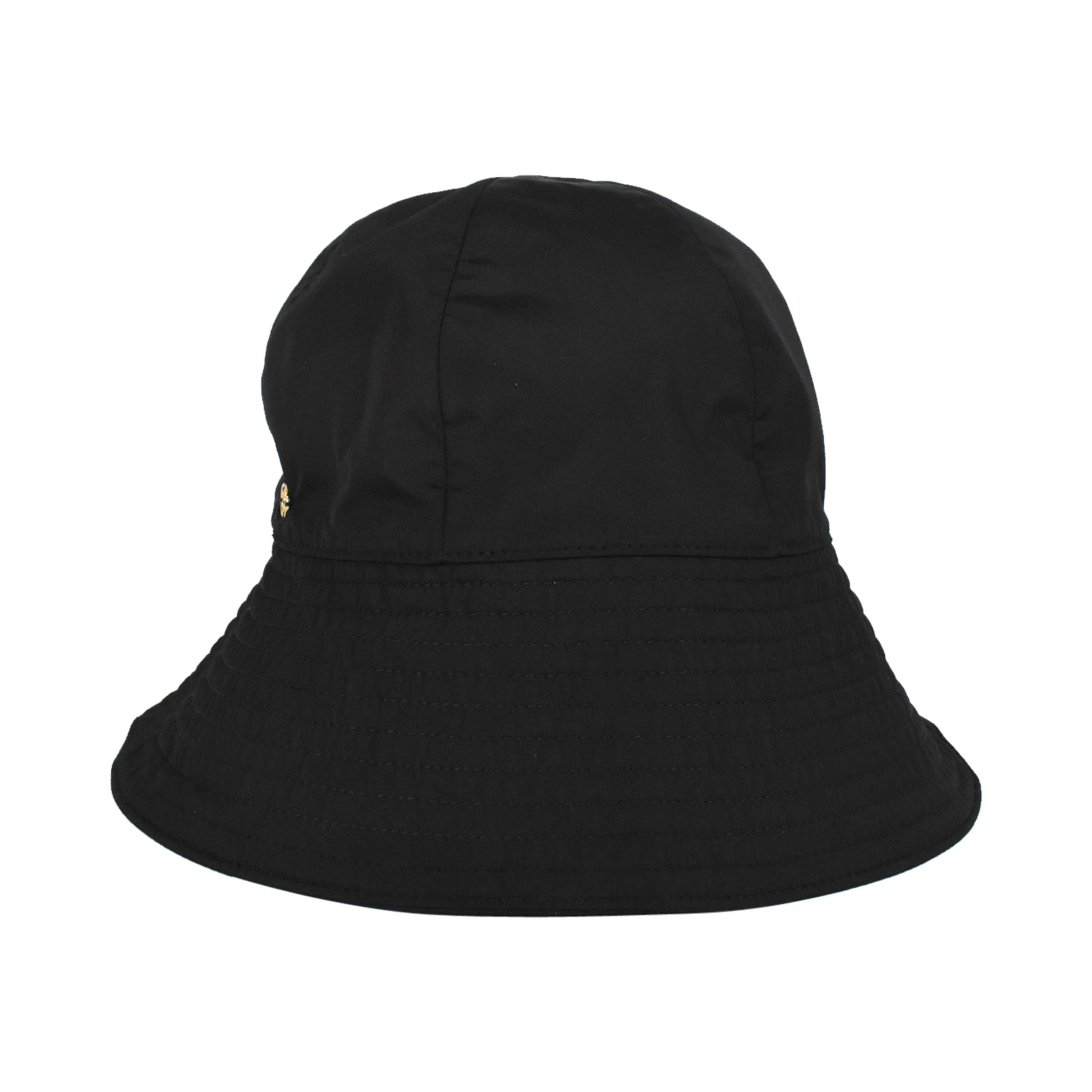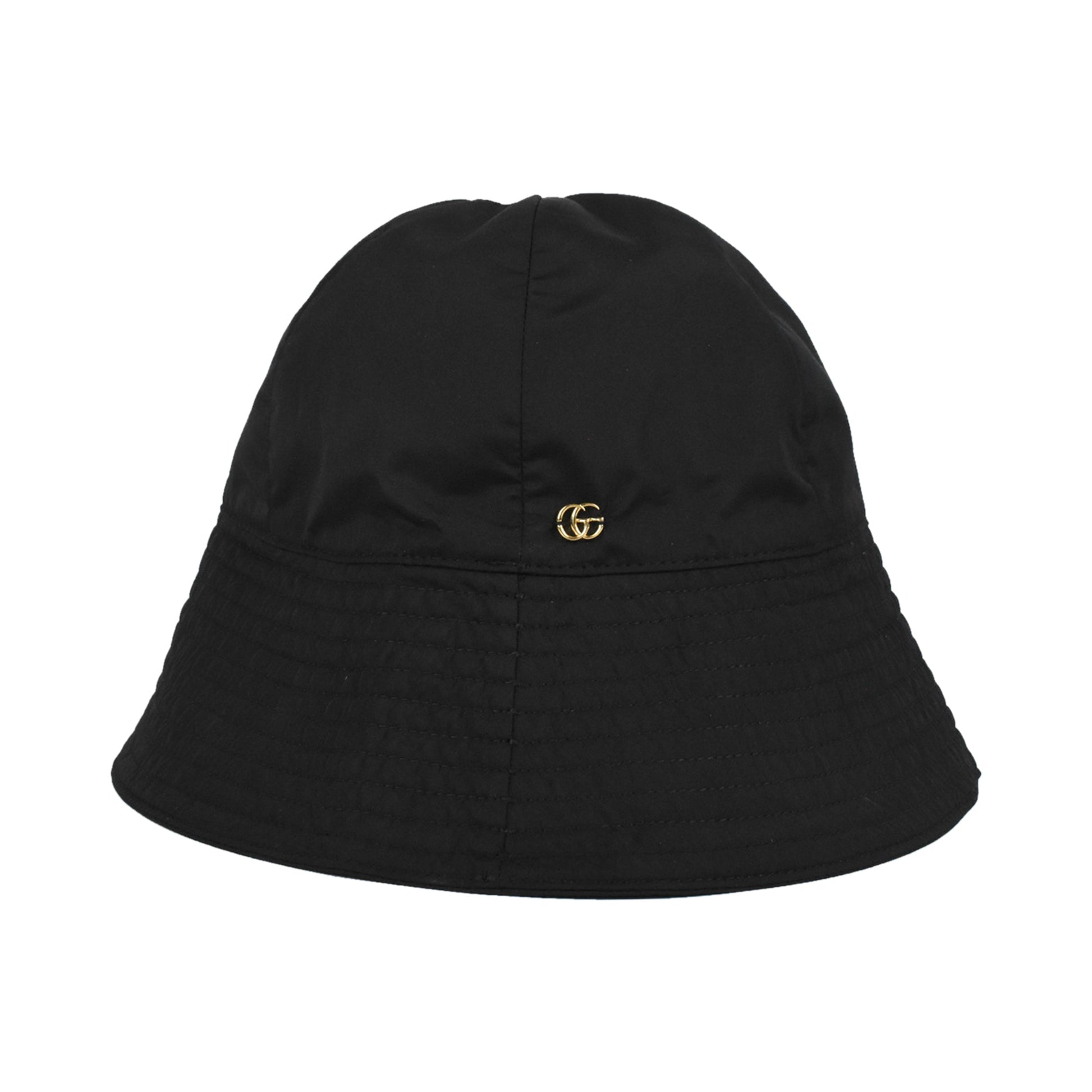 Gucci bucket hat in black nylon with a small 'GG' marmont emblem in gold metal hardware.