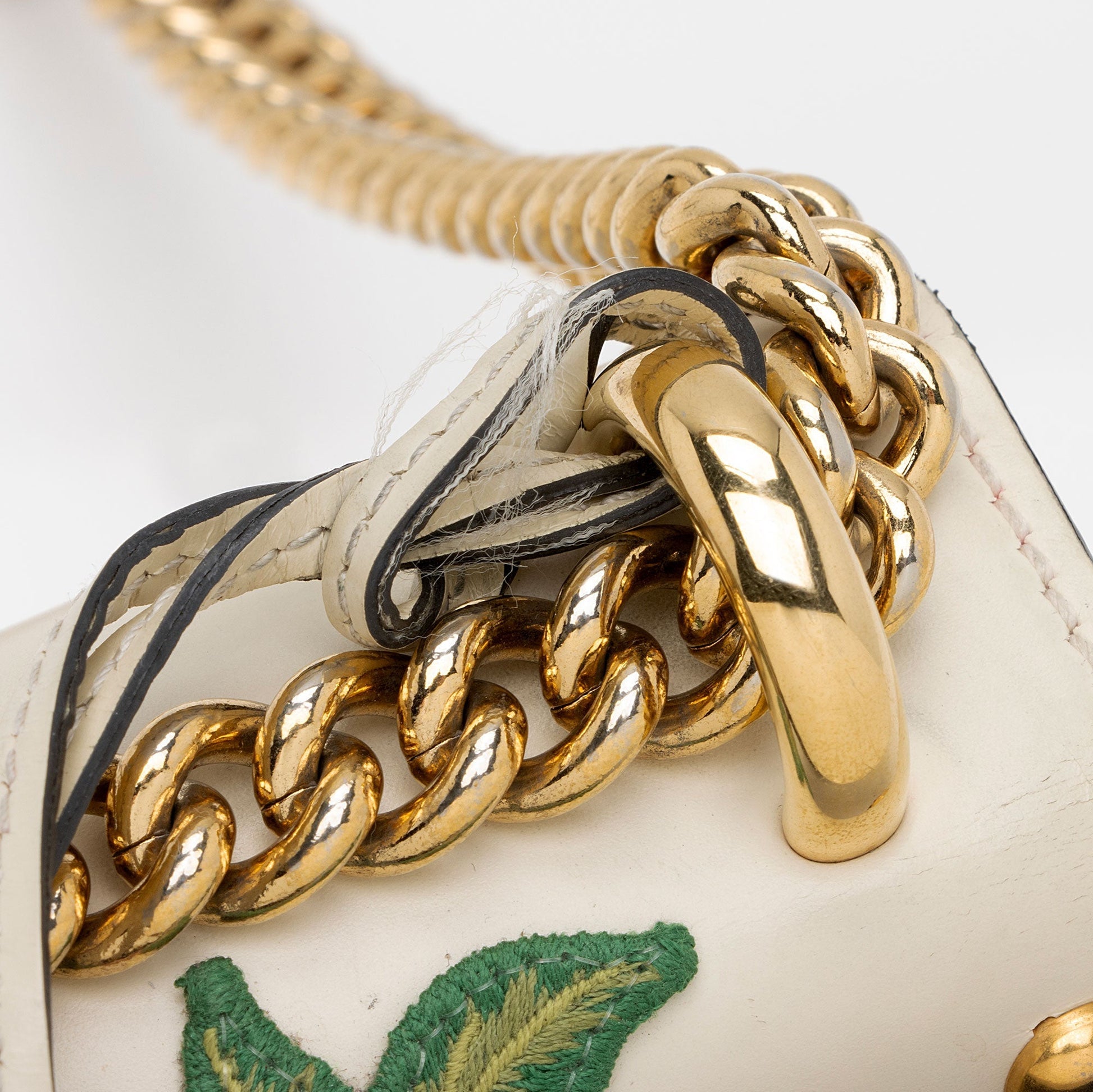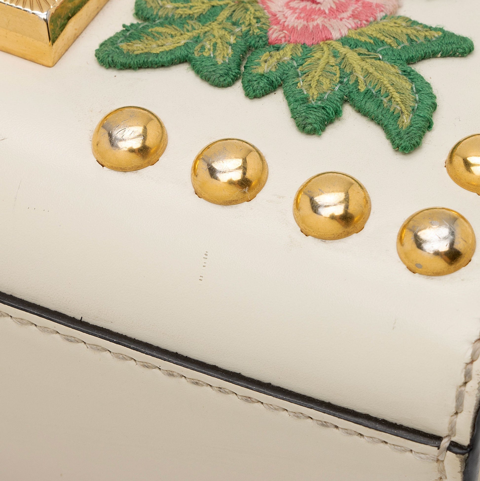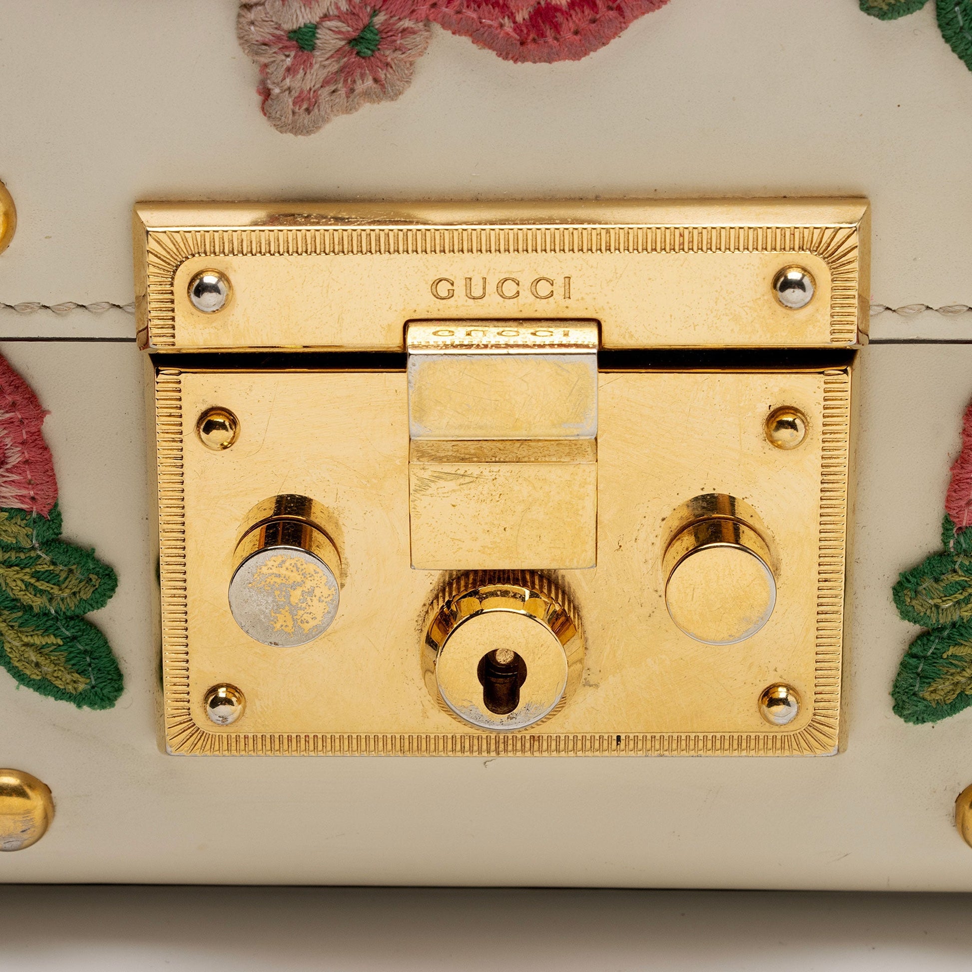 Condition Notes: Scuffs and wear to exterior bottom corners. Marks and light darkening throughout exterior calfskin. Darkening and marks to exterior embroidery. Tarnishing and visible surface scratches to closure hardware. Creasing and light wear throughout interior flap. Marks and light darkening throughout interior.