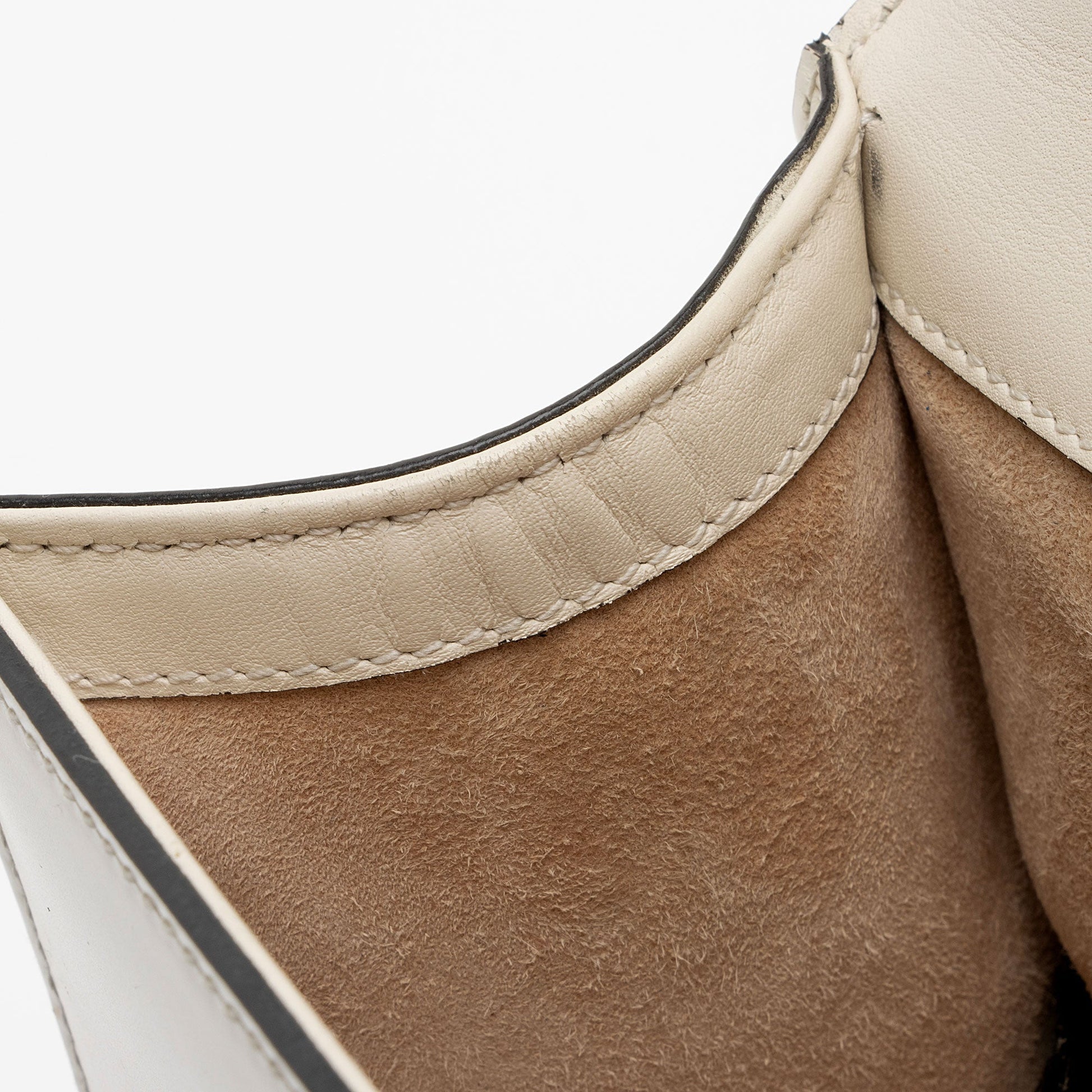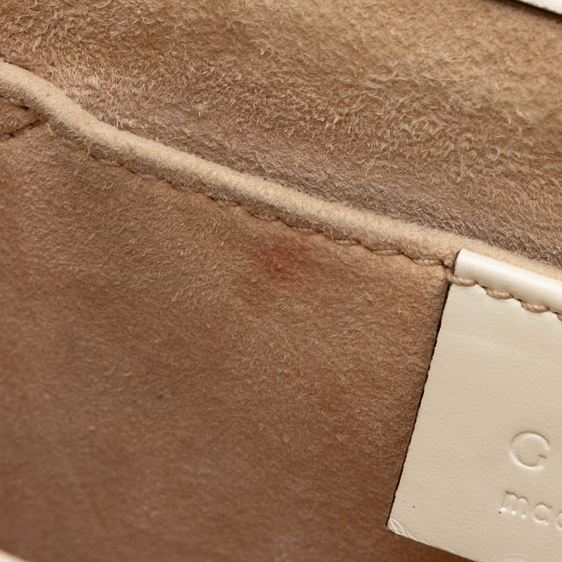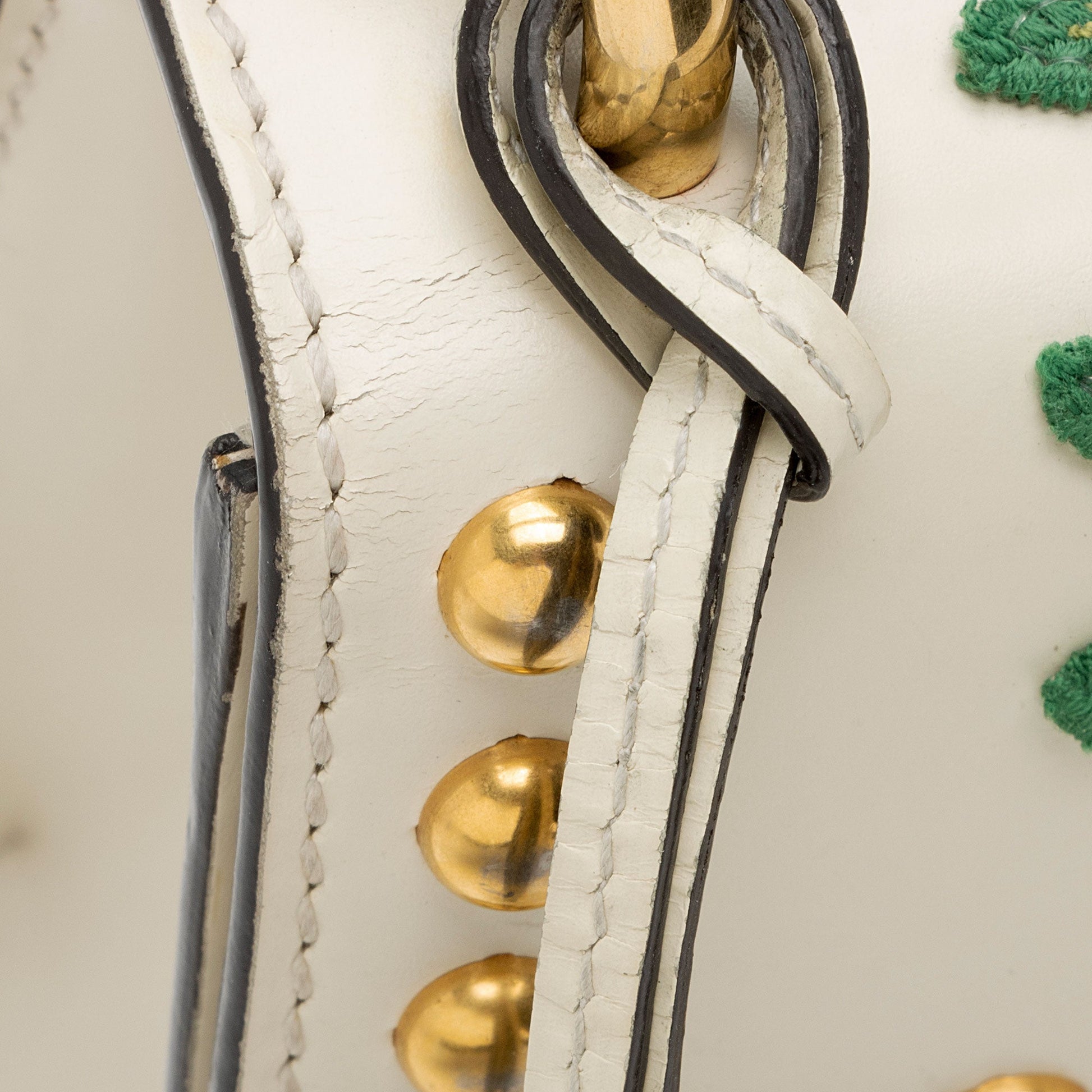 Condition Notes: Light marks and scuffs throughout exterior calfskin. Darkening and marks throughout exterior embroidery. Visible large mark to exterior base. Marks and cracking near shoulder strap bases. Moderate surface scratches and tarnishing to hardware. Marks and light darkening throughout interior.