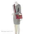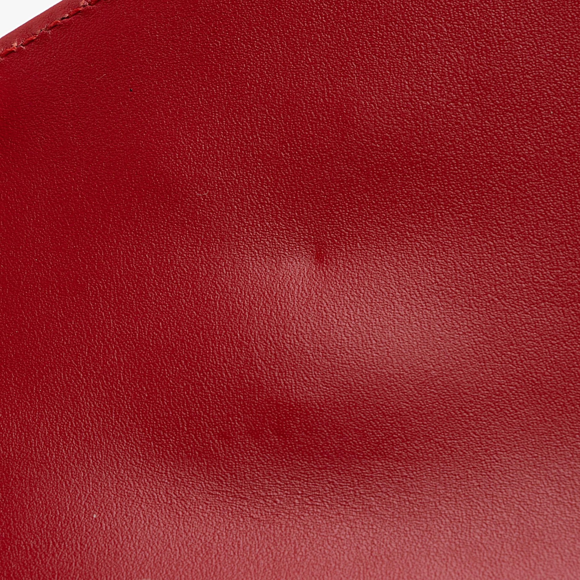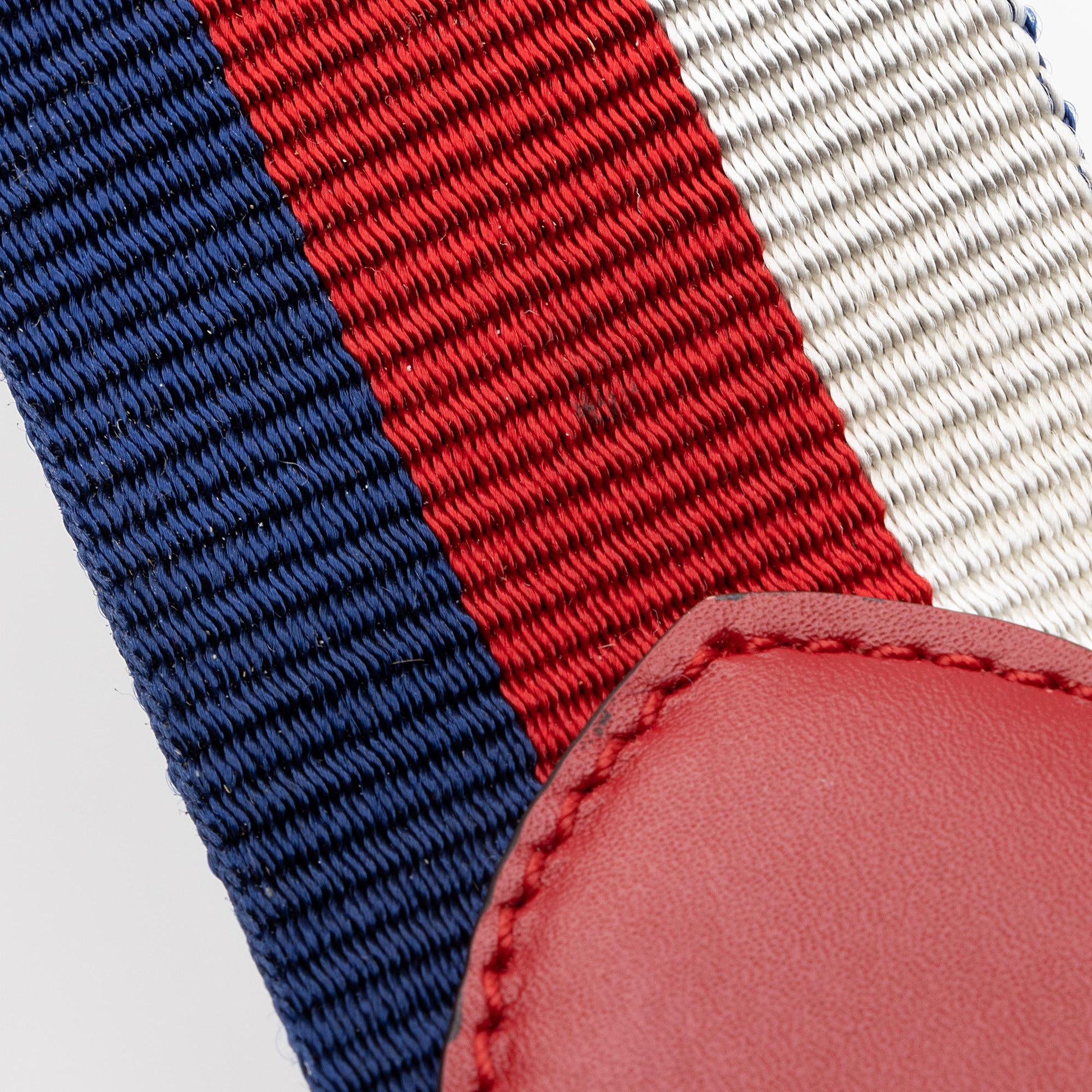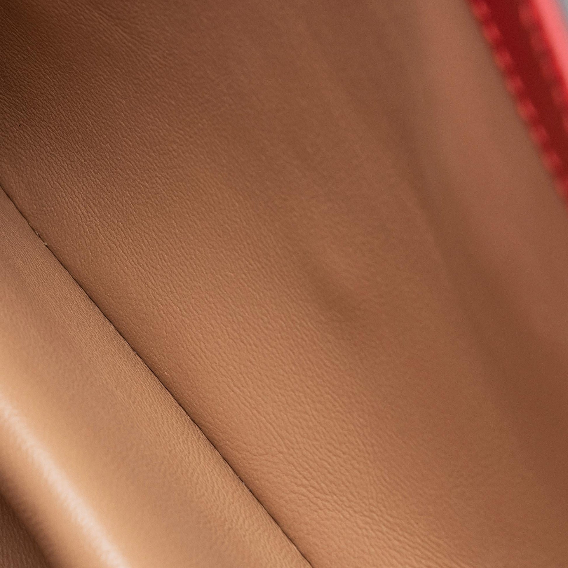 Condition Notes: Minor wear to exterior corners. Light scuffs and wear to exterior pearls. Light marks throughout white strap on shoulder strap. Light creasing throughout interior flap. Visible cut to interior tag. Light odor.