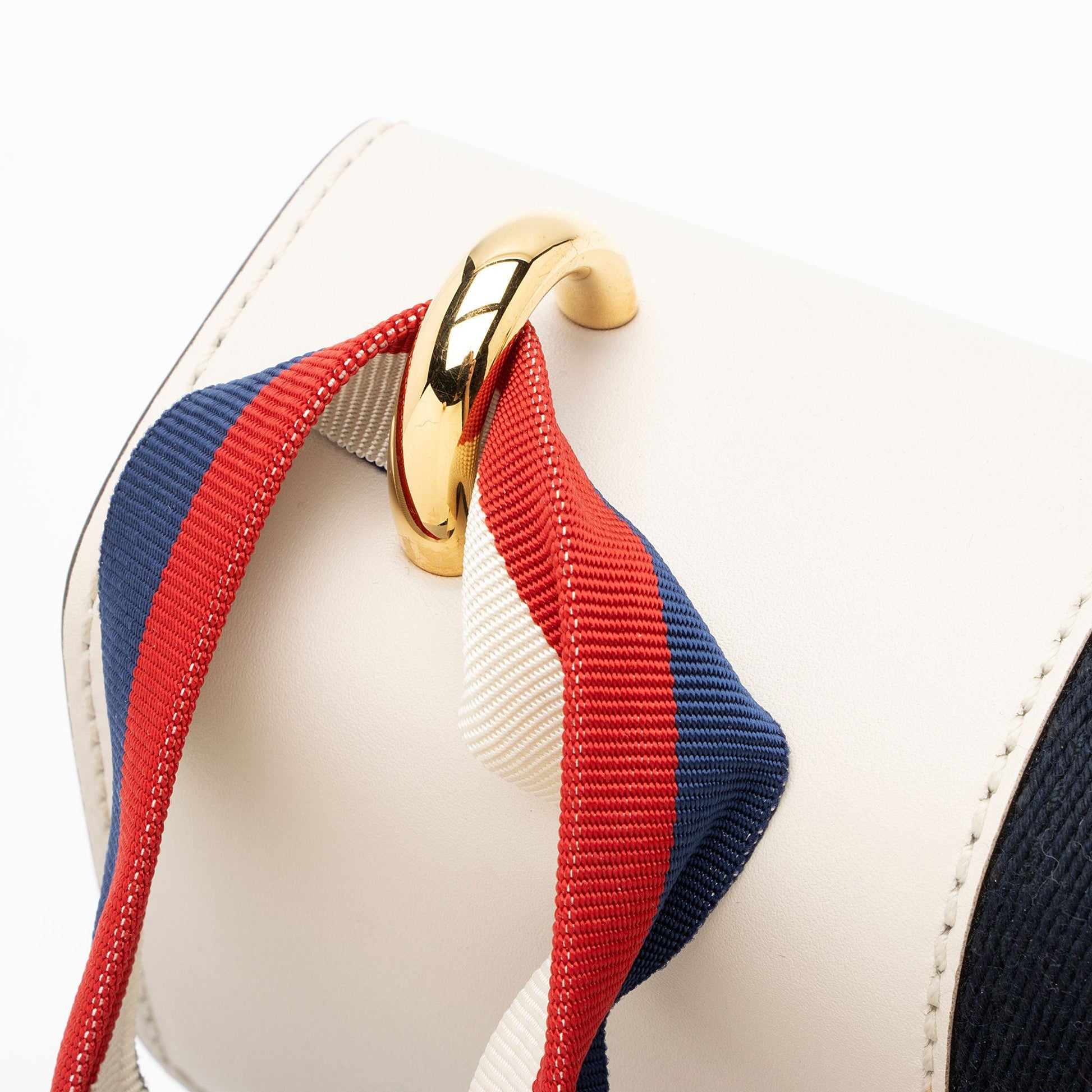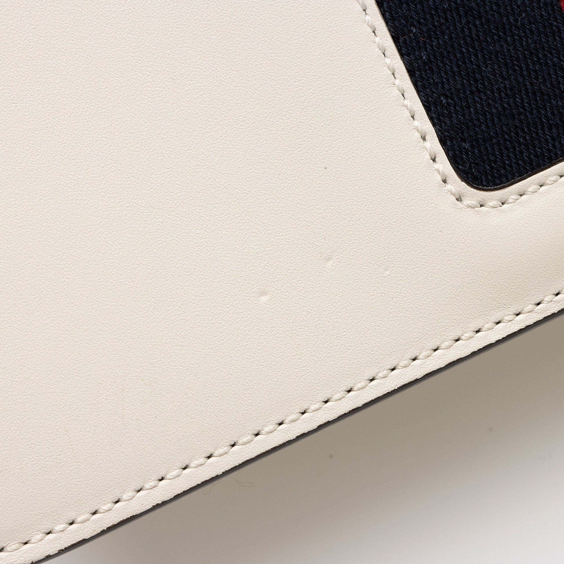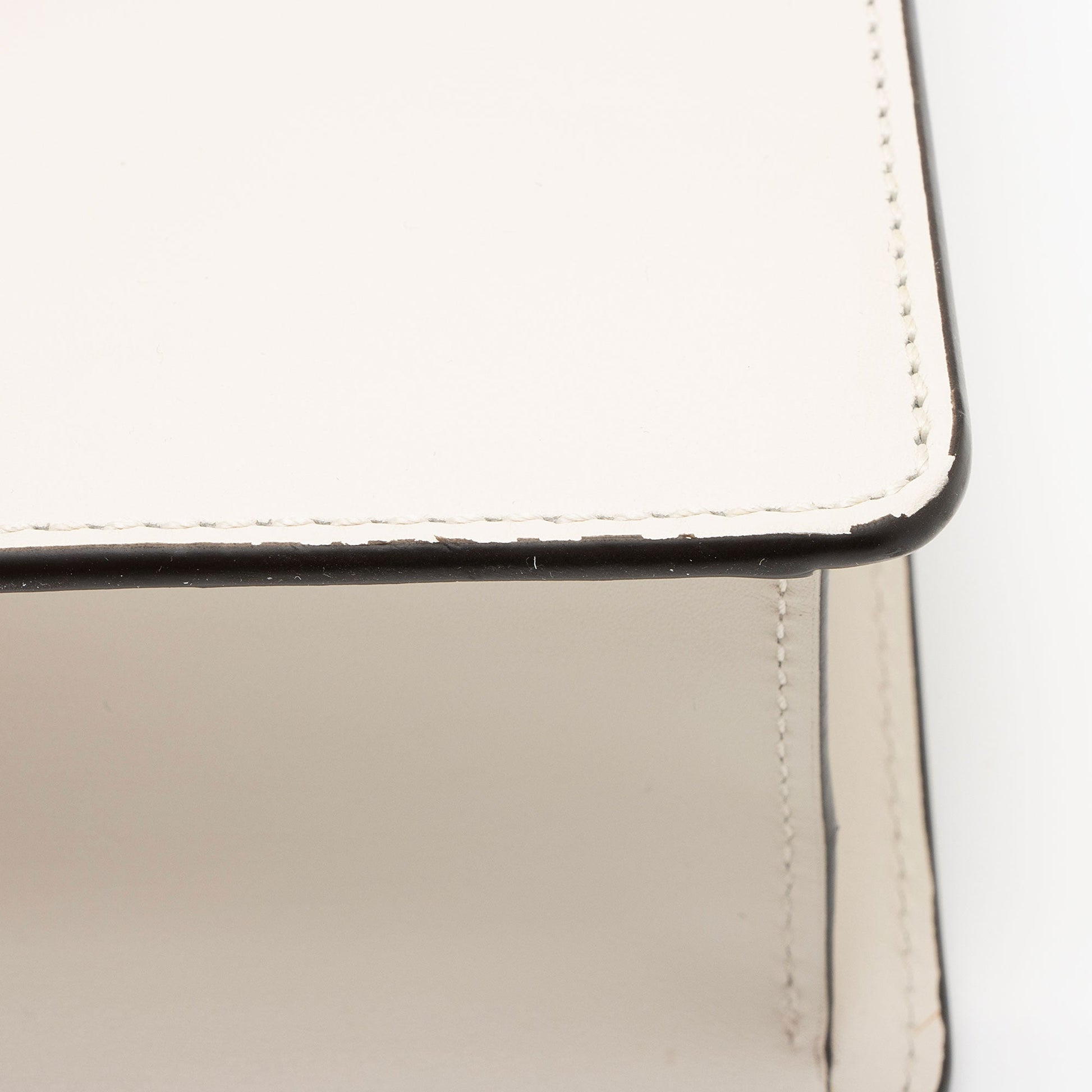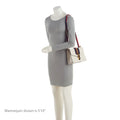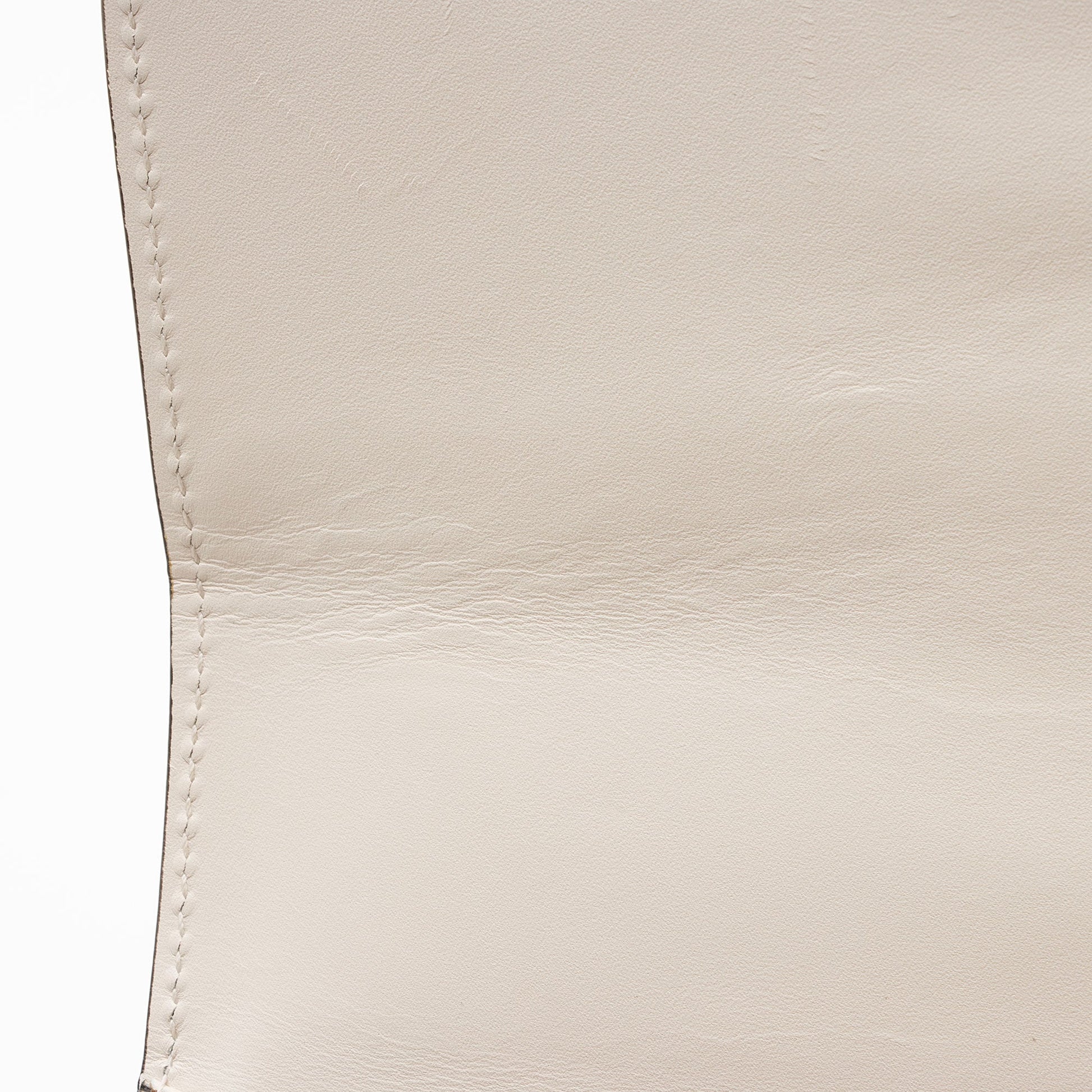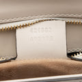 Condition Notes: Light marks and minor imprints throughout exterior. Light wear to exterior bottom corners. Creasing throughout ribbon handle. Surface scratches to hardware. Creasing throughout interior flap. Missing detachable leather shoulder strap.