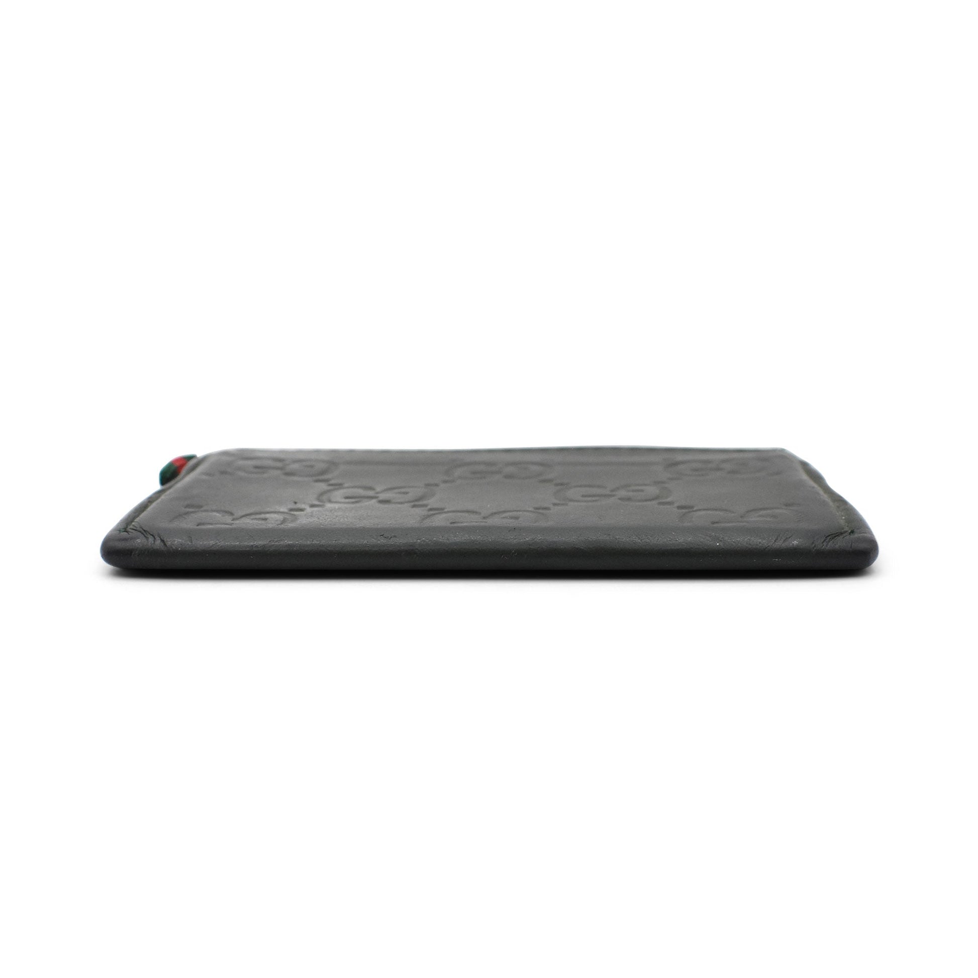 Gucci 'Guccissima' card holder in green logo monogram embossed leather with multiple card slots and canvas racing stripe tab on the side.