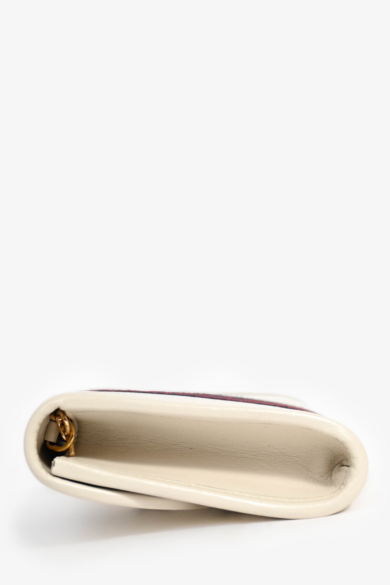 Gucci Cream Leather Web Mini Rajah Clutch. Fold-over flap with a snap closure. Gold and silver-tone hardware with embellishments. Chain-link strap. Lined interior with 2 card pockets. Tonal stitching.